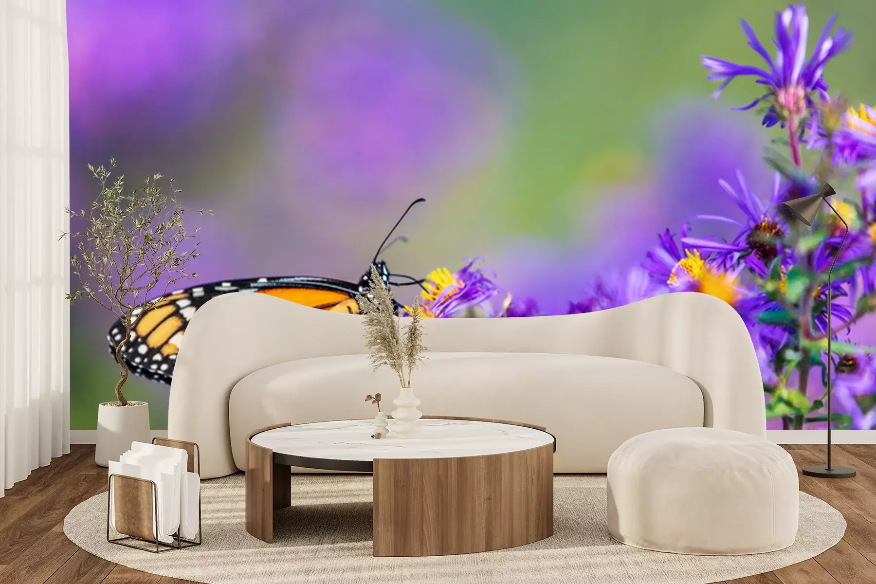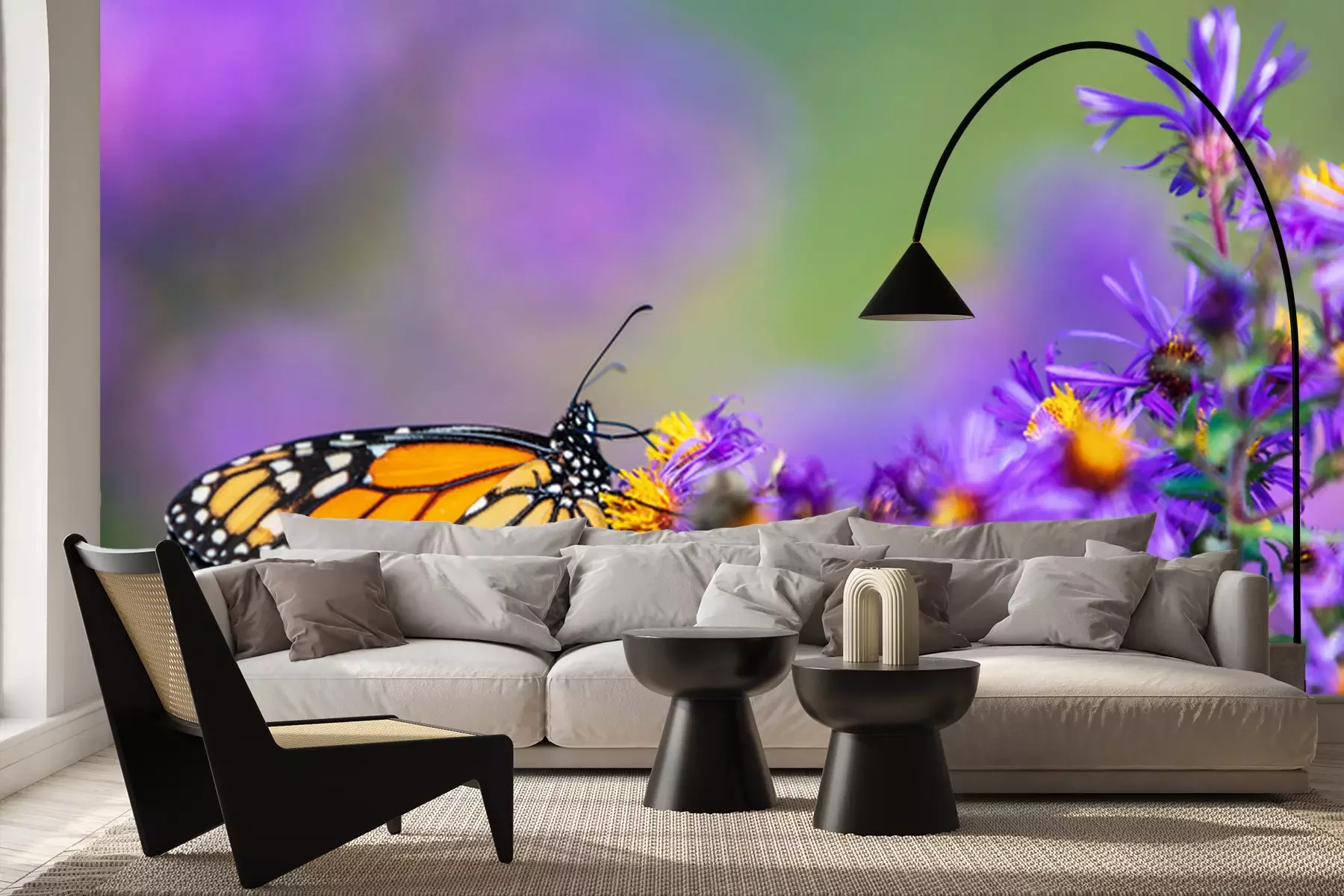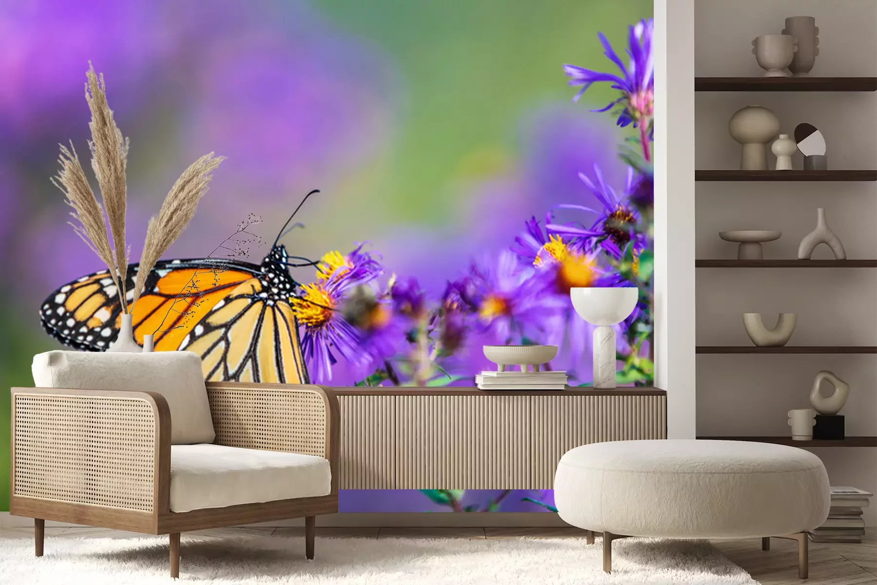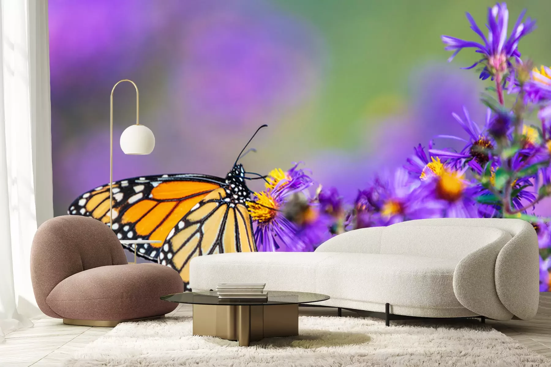 Fototapete Monarchfalter sitzt auf violetten Astern