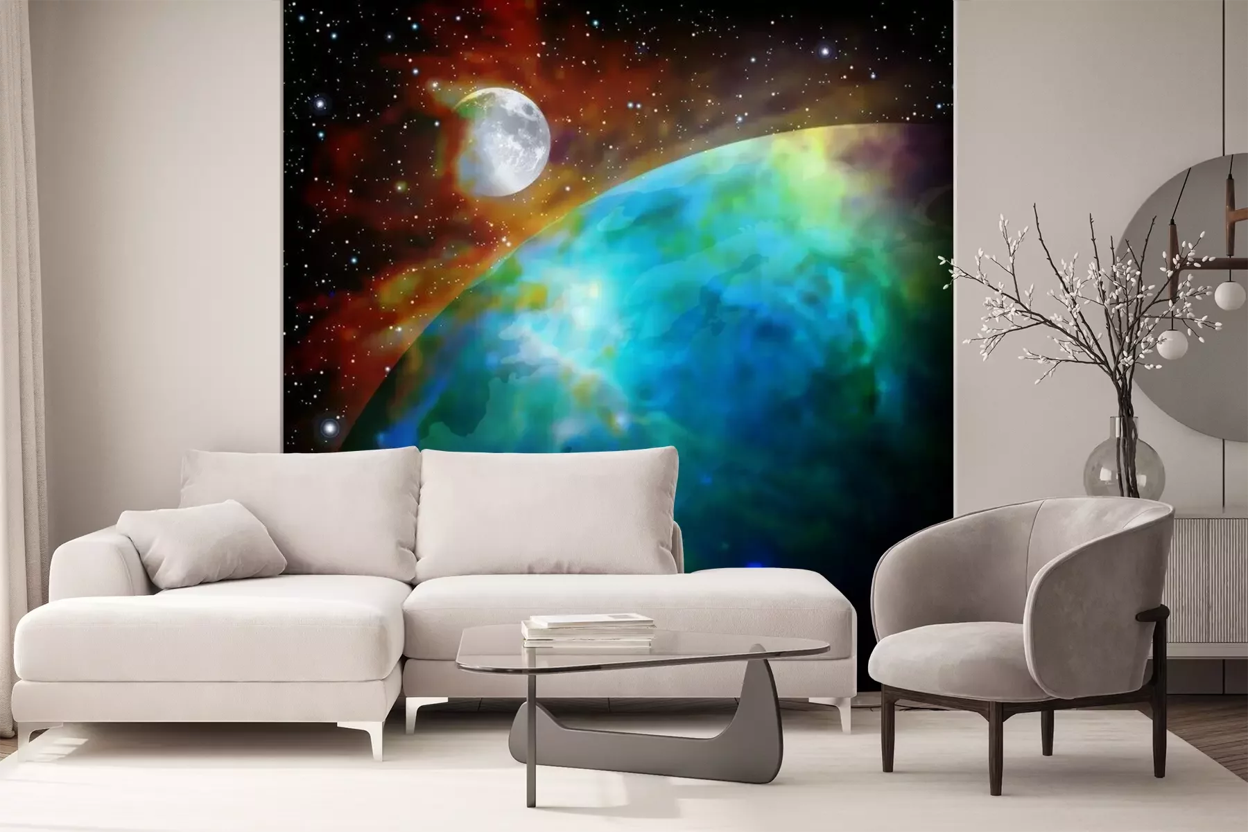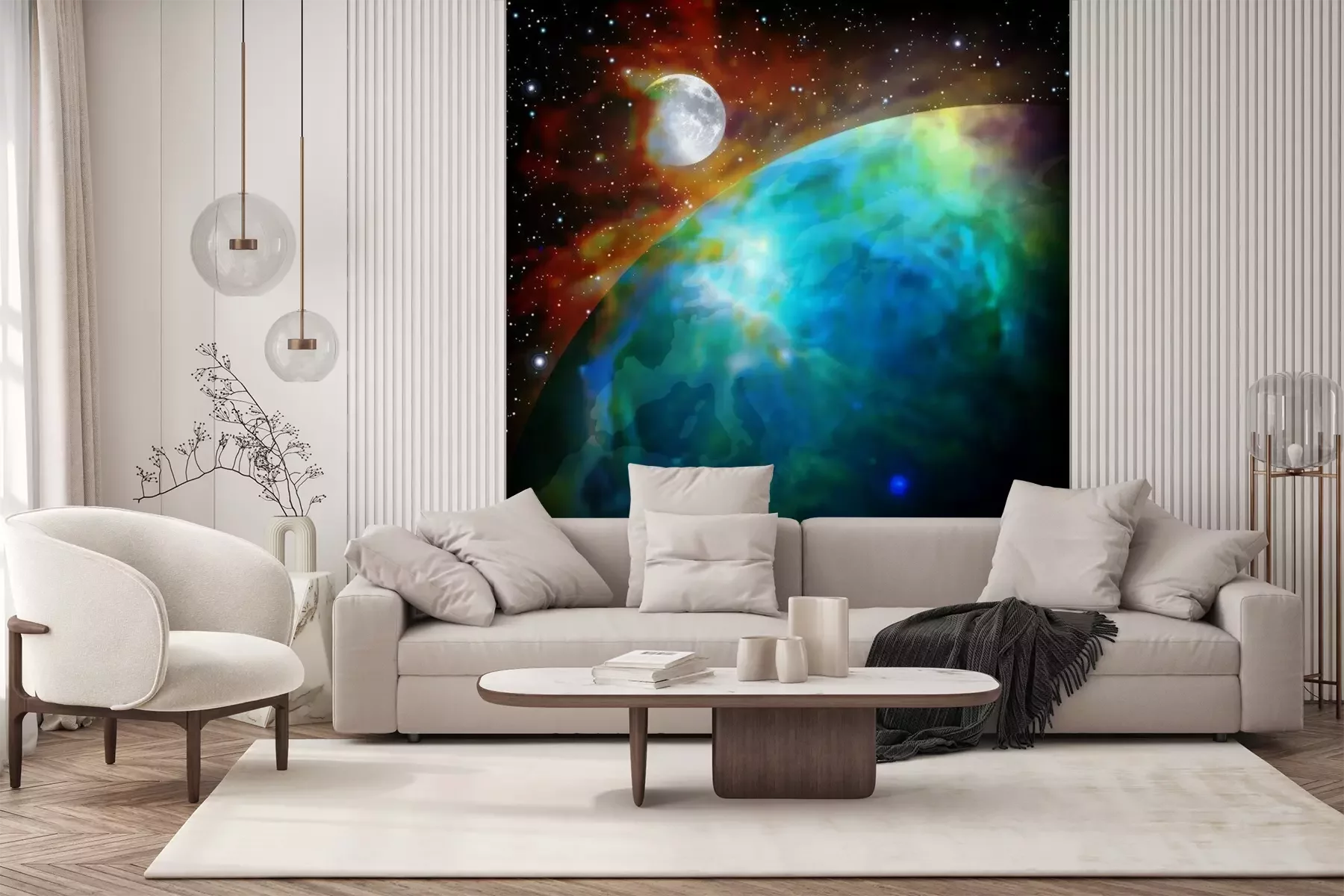 Das Material Premium+ besteht aus einer strukturierten Vinyl-Oberschicht und einem Trägermaterial (Vlies) mit einer Grammatur von 255 g/m², das kleine Unebenheiten der Wand zuverlässig kaschiert. Die feine Sandstruktur verleiht der Oberfläche eine luxuriöse Haptik, während das halbmatte Finish die Tiefe der Farben betont. Das Material ist dampfdurchlässig – so kann diese Fototapete auch in Küchen und Badezimmern eingesetzt werden. Die maximale Breite einer Tapetenbahn beträgt 100 cm. Bei größeren Abmessungen besteht die Fototapete aus mehreren gleich großen Bahnen. Der Kleber wird direkt auf die Wand aufgetragen, und die Fototapete wird auf Stoß angebracht, was für einen ästhetischen Effekt ohne sichtbare Fugen sorgt. Die Oberfläche ist pflegeleicht und kann bei Bedarf sanft mit einem feuchten Tuch abgewischt werden.