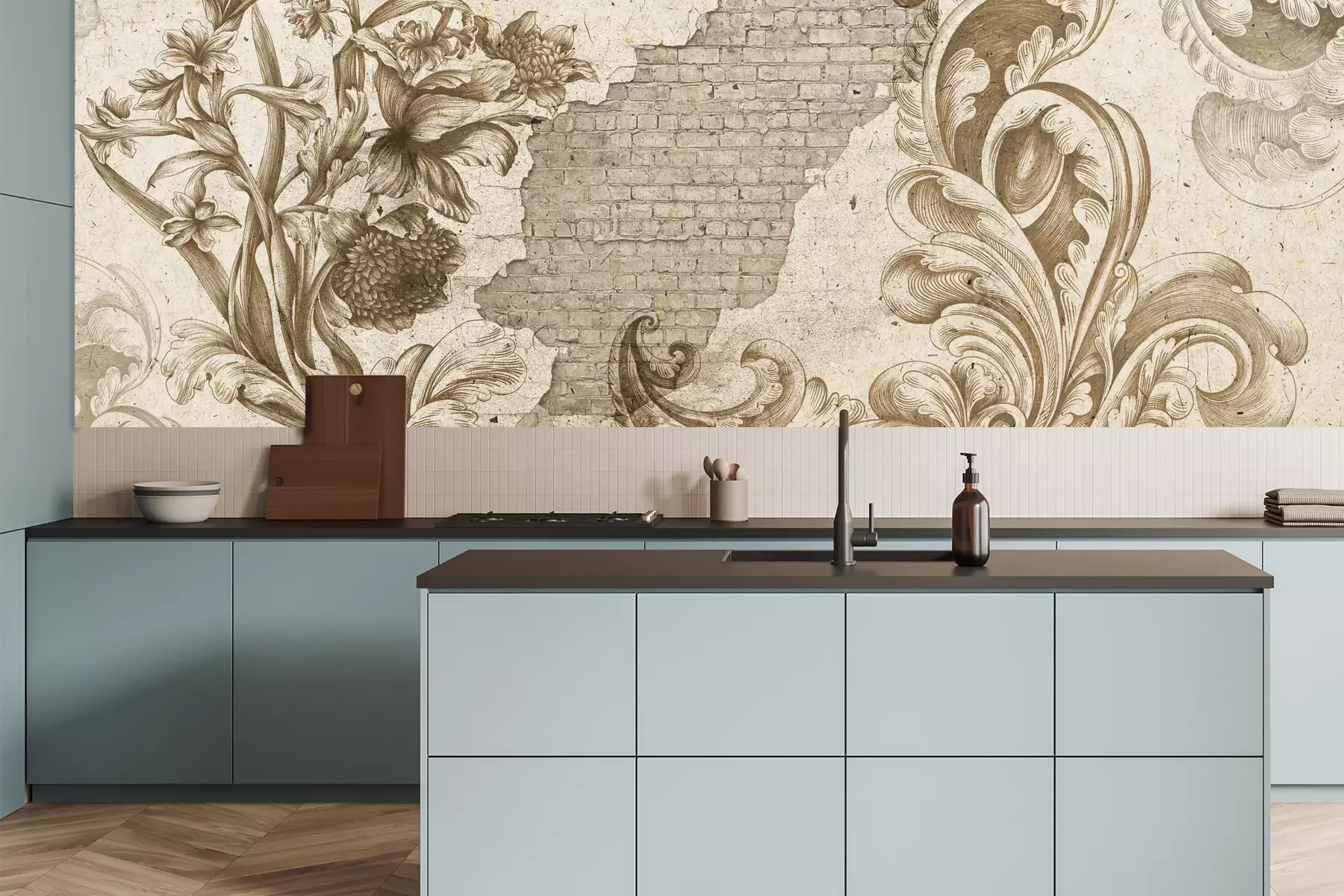 Das Material Premium+ besteht aus einer strukturierten Vinyl-Oberschicht und einem Trägermaterial (Vlies) mit einer Grammatur von 255 g/m², das kleine Unebenheiten der Wand zuverlässig kaschiert. Die feine Sandstruktur verleiht der Oberfläche eine luxuriöse Haptik, während das halbmatte Finish die Tiefe der Farben betont. Das Material ist dampfdurchlässig – so kann diese Fototapete auch in Küchen und Badezimmern eingesetzt werden. Die maximale Breite einer Tapetenbahn beträgt 100 cm. Bei größeren Abmessungen besteht die Fototapete aus mehreren gleich großen Bahnen. Der Kleber wird direkt auf die Wand aufgetragen, und die Fototapete wird auf Stoß angebracht, was für einen ästhetischen Effekt ohne sichtbare Fugen sorgt. Die Oberfläche ist pflegeleicht und kann bei Bedarf sanft mit einem feuchten Tuch abgewischt werden.