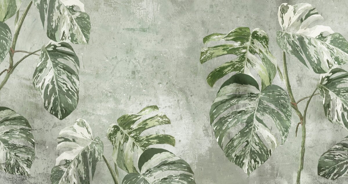Fototapete: Monstera-Pflanzen auf strukturiertem grünem Hintergrund