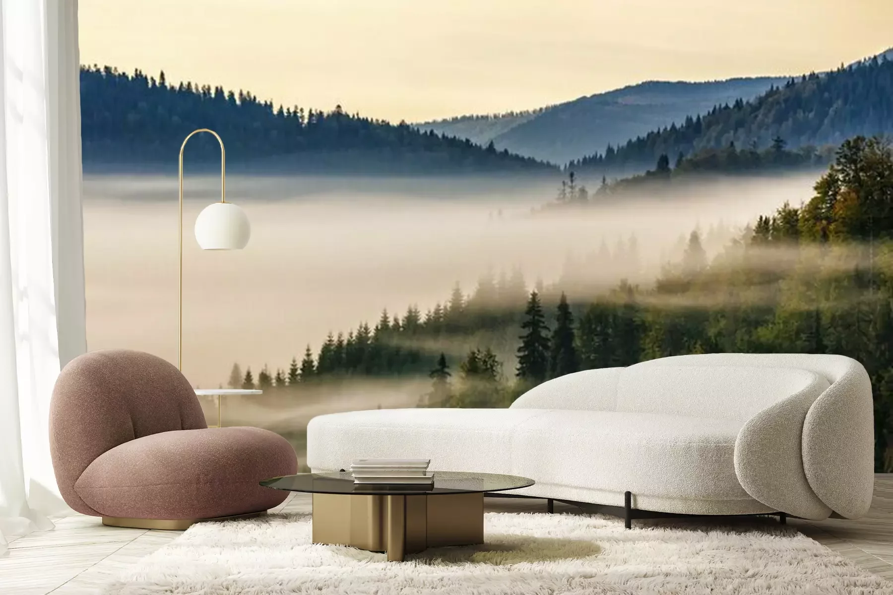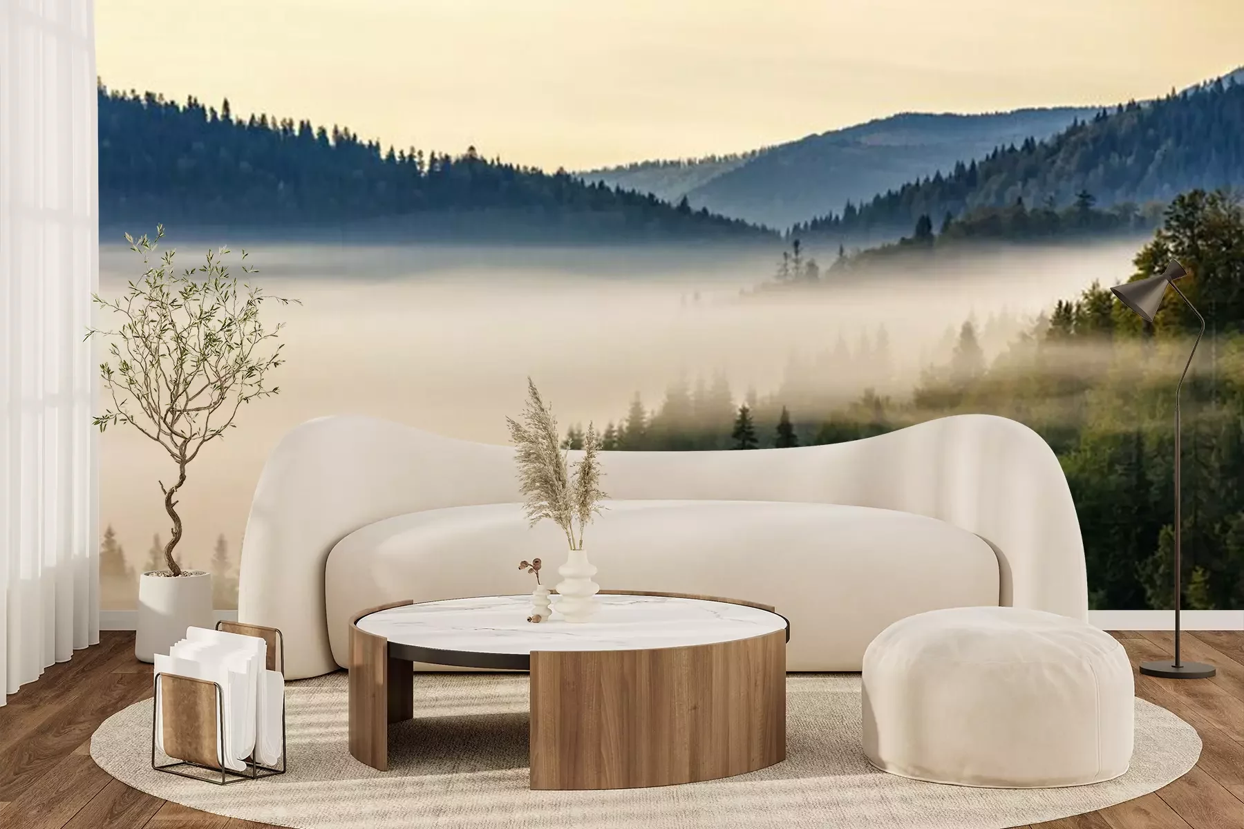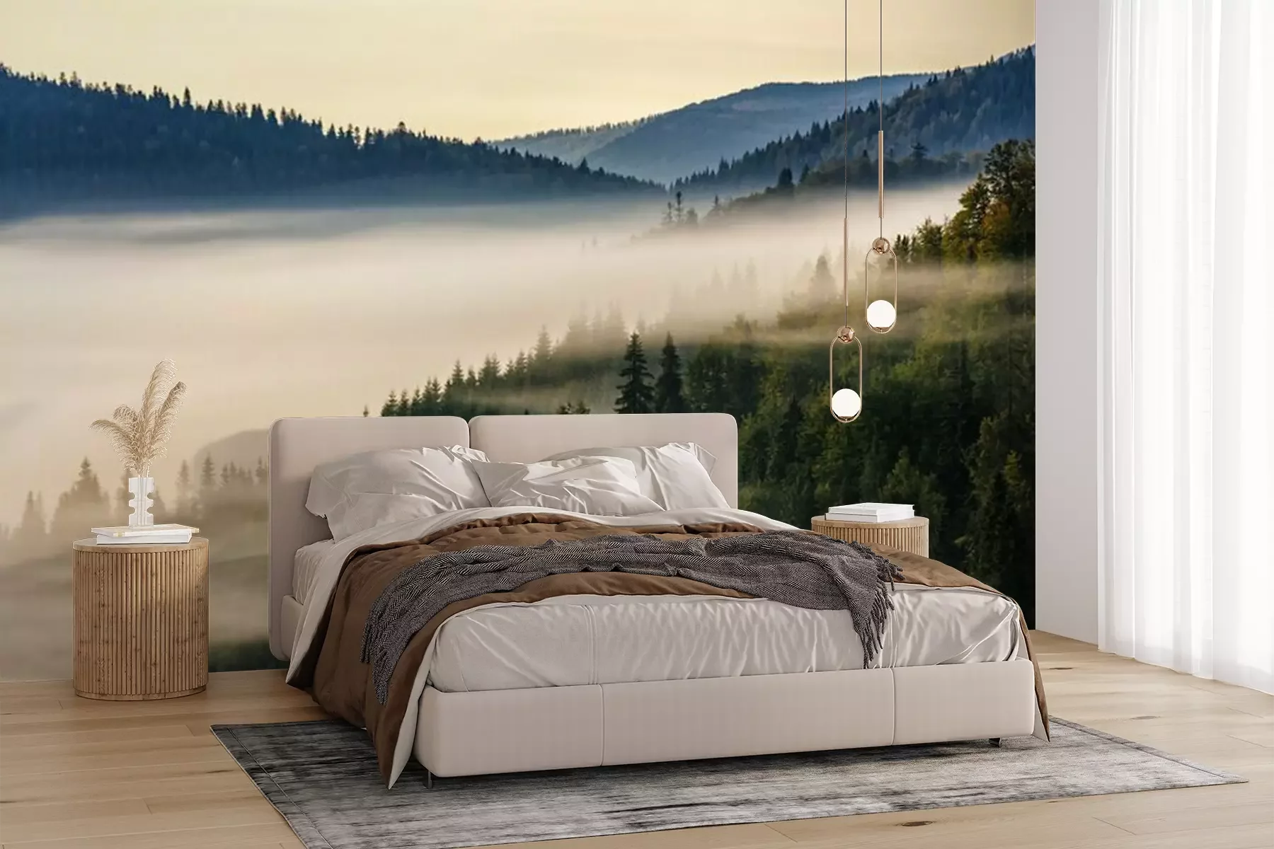 Nadelwald in den Bergen in Nebel gehülltFototapete