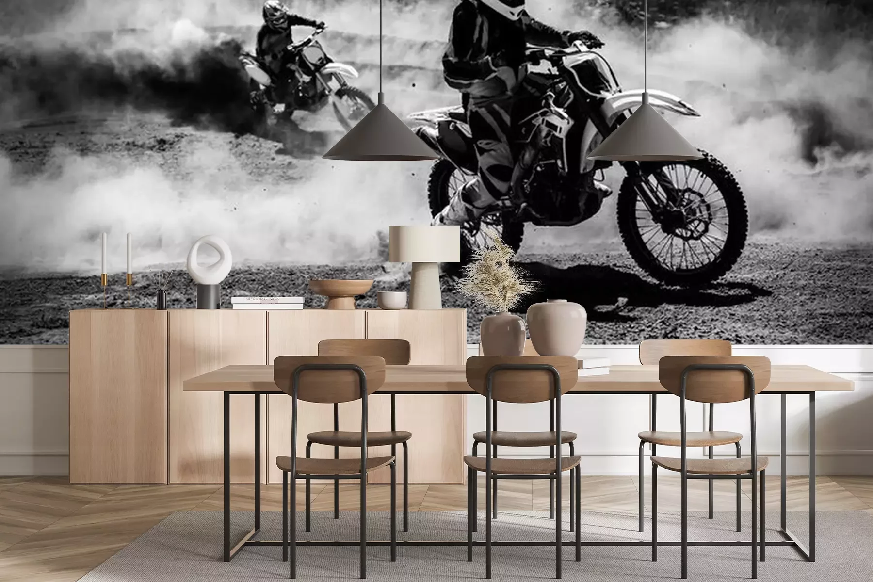 Fototapete Motocross racer accelerating in dust track, Black and white photo
