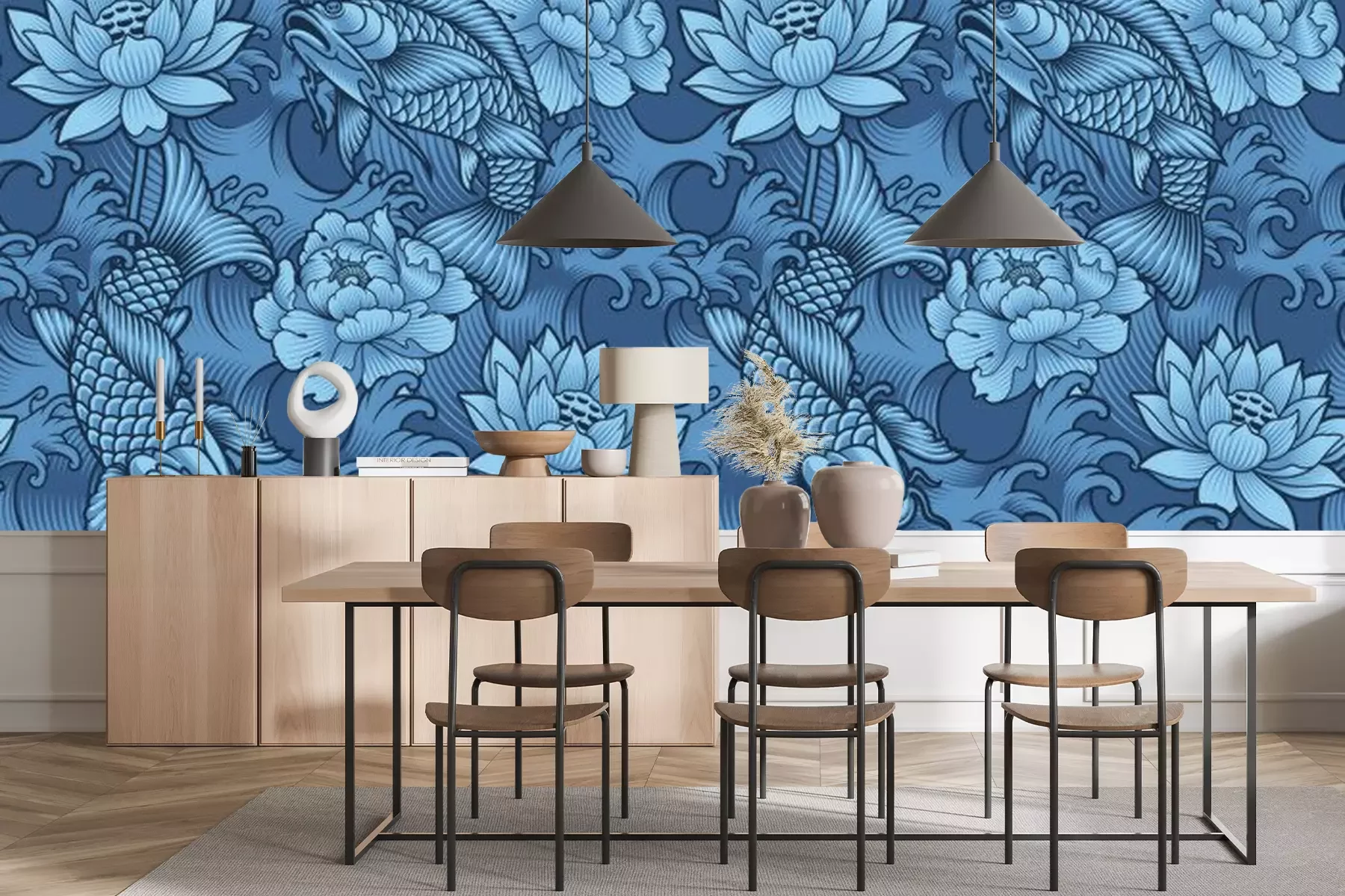 Fototapete Muster mit japanischen Koi Fischen inmitten von blauen Blumen