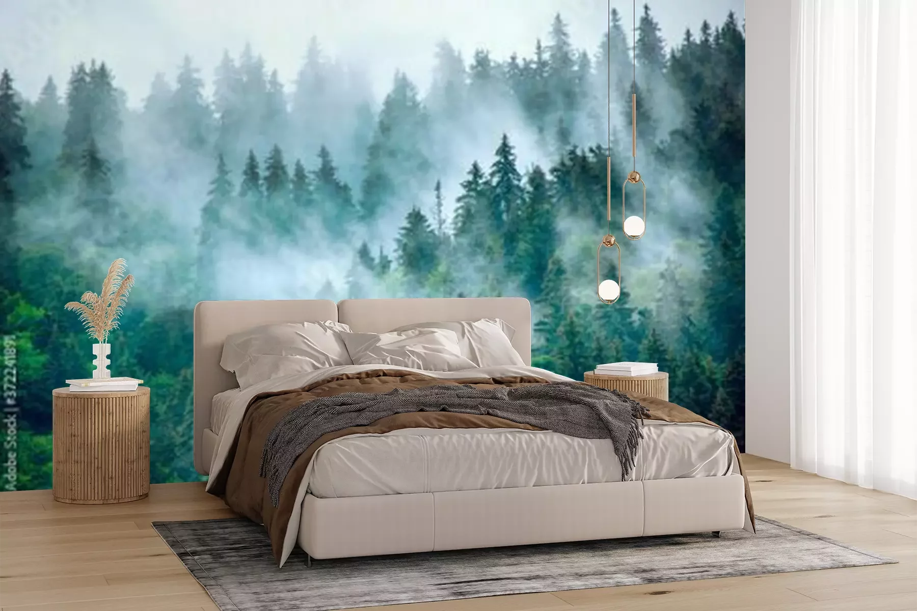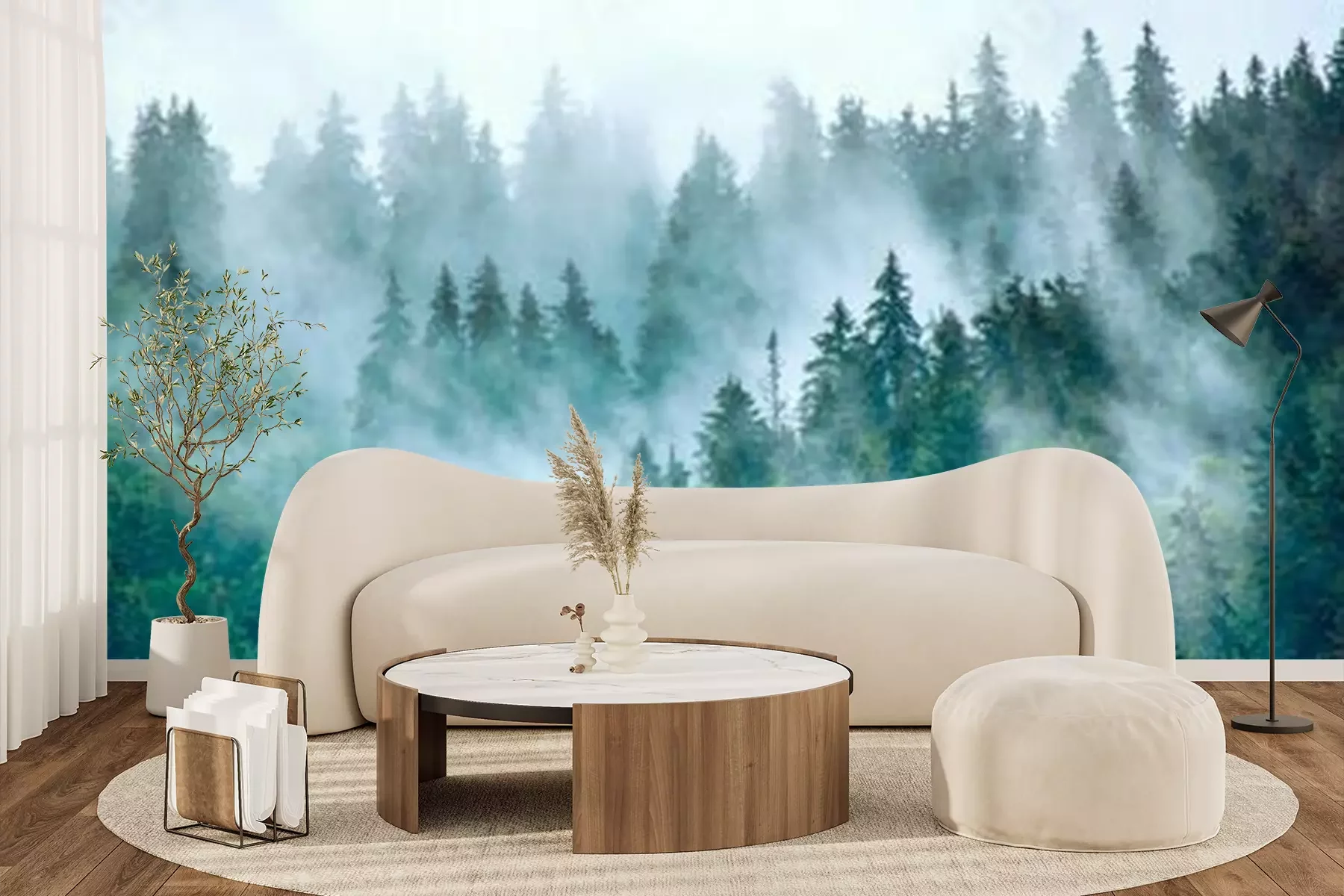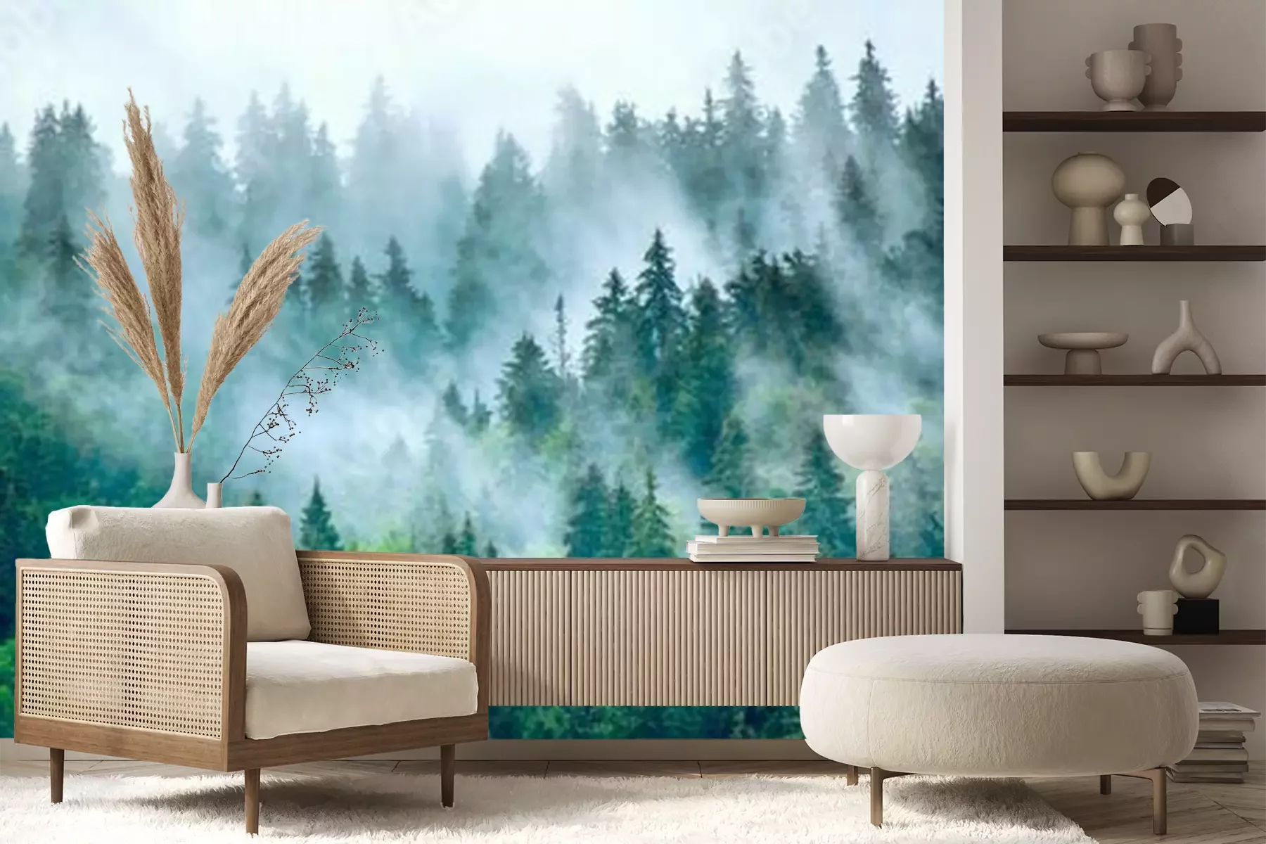 Nebliger Tannenwald in Grün- und BrauntönenFototapete