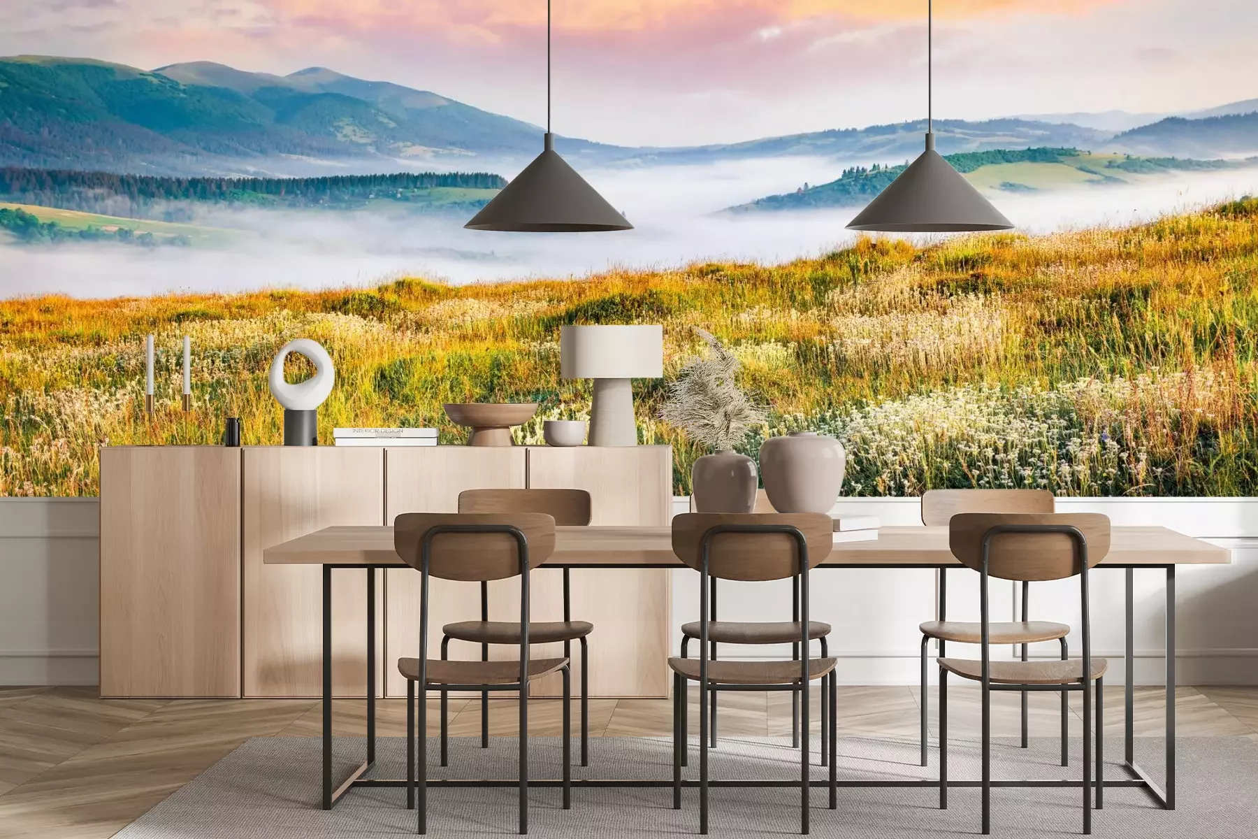 Das Material Premium+ besteht aus einer strukturierten Vinyl-Oberschicht und einem Trägermaterial (Vlies) mit einer Grammatur von 255 g/m², das kleine Unebenheiten der Wand zuverlässig kaschiert. Die feine Sandstruktur verleiht der Oberfläche eine luxuriöse Haptik, während das halbmatte Finish die Tiefe der Farben betont. Das Material ist dampfdurchlässig – so kann diese Fototapete auch in Küchen und Badezimmern eingesetzt werden. Die maximale Breite einer Tapetenbahn beträgt 100 cm. Bei größeren Abmessungen besteht die Fototapete aus mehreren gleich großen Bahnen. Der Kleber wird direkt auf die Wand aufgetragen, und die Fototapete wird auf Stoß angebracht, was für einen ästhetischen Effekt ohne sichtbare Fugen sorgt. Die Oberfläche ist pflegeleicht und kann bei Bedarf sanft mit einem feuchten Tuch abgewischt werden.