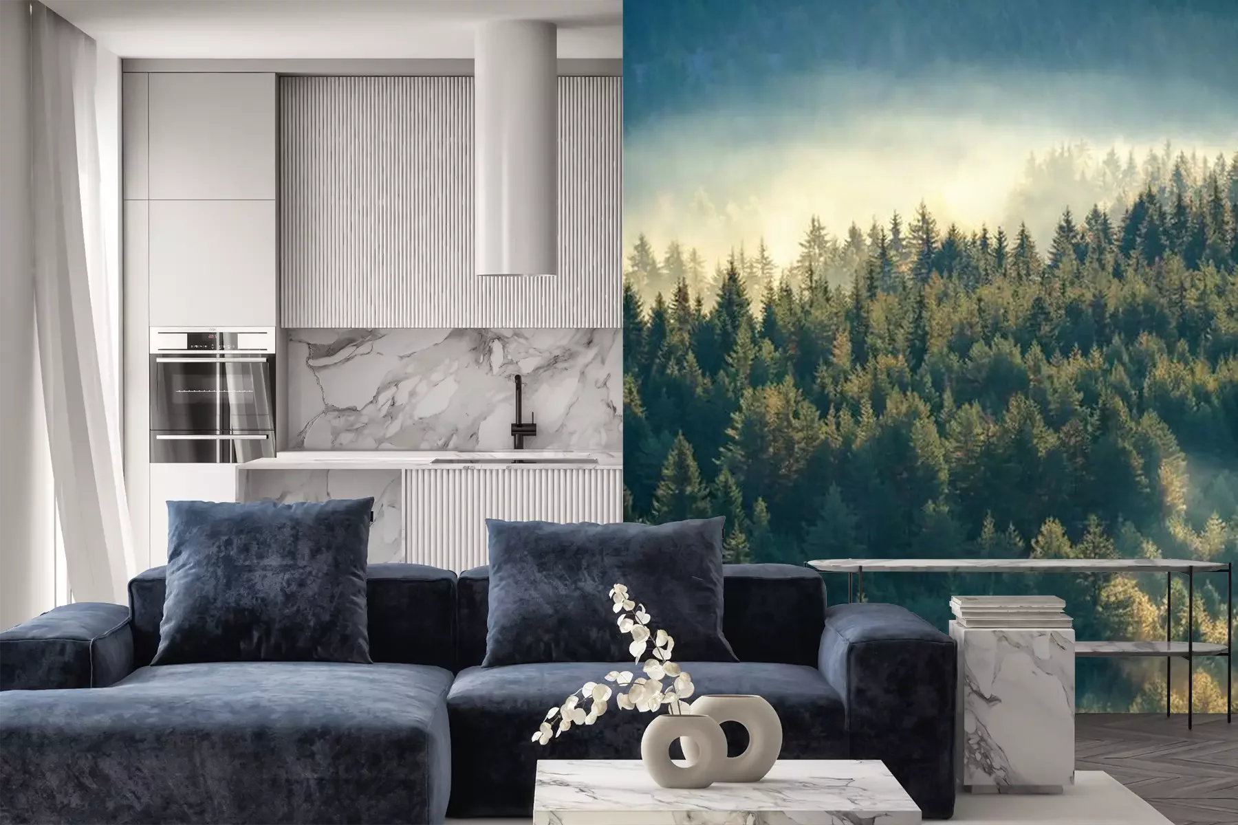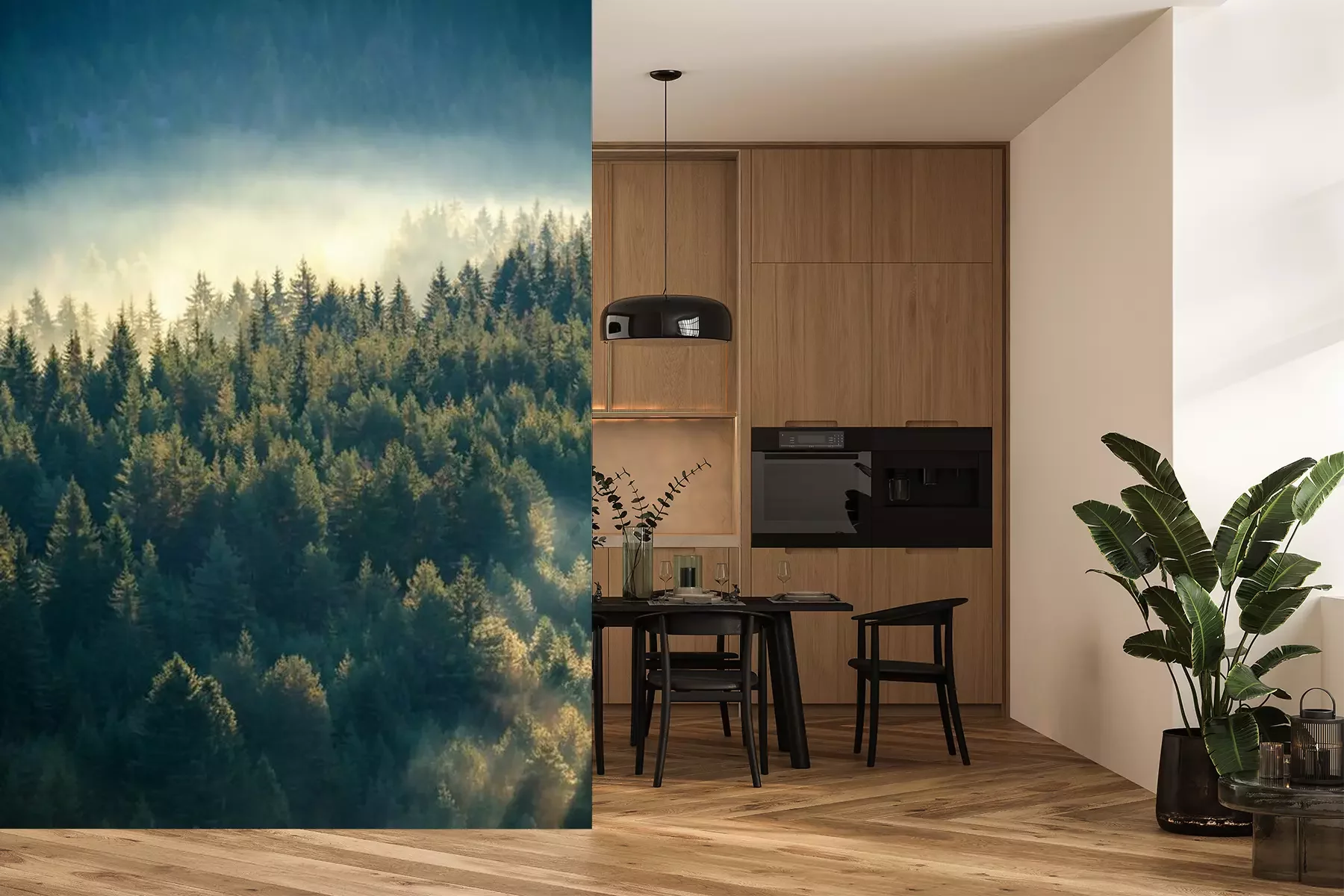 Das Material Premium+ besteht aus einer strukturierten Vinyl-Oberschicht und einem Trägermaterial (Vlies) mit einer Grammatur von 255 g/m², das kleine Unebenheiten der Wand zuverlässig kaschiert. Die feine Sandstruktur verleiht der Oberfläche eine luxuriöse Haptik, während das halbmatte Finish die Tiefe der Farben betont. Das Material ist dampfdurchlässig – so kann diese Fototapete auch in Küchen und Badezimmern eingesetzt werden. Die maximale Breite einer Tapetenbahn beträgt 100 cm. Bei größeren Abmessungen besteht die Fototapete aus mehreren gleich großen Bahnen. Der Kleber wird direkt auf die Wand aufgetragen, und die Fototapete wird auf Stoß angebracht, was für einen ästhetischen Effekt ohne sichtbare Fugen sorgt. Die Oberfläche ist pflegeleicht und kann bei Bedarf sanft mit einem feuchten Tuch abgewischt werden.