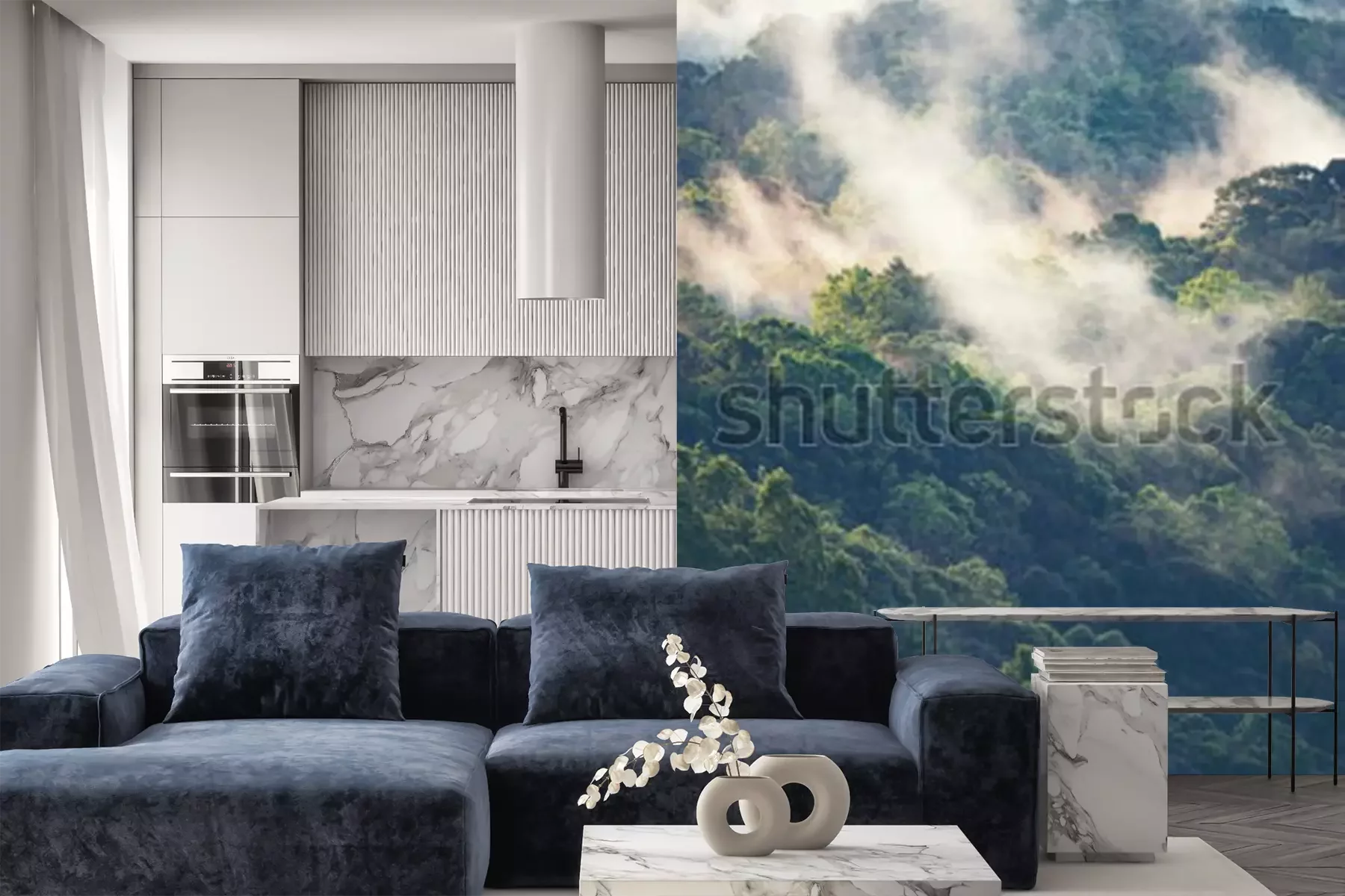 Fototapete Neblige Landschaft von bewaldeten Berghängen