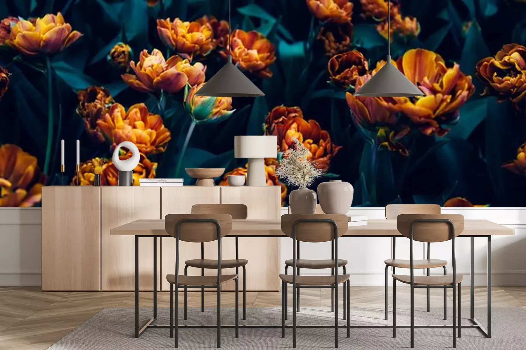 Fototapete Orangefarbene Tulpen auf dunklem Hintergrund