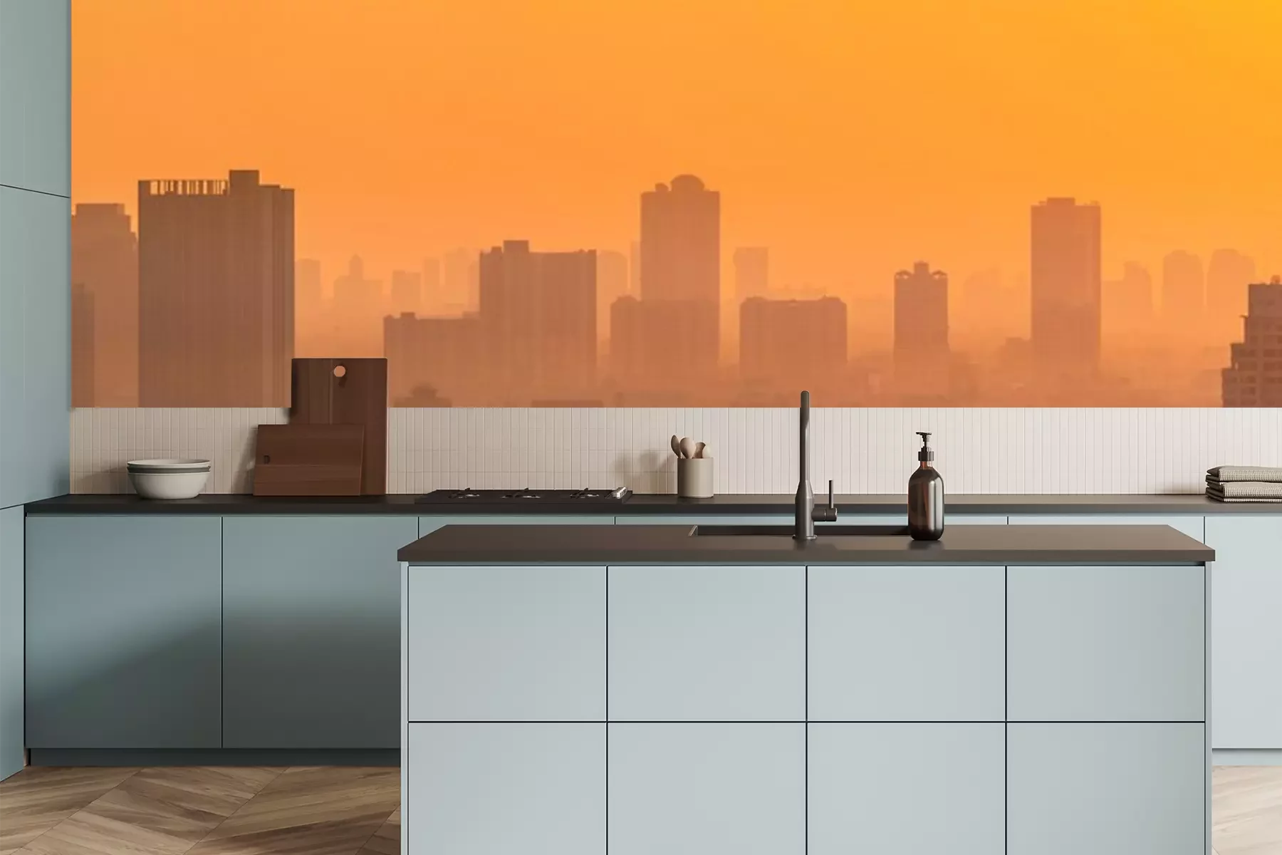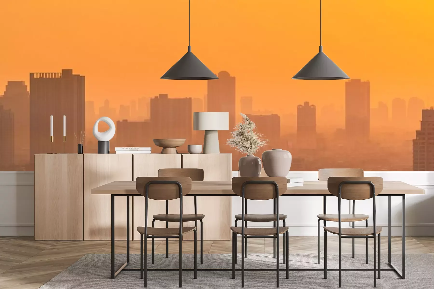 Fototapete Orangefarbener Aura-Sonnenaufgang über dem Stadtbild