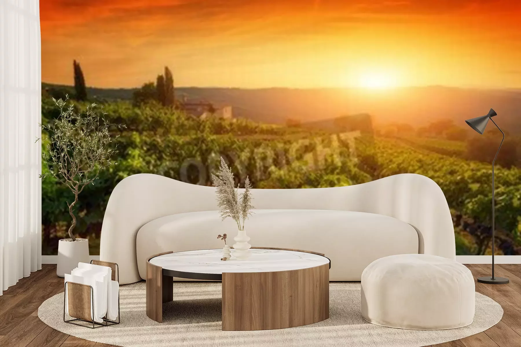 Fototapete Orangefarbener Sonnenuntergang hinter dem Weingut