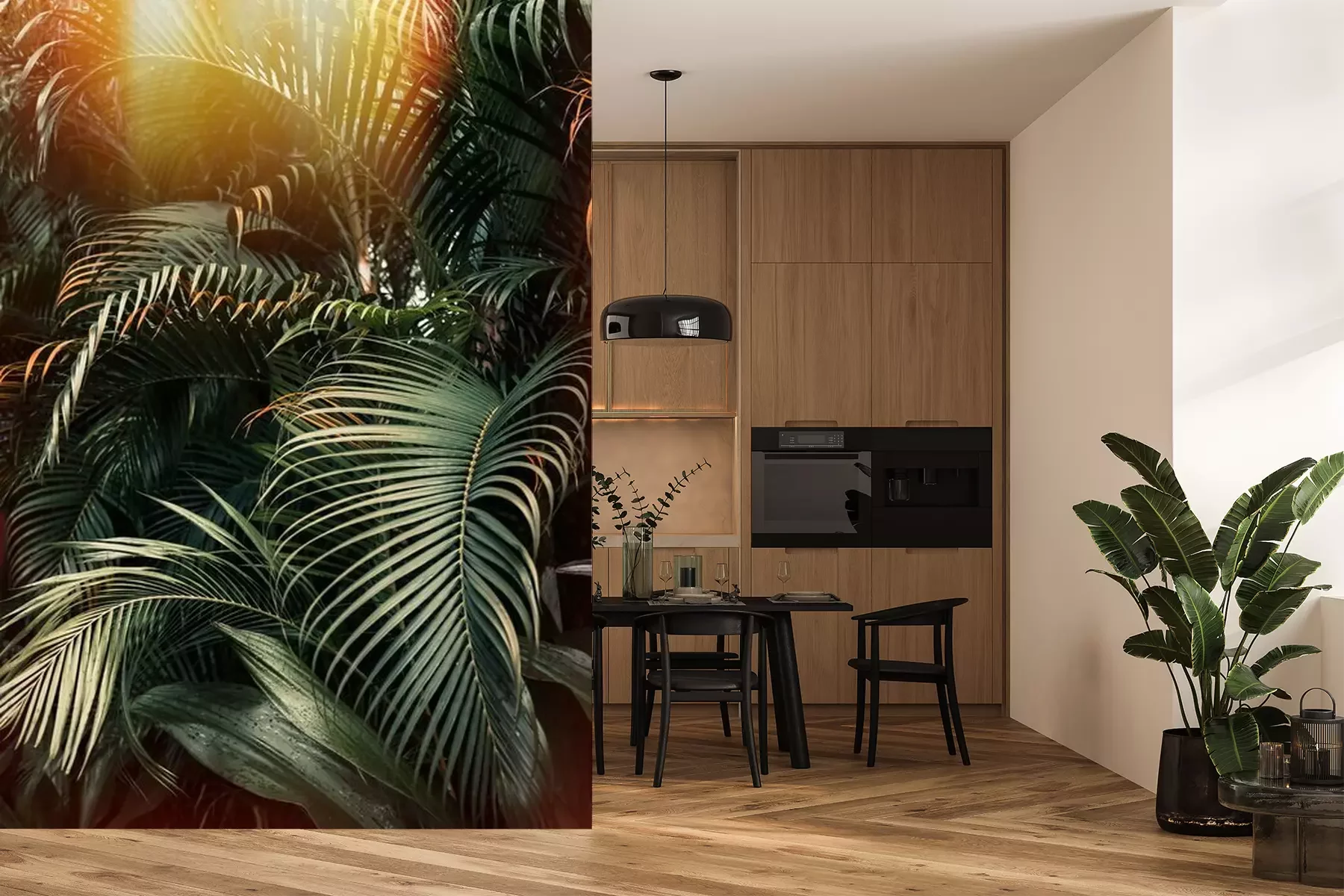 Das Material Premium+ besteht aus einer strukturierten Vinyl-Oberschicht und einem Trägermaterial (Vlies) mit einer Grammatur von 255 g/m², das kleine Unebenheiten der Wand zuverlässig kaschiert. Die feine Sandstruktur verleiht der Oberfläche eine luxuriöse Haptik, während das halbmatte Finish die Tiefe der Farben betont. Das Material ist dampfdurchlässig – so kann diese Fototapete auch in Küchen und Badezimmern eingesetzt werden. Die maximale Breite einer Tapetenbahn beträgt 100 cm. Bei größeren Abmessungen besteht die Fototapete aus mehreren gleich großen Bahnen. Der Kleber wird direkt auf die Wand aufgetragen, und die Fototapete wird auf Stoß angebracht, was für einen ästhetischen Effekt ohne sichtbare Fugen sorgt. Die Oberfläche ist pflegeleicht und kann bei Bedarf sanft mit einem feuchten Tuch abgewischt werden.