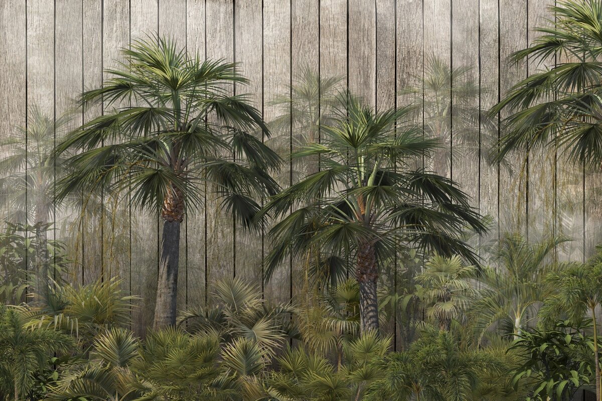 Fototapete: Palmen und tropisches Grün vor einem Hintergrund aus Holzbrettern