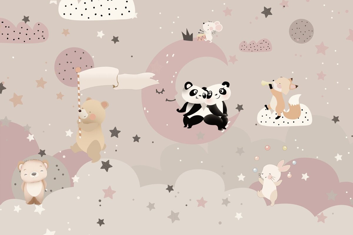 Fototapete: Pandas, die auf dem Mond sitzen, und ein Fuchs auf einer Wolke