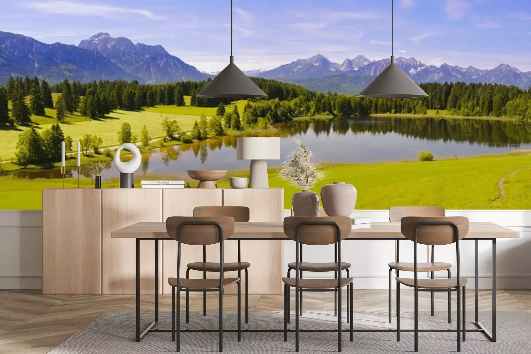 Bergpanorama mit Feldern und AlpenProblemlose Lieferung durch vertrauenswürdige Spediteure