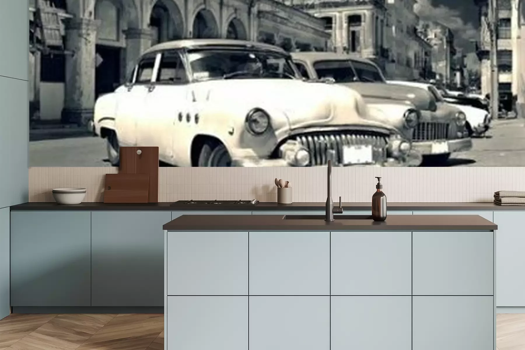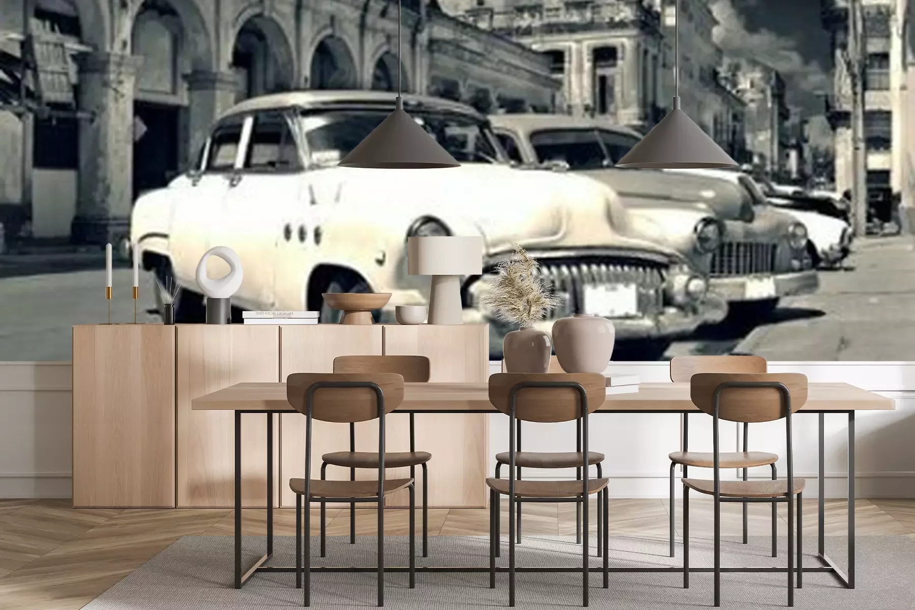Fototapete Panoramic view of shabby old havana street with vintage classic american cars