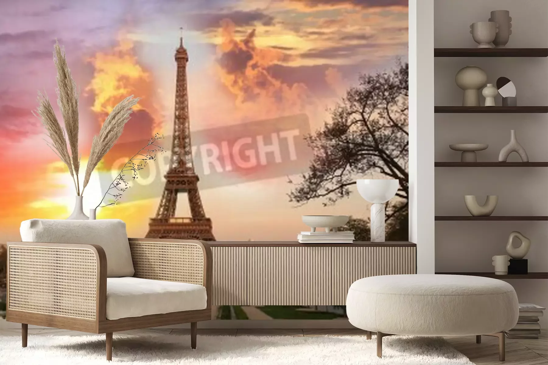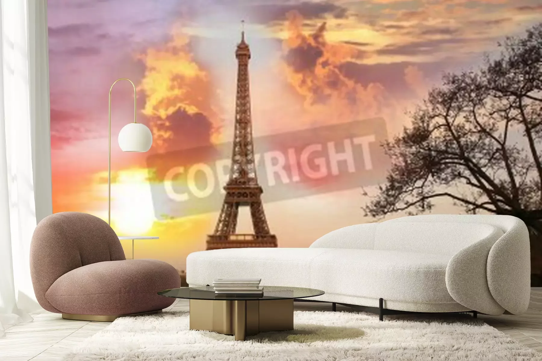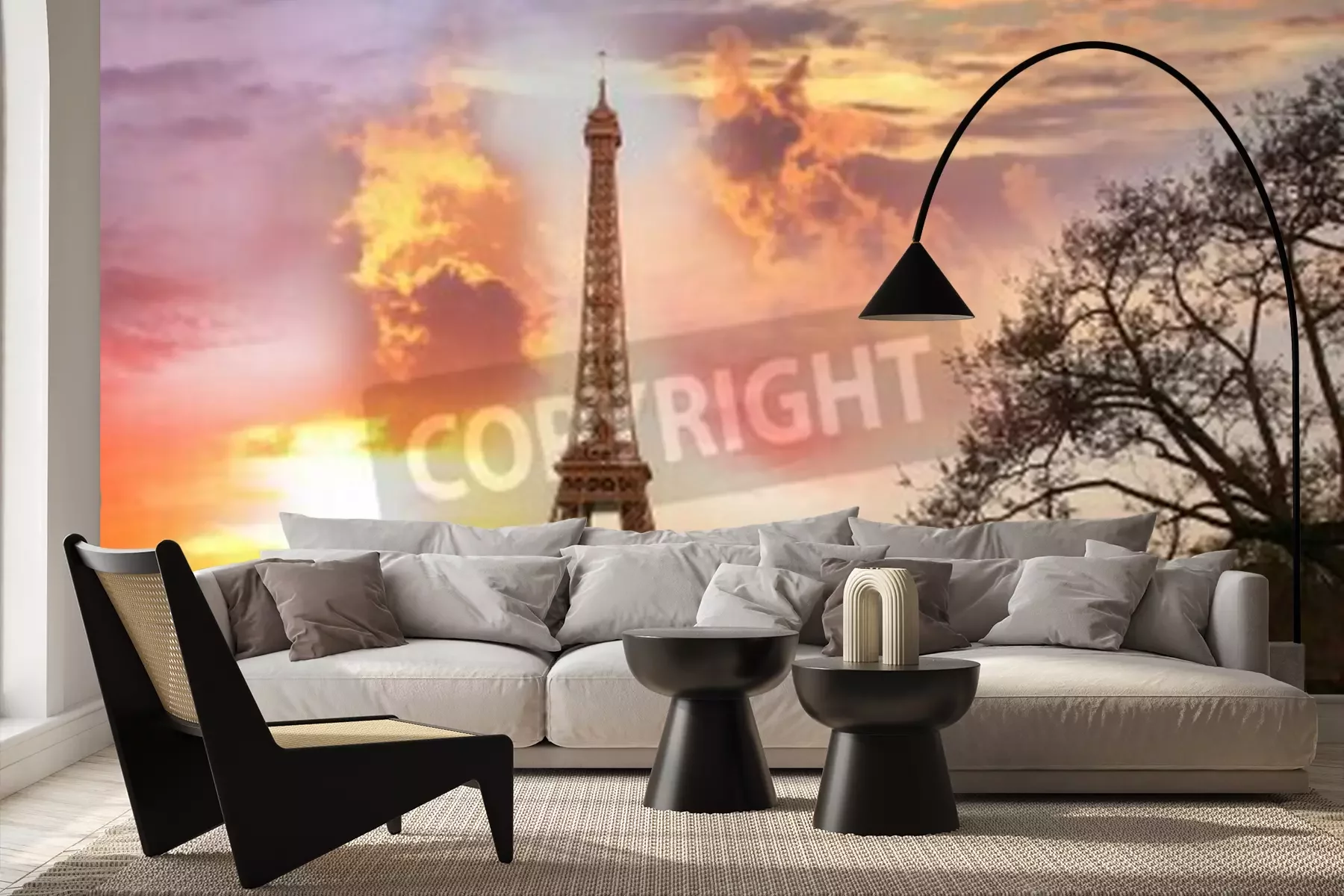Fototapete Paris und Eiffelturm vor dem Hintergrund des Sonnenuntergangs