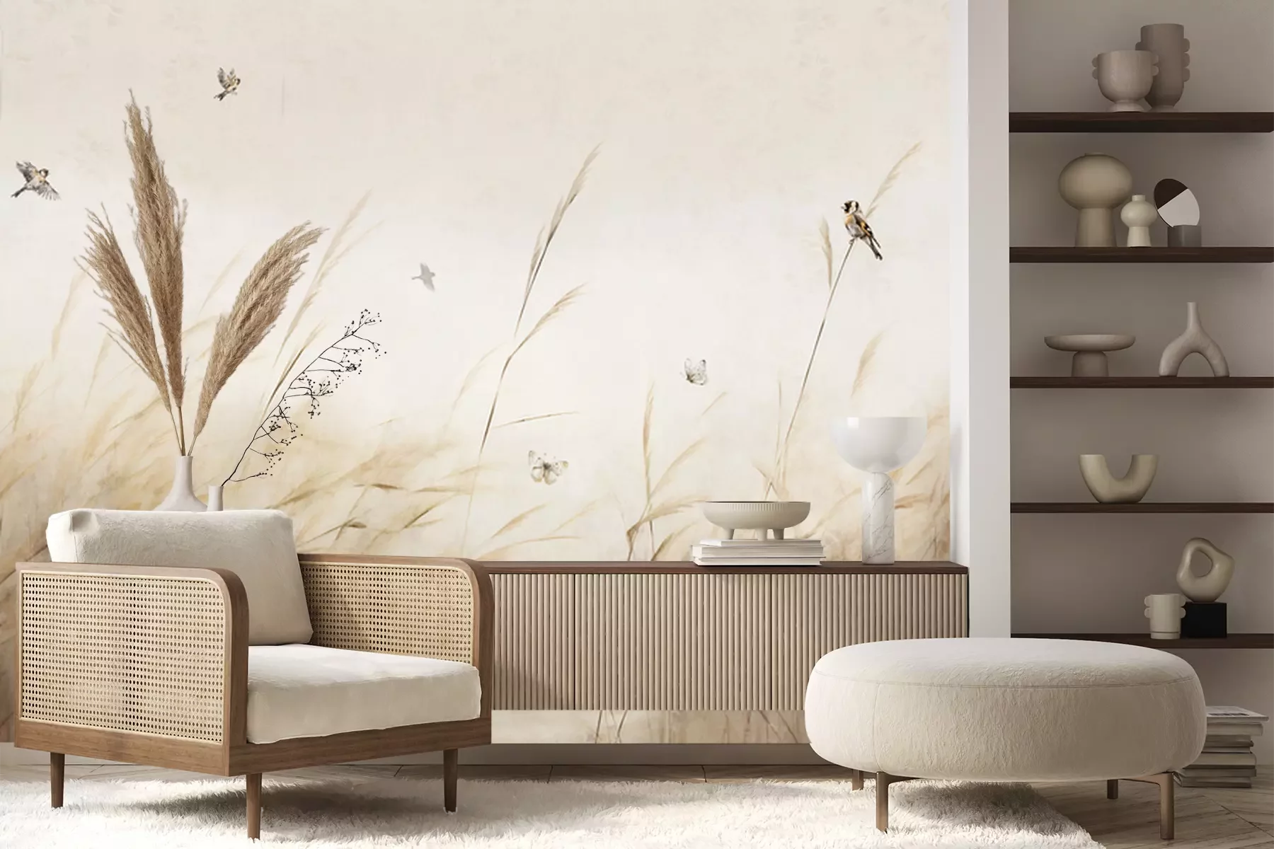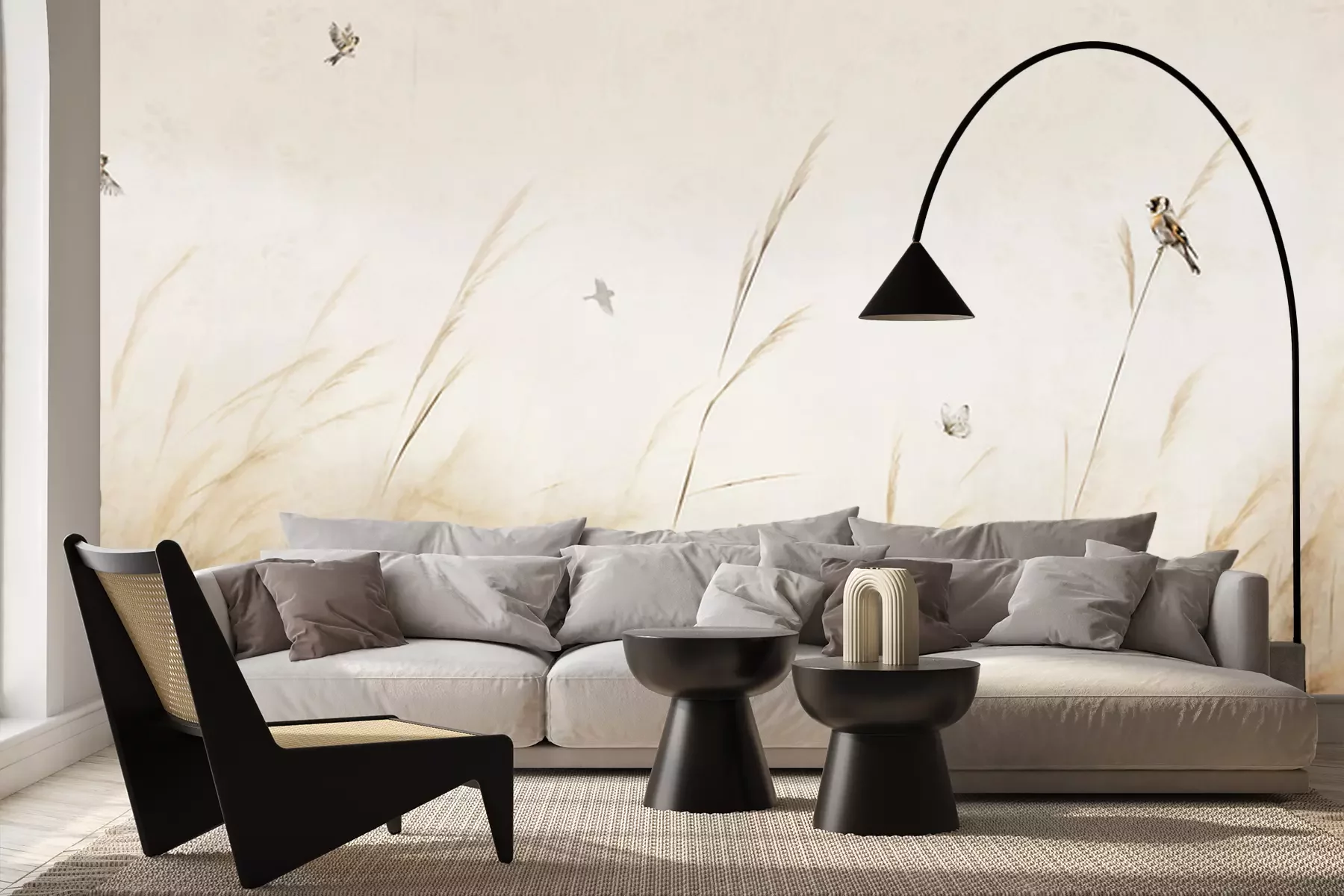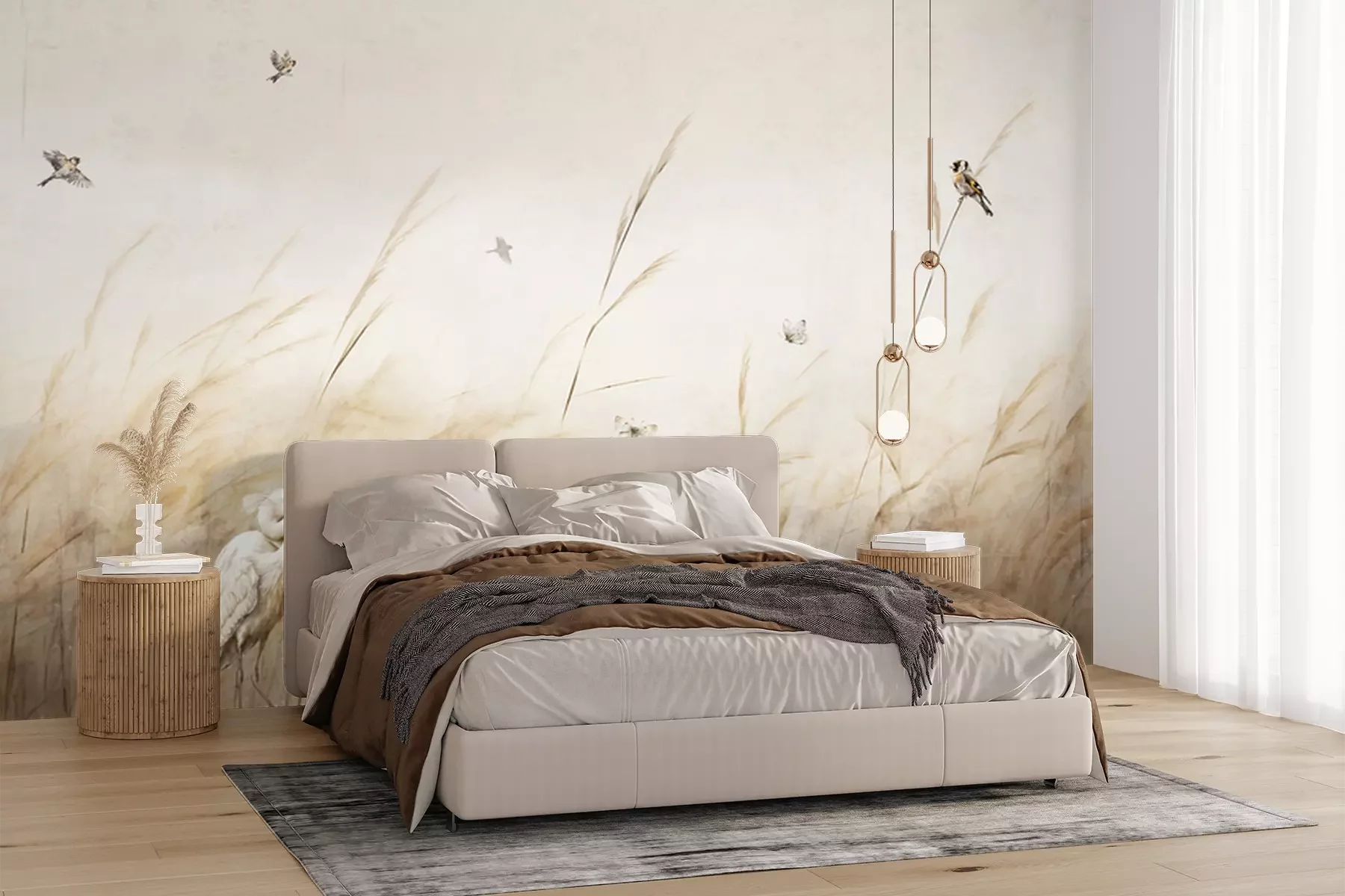 Flock of birds flying .Eine großformatige Wanddekoration kann nicht nur einen Raum verschönern, sondern auch dafür sorgen, dass sich deine Wohnung für eine malerische Landschaft öffnet. Es reicht, wenn du dich für ein Muster entscheidest, wie das Design unserer Fototapete. Vögel, die sich unter Schilf und Pampasgras verstecken, bringen eine beruhigende Natur in die Einrichtung, selbst wenn du in der Stadt wohnst und sich vor deinen Fenstern ein Betondschungel erstreckt. Du wirst angenehm überrascht sein, wie viel verändert eine solche Fototapete. Wiese und das dahinter im Nebel verborgene Wasser vergrößern optisch deinen Raum, indem sie ein Gefühl der Tiefe vermitteln. Es ist also ein hervorragendes Dekorationselement für ein kleines Wohnzimmer, ein Schlafzimmer oder sogar für ein Badezimmer. Entscheide dich einfach für eine wasserfeste Fototapete. Schmetterlinge und Wasservögel, die über den Gräsern fliegen, werden eine perfekte Ergänzung für den Ort sein, an dem du lange, entspannende Bäder nimmst. Das laminierte Motiv ist resistent gegen Wasser und Feuchtigkeit und wird dir viele Jahre lang dienen. Aus demselben Grund ist es auch die ideale Küchen-Fototapete. Schmetterlinge und Vögel werden eine schöne Dekoration sein, und wenn das Muster schmutzig wird, kannst du die Flecken leicht entfernen. Da es sich nicht um ein Foto, sondern um ein zart ausgedrücktes Gemälde handelt, ist es eine äußerst künstlerische Fototapete. Vögel und Schmetterlinge als Dekorationsmotiv funktionieren in vielen verschiedenen Arrangements. Es ist eine ausgezeichnete Idee für ein Wohnzimmer im Japandi-Stil, einer Ästhetik, die japanische Inspirationen mit skandinavischem Minimalismus verbindet. Warum bieten wir dieses Motiv für eine Fototapete? Vögel im Vordergrund, insbesondere der weiße Reiher, werden mit dem Land der aufgehenden Sonne in Verbindung gebracht. Ergänze die Einrichtung mit Postern von japanischen Holzschnitten, um eine atemberaubende Einrichtung zu erzielen. Auch zu einem modernen Boho-Interieur passen Vögel. Fototapete, die in gedämpften Farben gehalten ist, wird eine harmonische Ergänzung des Raumes sein. In einem so eingerichteten Schlafzimmer lohnt es sich, große Vasen mit getrocknetem Pampasgras aufzustellen und Makramees an der Wand zu hängen. Ein weiterer Einrichtungsvorschlag ist der rustikale Stil. Hier funktionieren sowohl Vögel als auch Schmetterlinge. Fototapete mit einer Feldwiese bringt eine sorglose und idyllische Atmosphäre in den Raum.