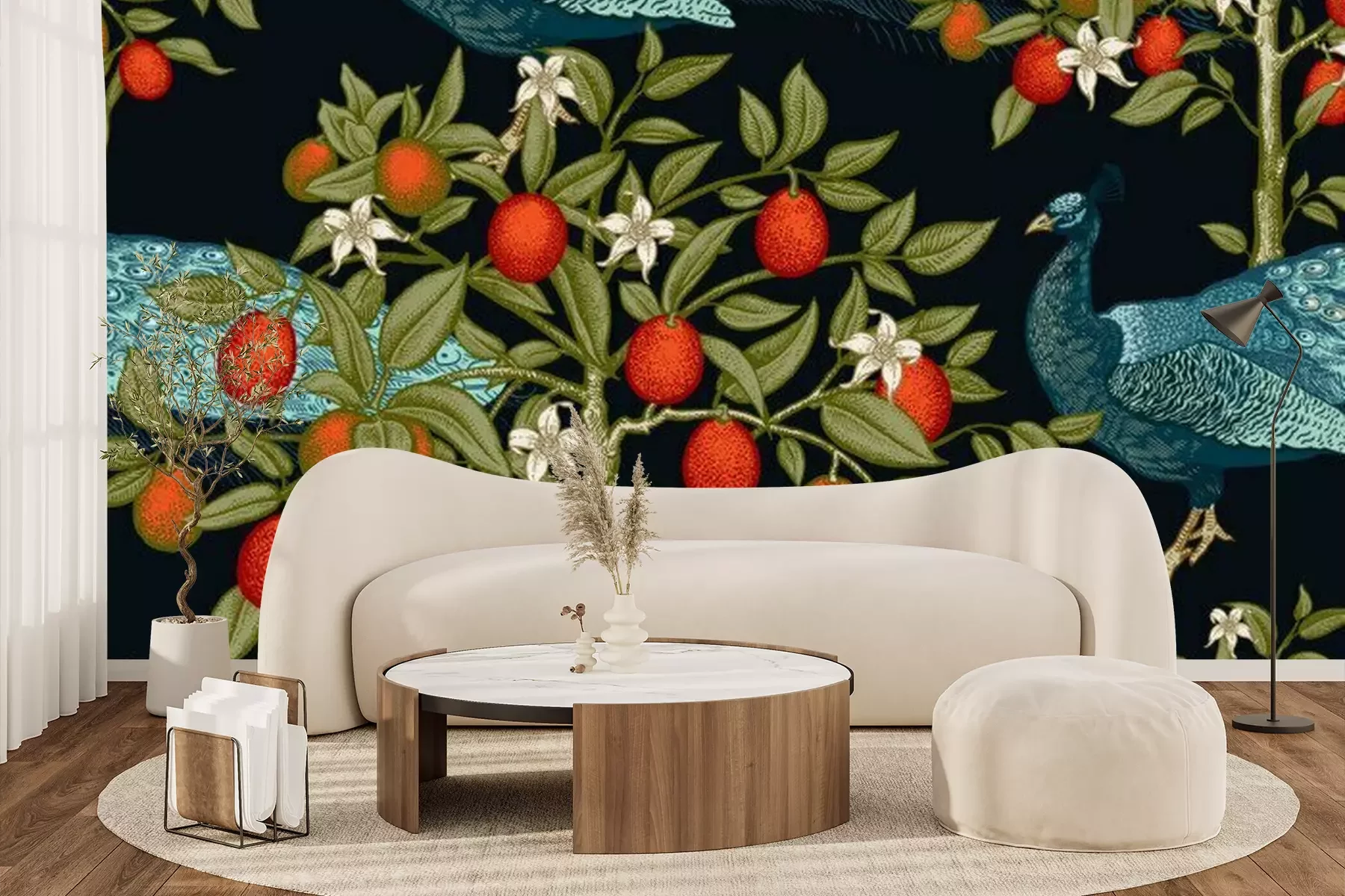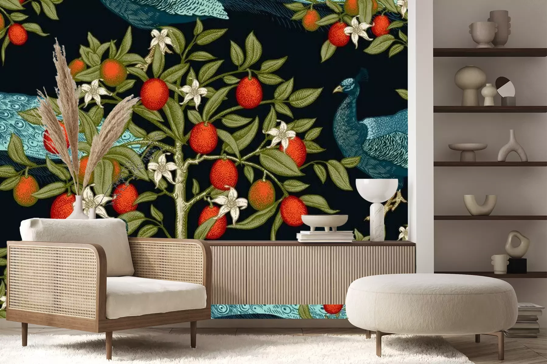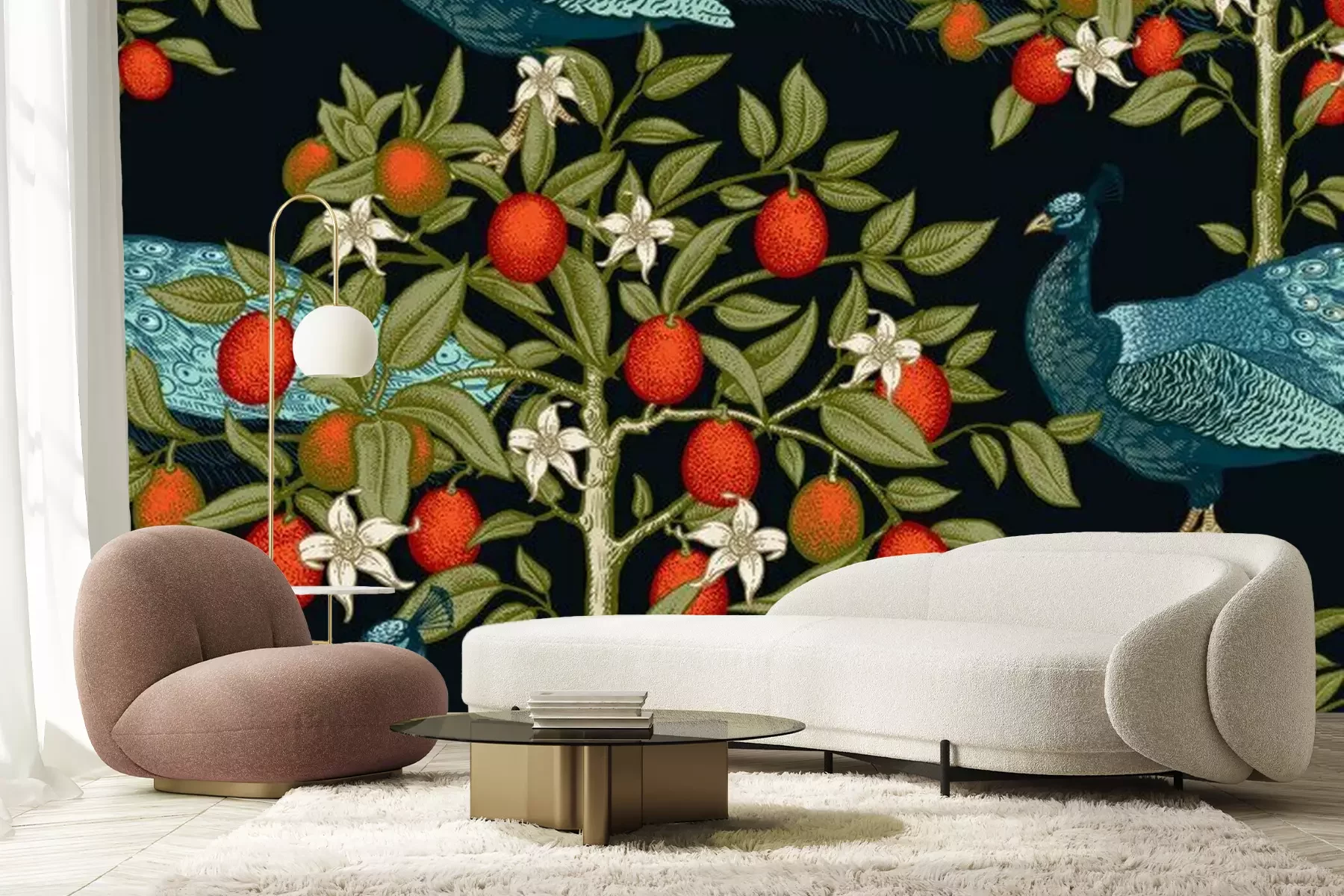 Fototapete Peacocks and citruses on black background. Seamless pattern.