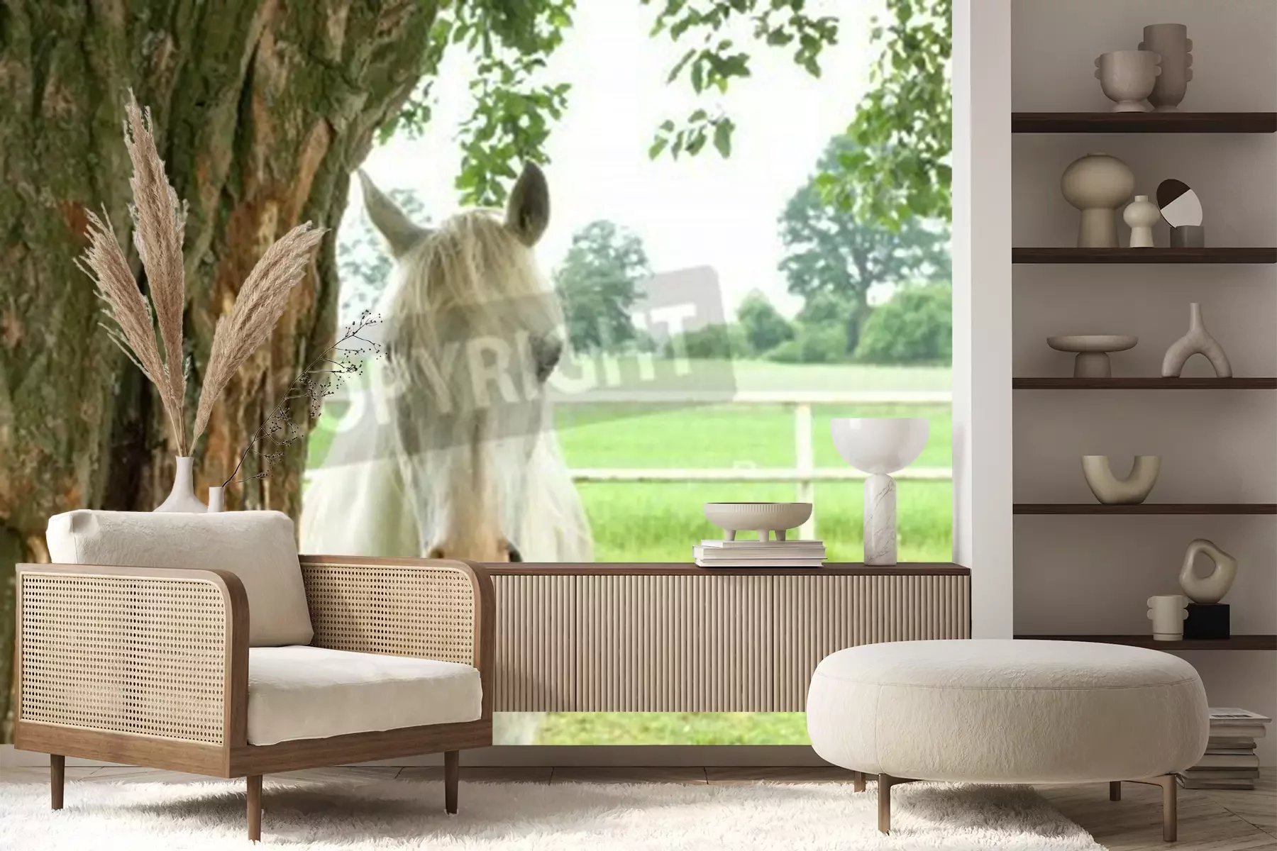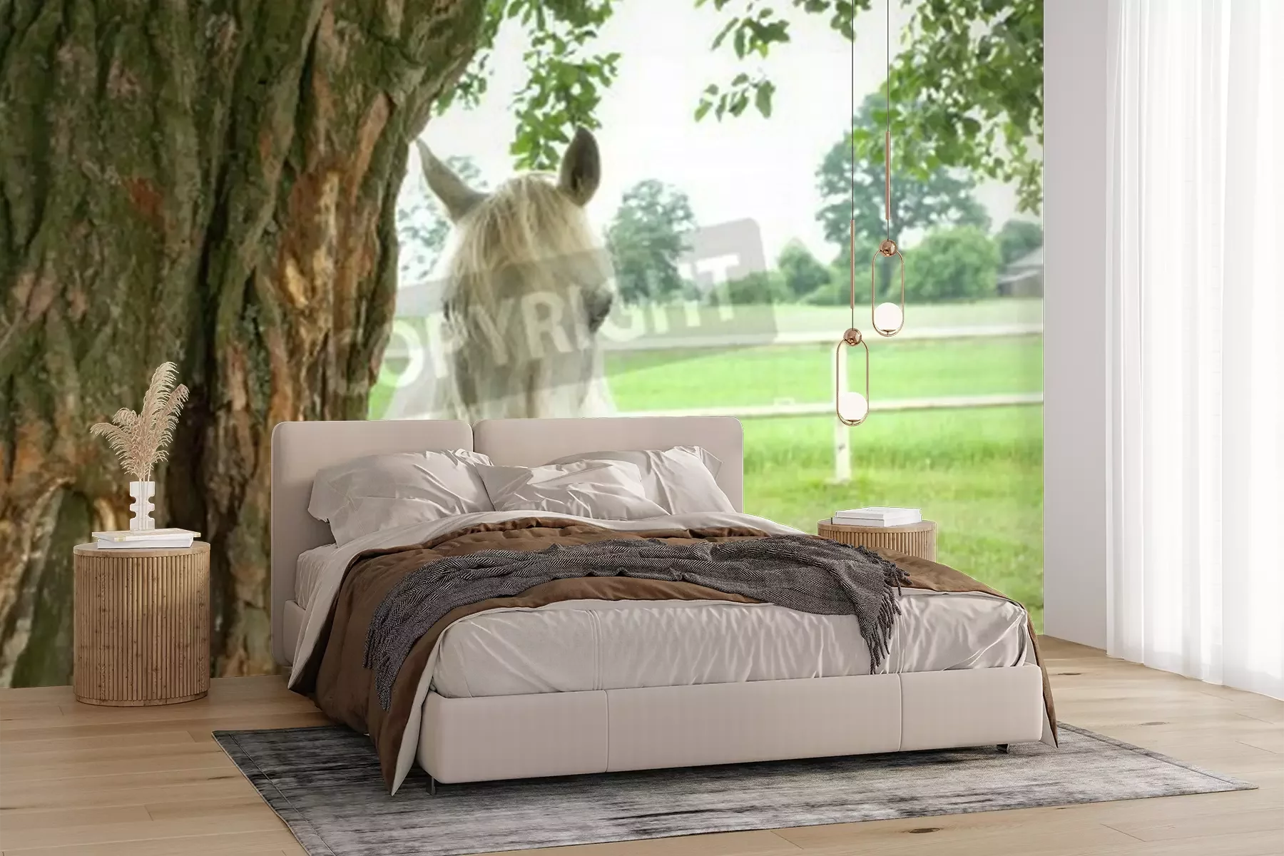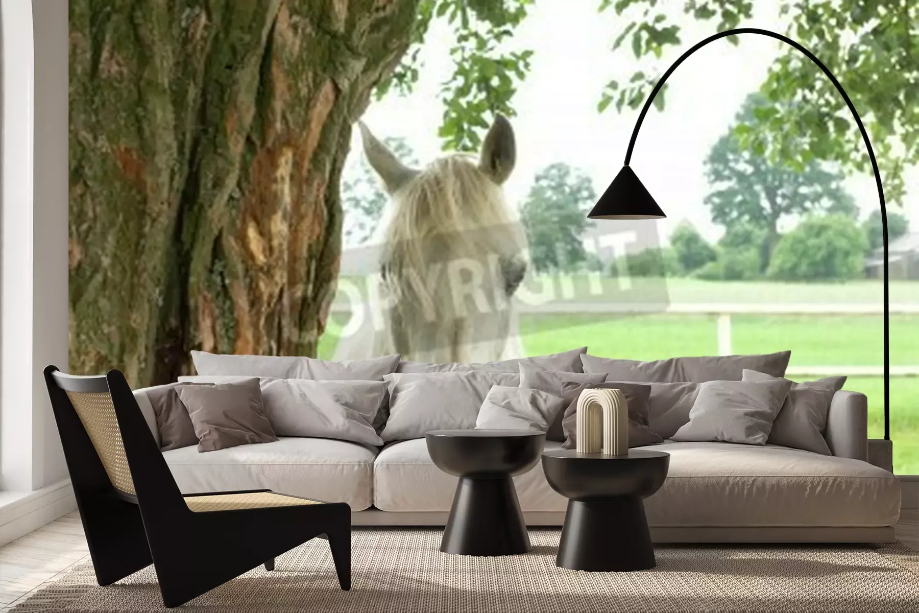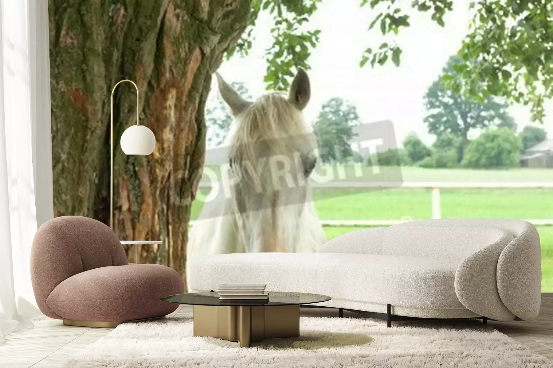 Fototapete Pferd, das sich hinter einem baum versteckt
