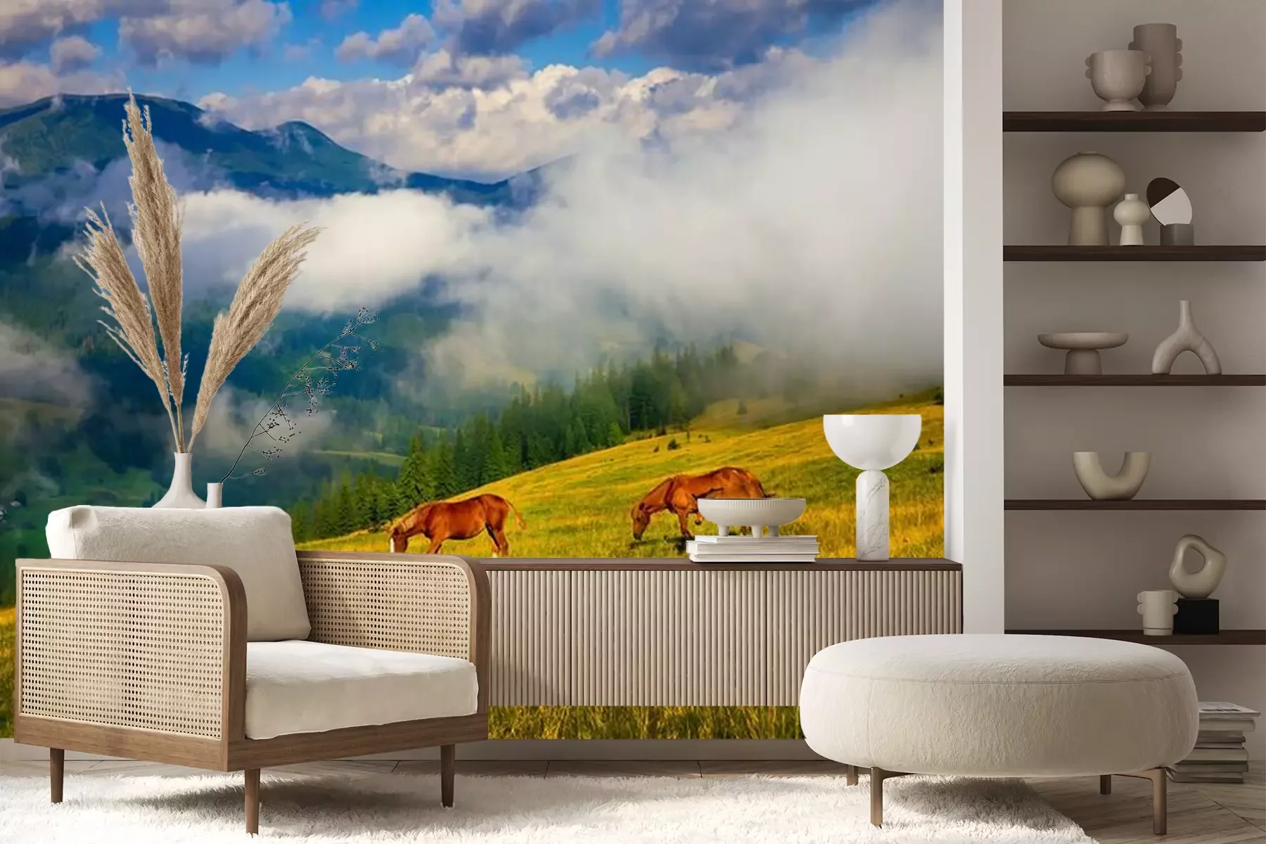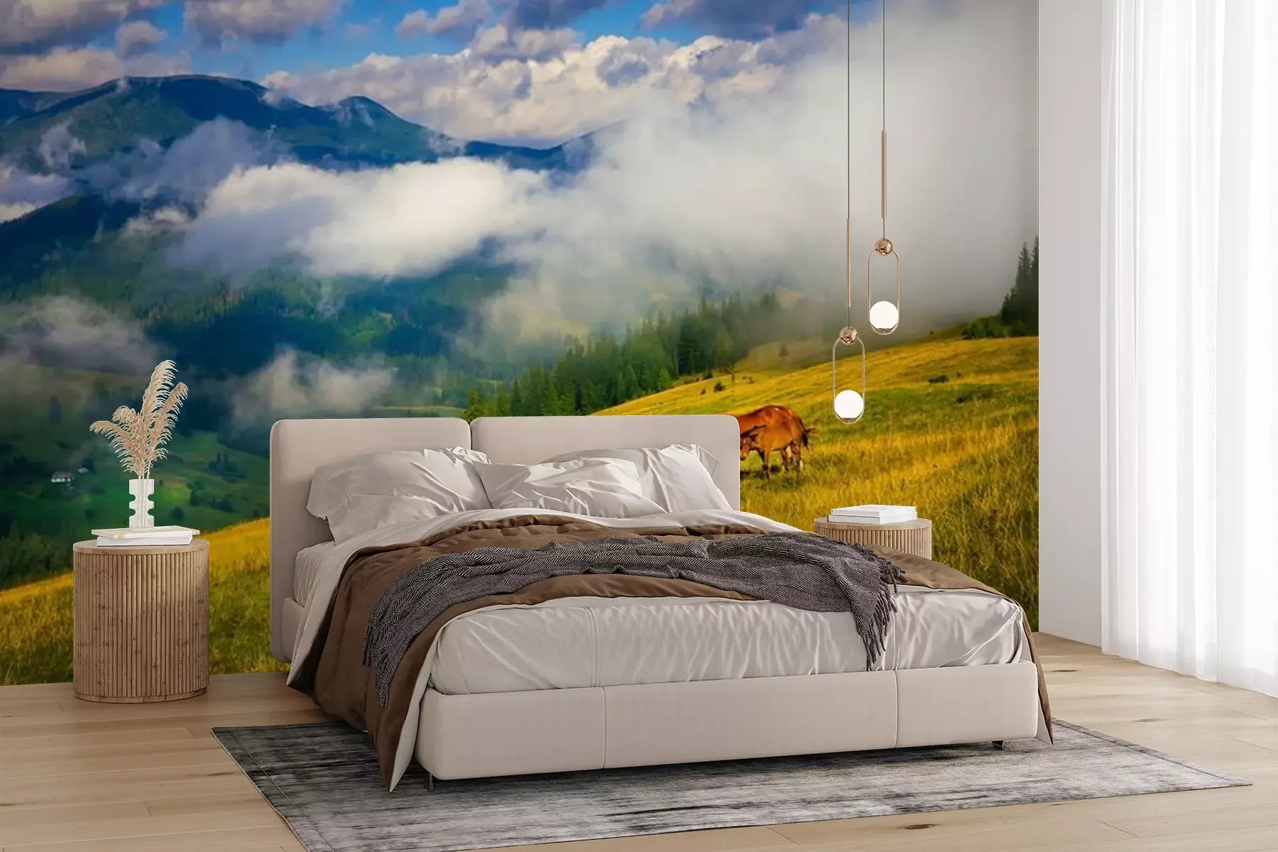 Das Material Premium+ besteht aus einer strukturierten Vinyl-Oberschicht und einem Trägermaterial (Vlies) mit einer Grammatur von 255 g/m², das kleine Unebenheiten der Wand zuverlässig kaschiert. Die feine Sandstruktur verleiht der Oberfläche eine luxuriöse Haptik, während das halbmatte Finish die Tiefe der Farben betont. Das Material ist dampfdurchlässig – so kann diese Fototapete auch in Küchen und Badezimmern eingesetzt werden. Die maximale Breite einer Tapetenbahn beträgt 100 cm. Bei größeren Abmessungen besteht die Fototapete aus mehreren gleich großen Bahnen. Der Kleber wird direkt auf die Wand aufgetragen, und die Fototapete wird auf Stoß angebracht, was für einen ästhetischen Effekt ohne sichtbare Fugen sorgt. Die Oberfläche ist pflegeleicht und kann bei Bedarf sanft mit einem feuchten Tuch abgewischt werden.