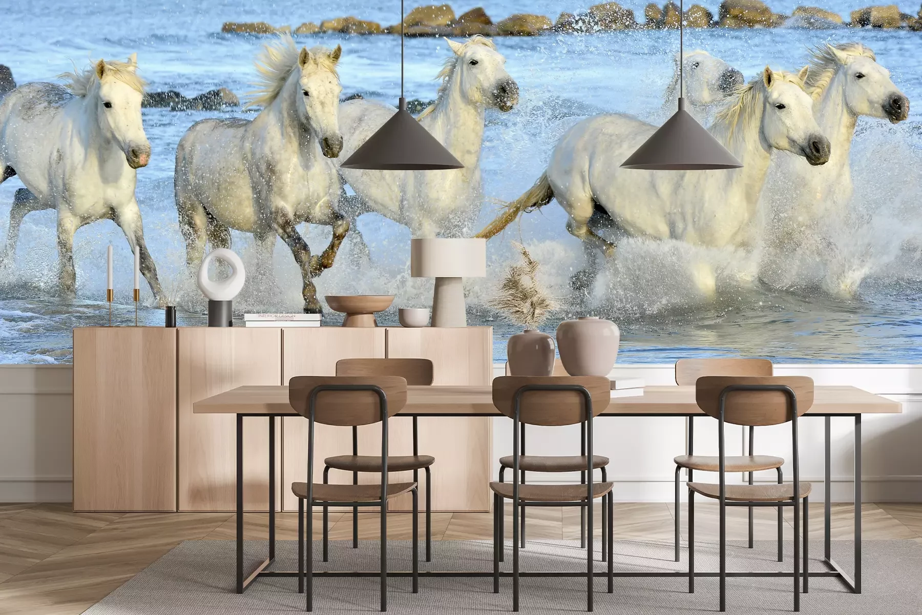 Das Material Premium+ besteht aus einer strukturierten Vinyl-Oberschicht und einem Trägermaterial (Vlies) mit einer Grammatur von 255 g/m², das kleine Unebenheiten der Wand zuverlässig kaschiert. Die feine Sandstruktur verleiht der Oberfläche eine luxuriöse Haptik, während das halbmatte Finish die Tiefe der Farben betont. Das Material ist dampfdurchlässig – so kann diese Fototapete auch in Küchen und Badezimmern eingesetzt werden. Die maximale Breite einer Tapetenbahn beträgt 100 cm. Bei größeren Abmessungen besteht die Fototapete aus mehreren gleich großen Bahnen. Der Kleber wird direkt auf die Wand aufgetragen, und die Fototapete wird auf Stoß angebracht, was für einen ästhetischen Effekt ohne sichtbare Fugen sorgt. Die Oberfläche ist pflegeleicht und kann bei Bedarf sanft mit einem feuchten Tuch abgewischt werden.