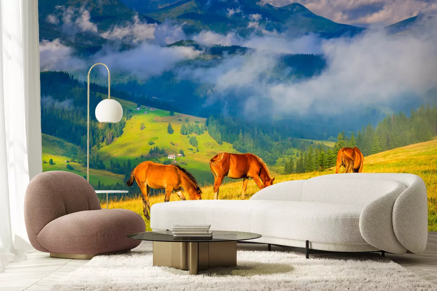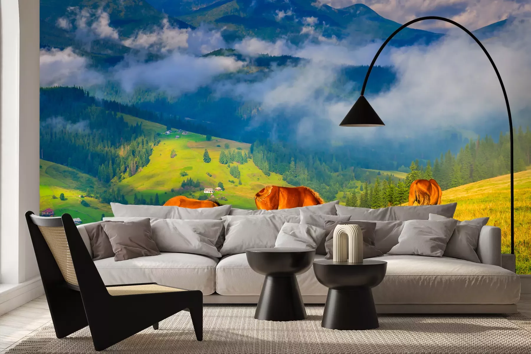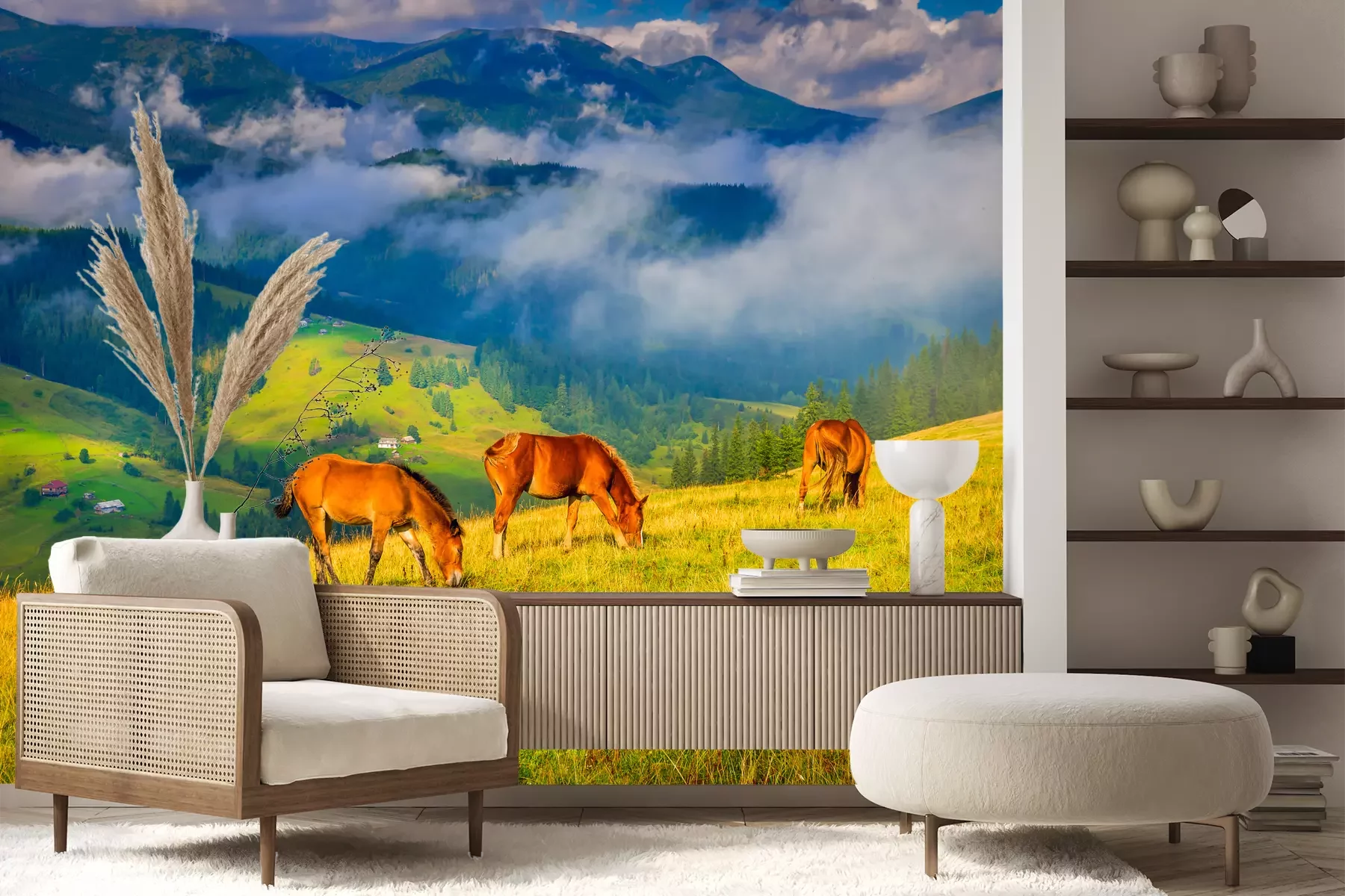 Pferde auf der Wiese an den BergenProblemlose Lieferung durch vertrauenswürdige Spediteure