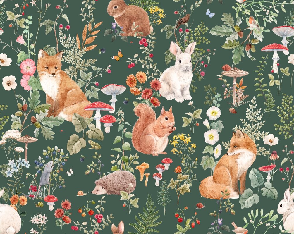 Fototapete: Pflanzenmuster mit Pilzen und Füchsen