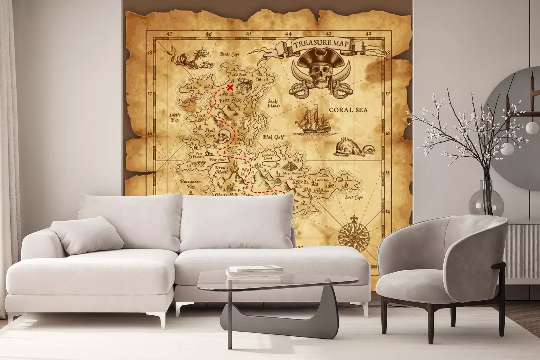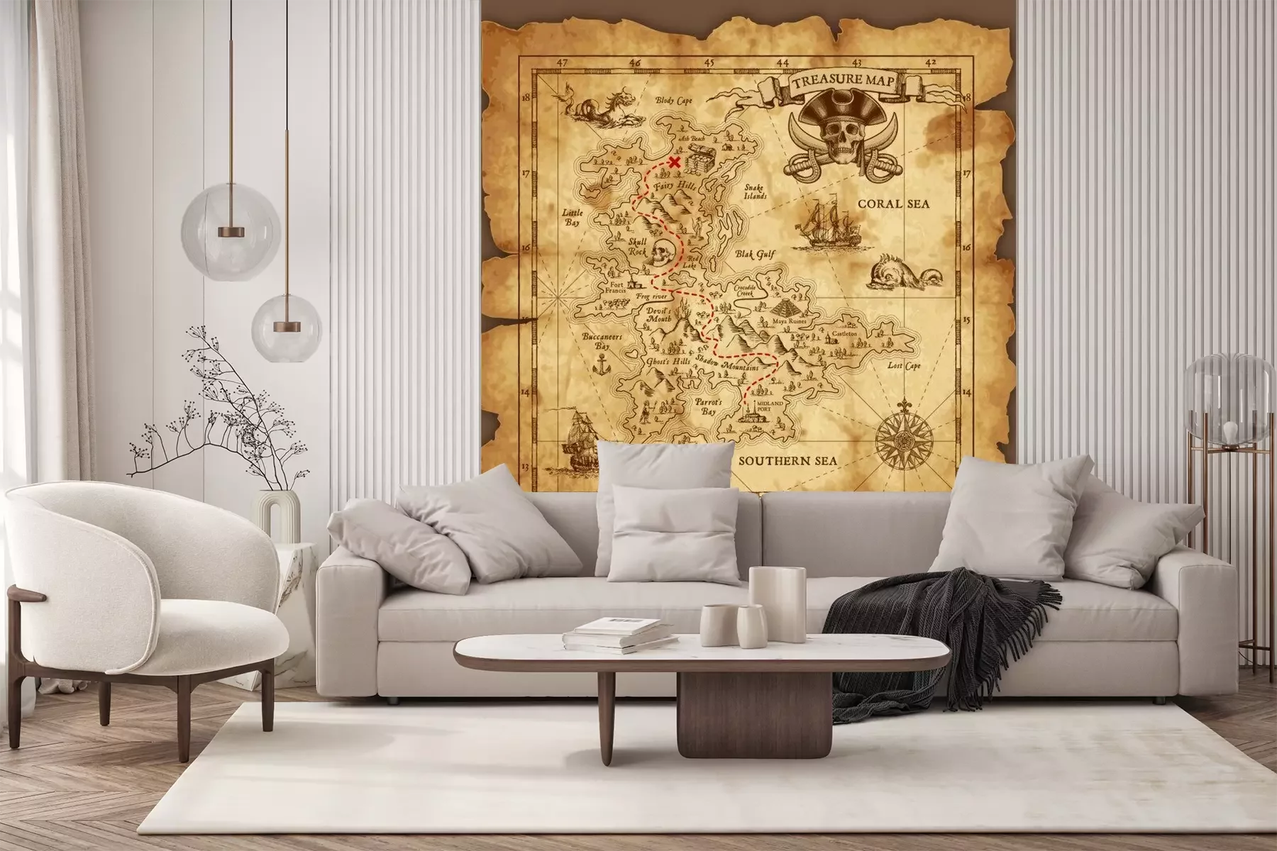Fototapete Piratenkarte mit Kompassrose, die zu einem Schatz führt