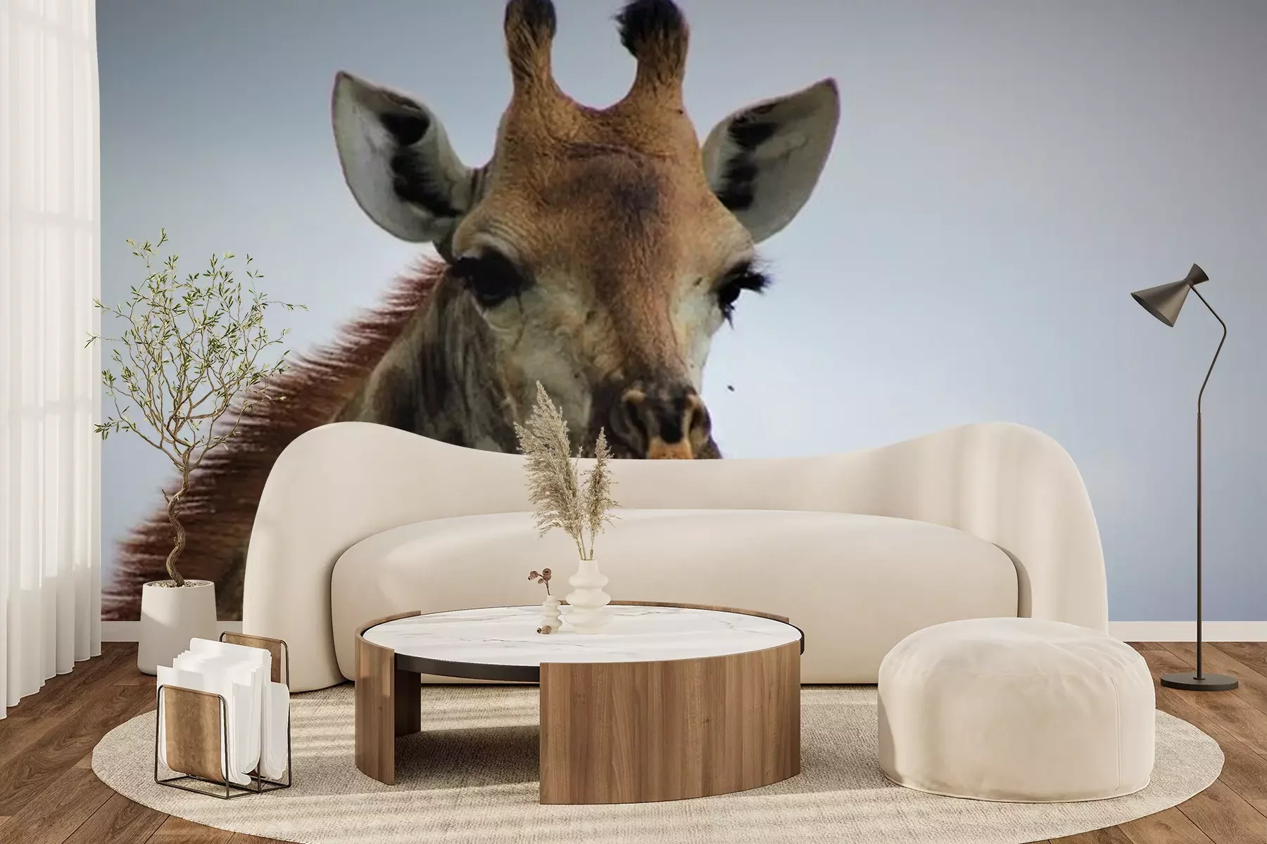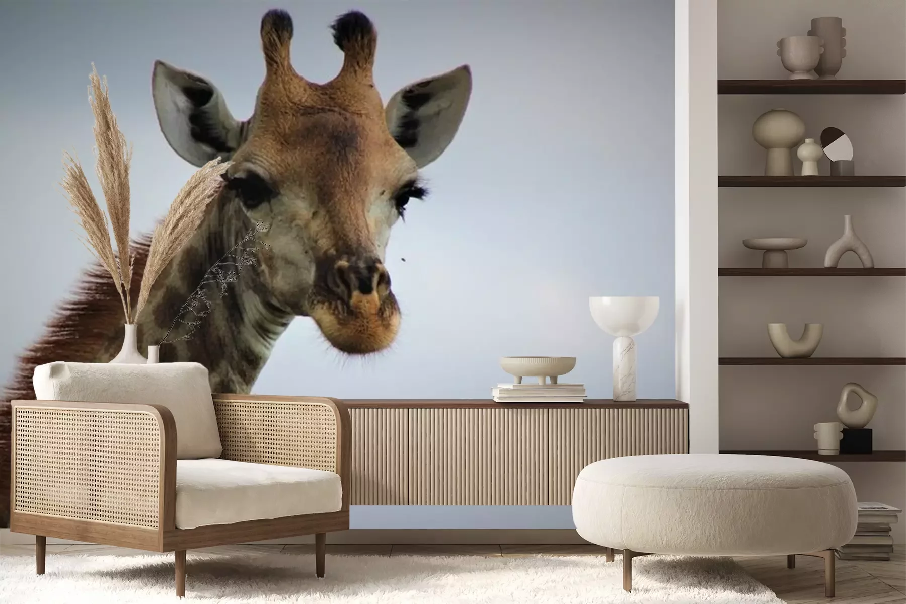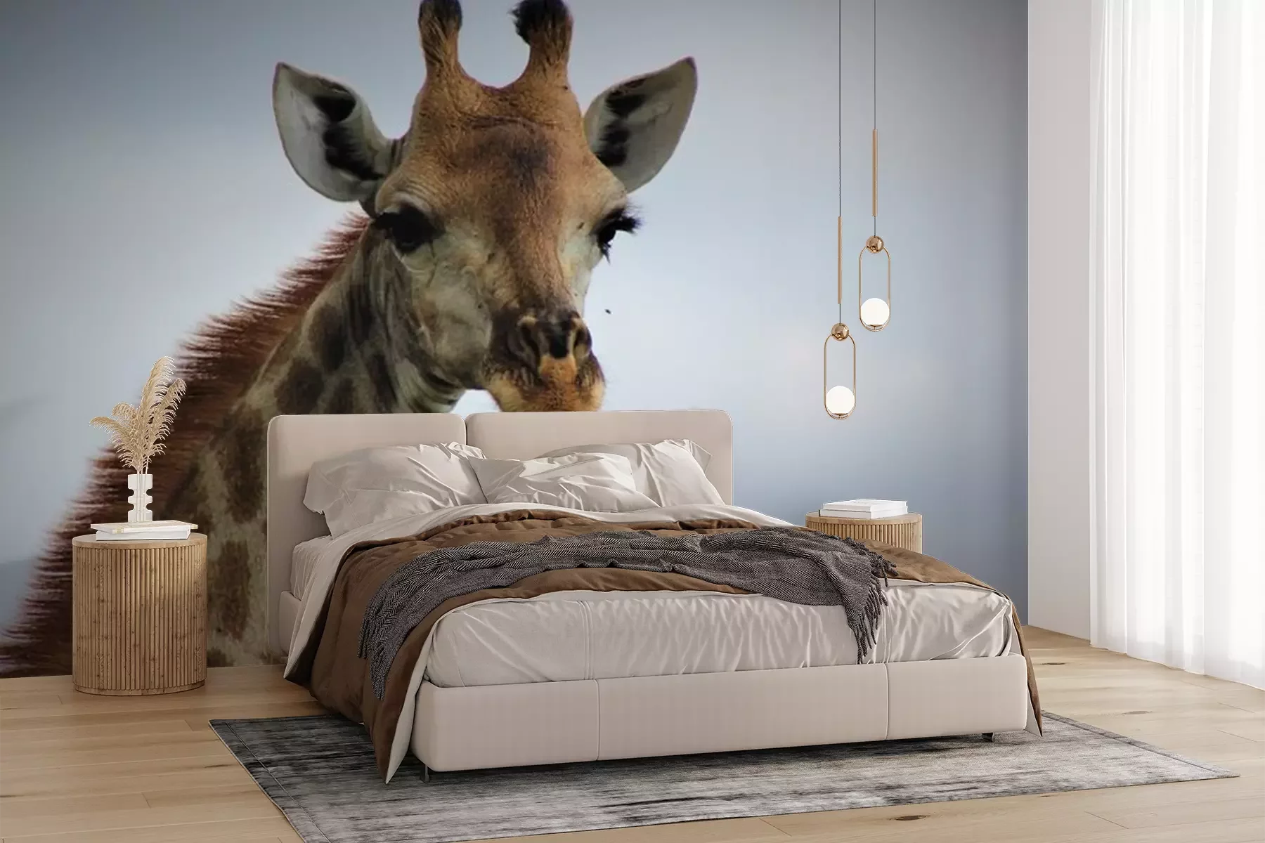 Fototapete Porträt einer Giraffe mit Wolken im Hintergrund