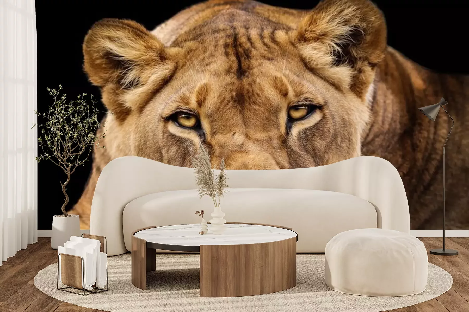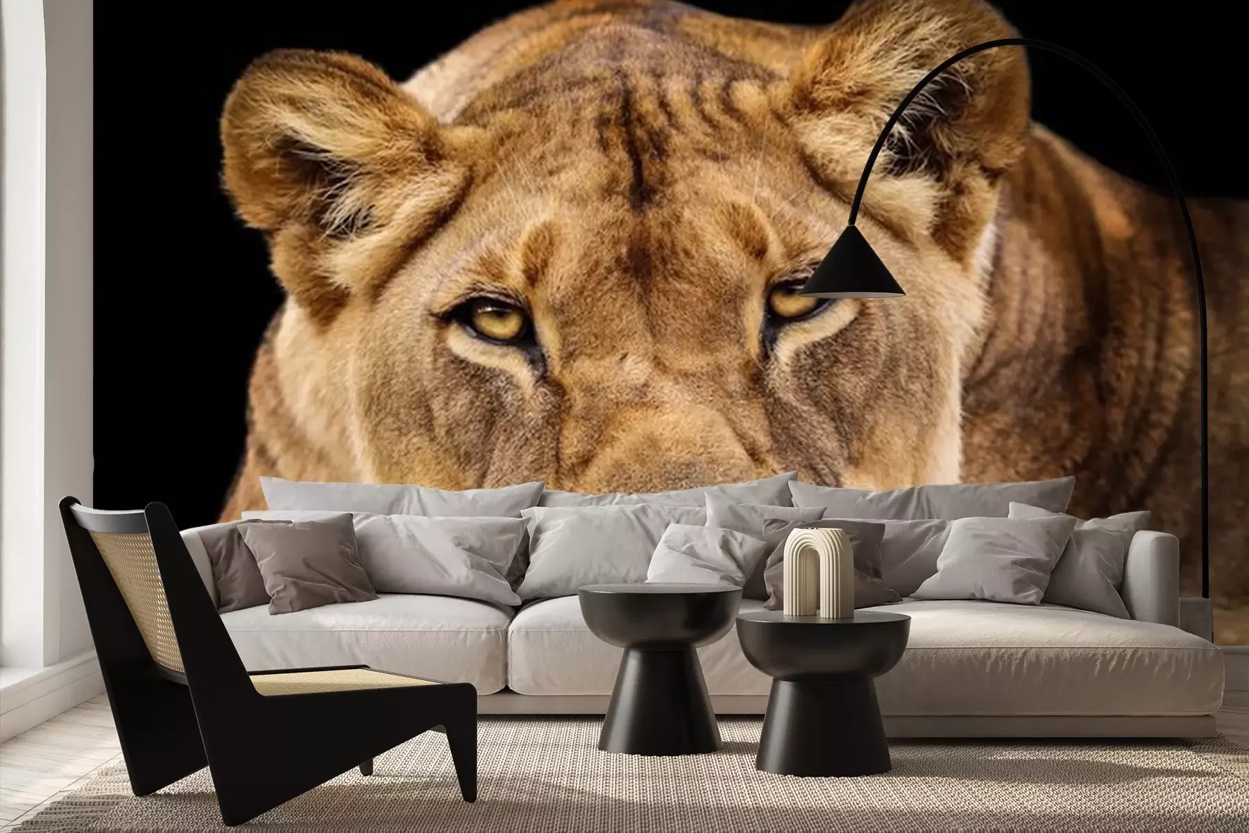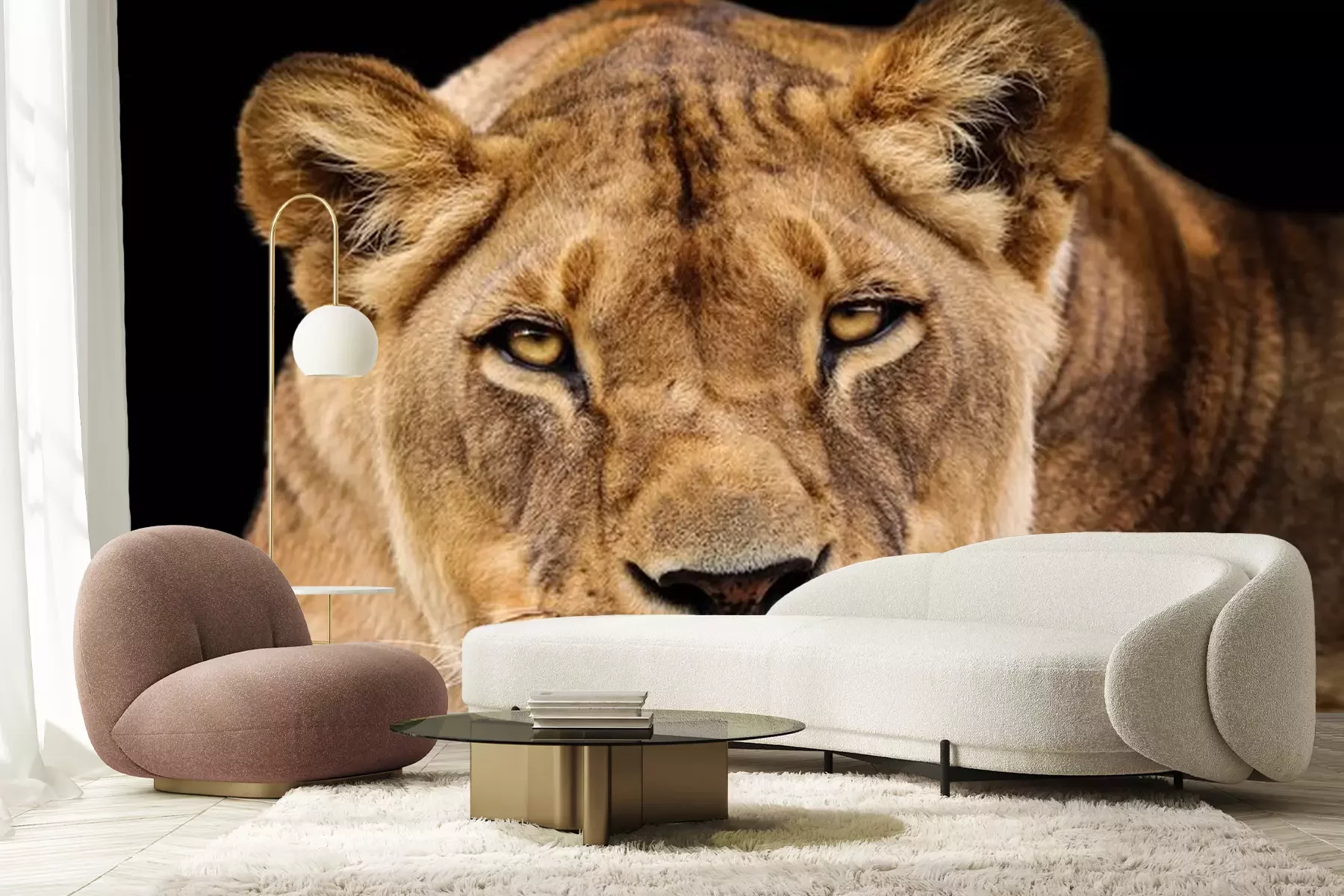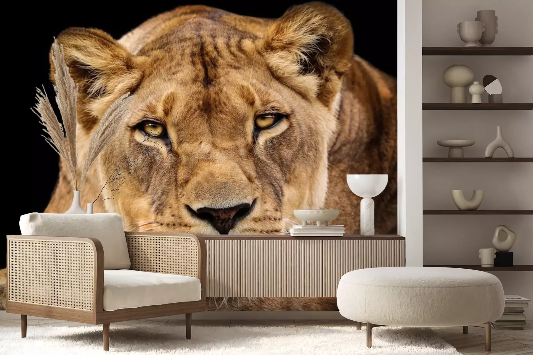 Fototapete Porträt einer Löwin auf schwarzem Hintergrund