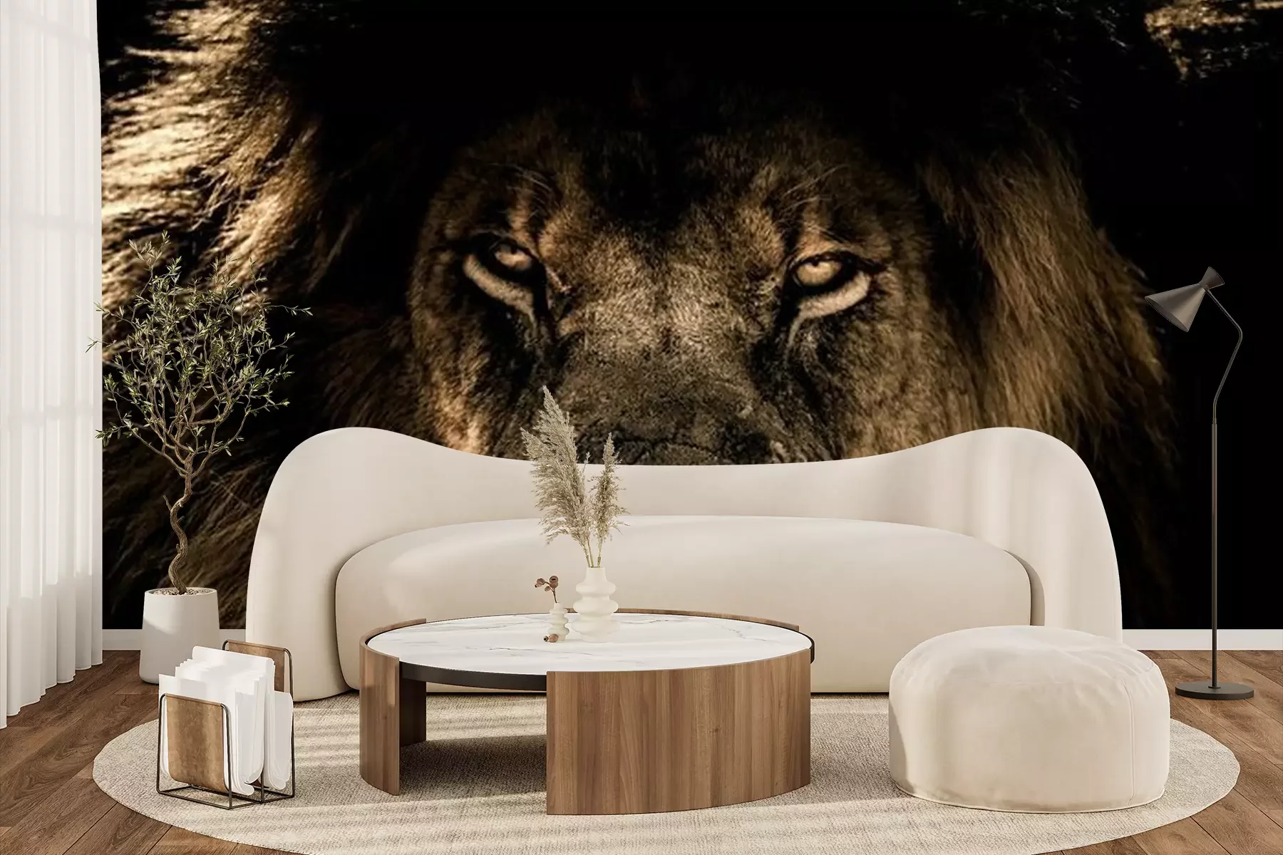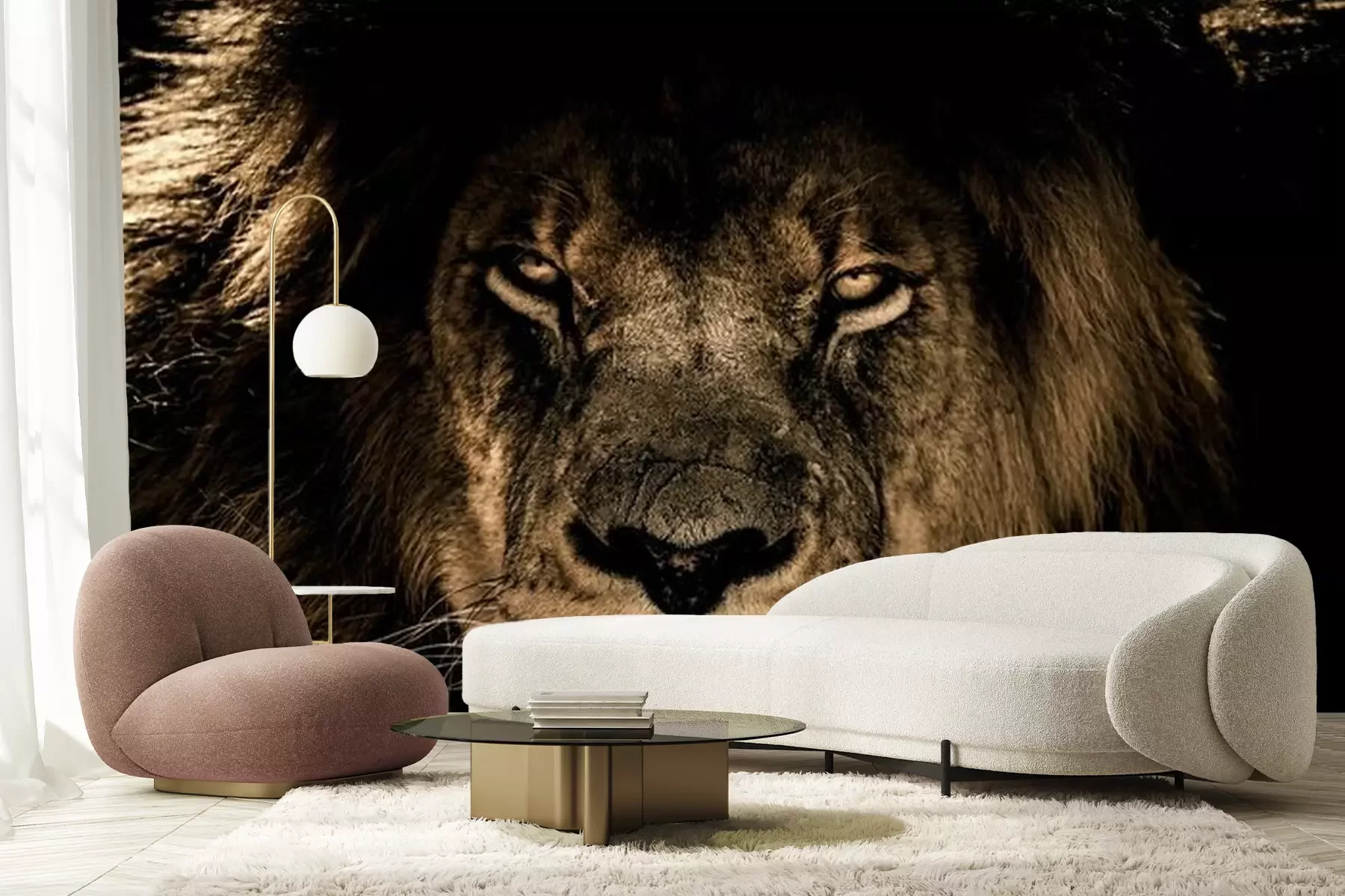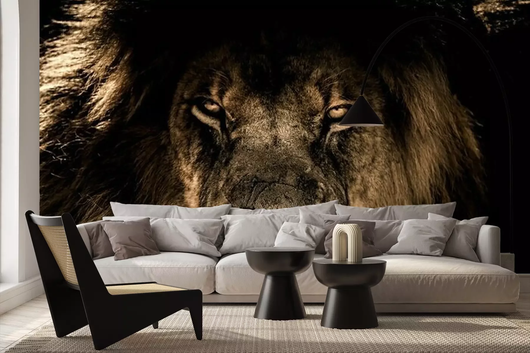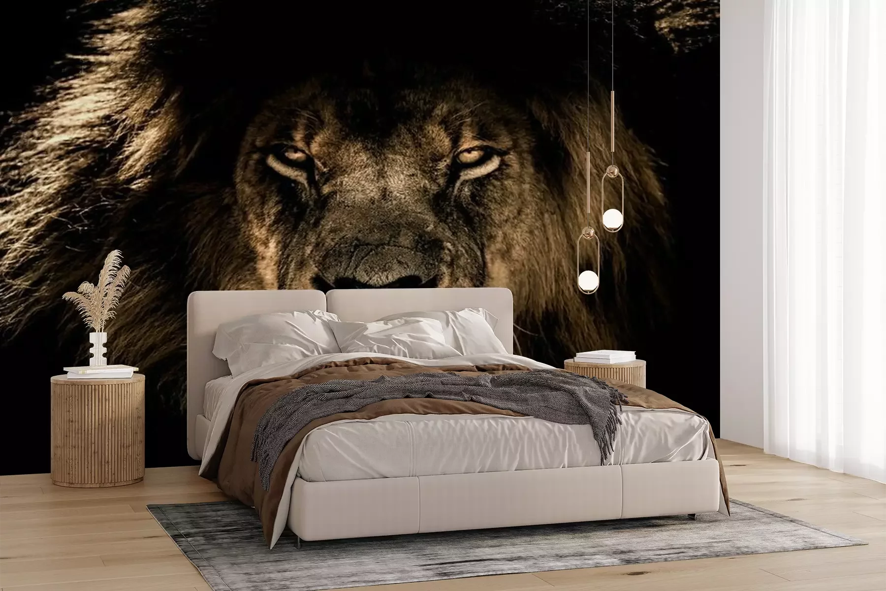 Fototapete Porträt eines Löwen mit üppiger Mähne auf schwarzem Hintergrund