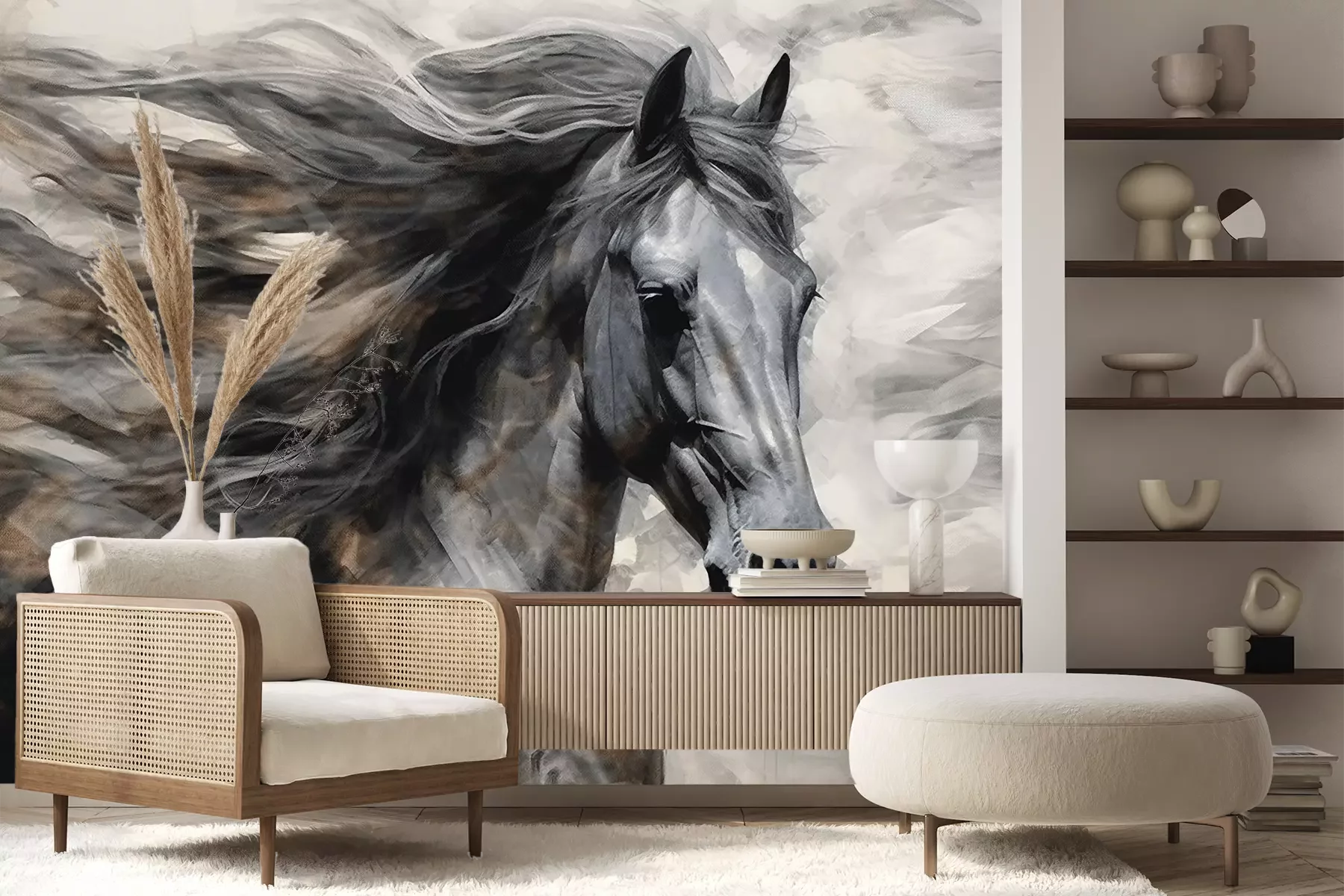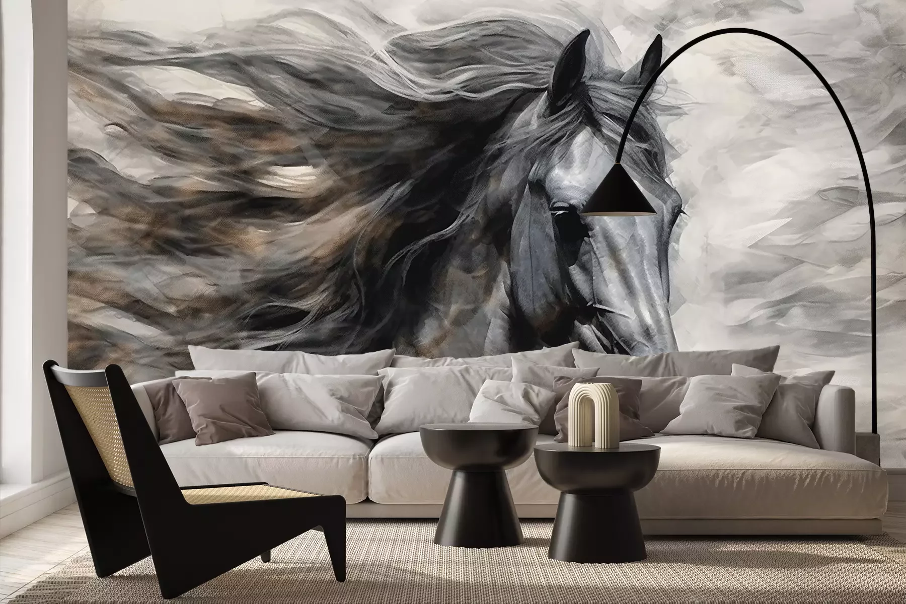 Das Material Premium+ besteht aus einer strukturierten Vinyl-Oberschicht und einem Trägermaterial (Vlies) mit einer Grammatur von 255 g/m², das kleine Unebenheiten der Wand zuverlässig kaschiert. Die feine Sandstruktur verleiht der Oberfläche eine luxuriöse Haptik, während das halbmatte Finish die Tiefe der Farben betont. Das Material ist dampfdurchlässig – so kann diese Fototapete auch in Küchen und Badezimmern eingesetzt werden. Die maximale Breite einer Tapetenbahn beträgt 100 cm. Bei größeren Abmessungen besteht die Fototapete aus mehreren gleich großen Bahnen. Der Kleber wird direkt auf die Wand aufgetragen, und die Fototapete wird auf Stoß angebracht, was für einen ästhetischen Effekt ohne sichtbare Fugen sorgt. Die Oberfläche ist pflegeleicht und kann bei Bedarf sanft mit einem feuchten Tuch abgewischt werden.