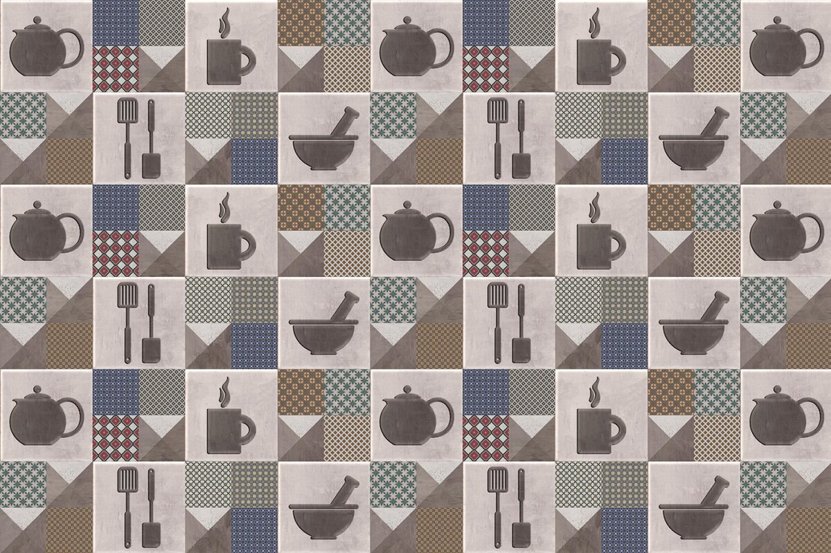 Fototapete: Quadratische Fliesen mit Küchenutensilien