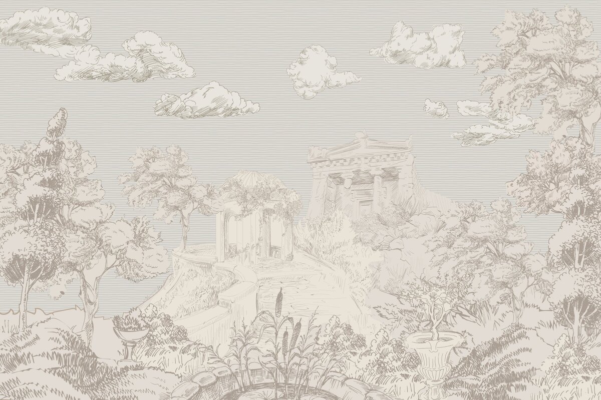 Fototapete: Römische Architektur inmitten von Pflanzen im Skizzenstil