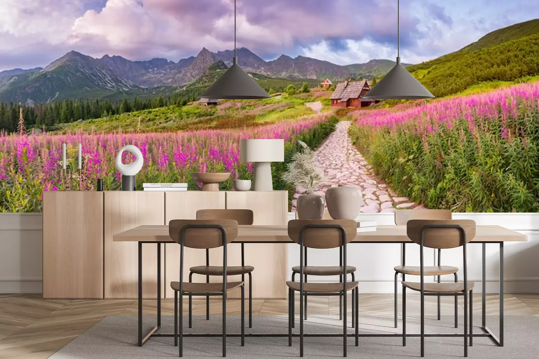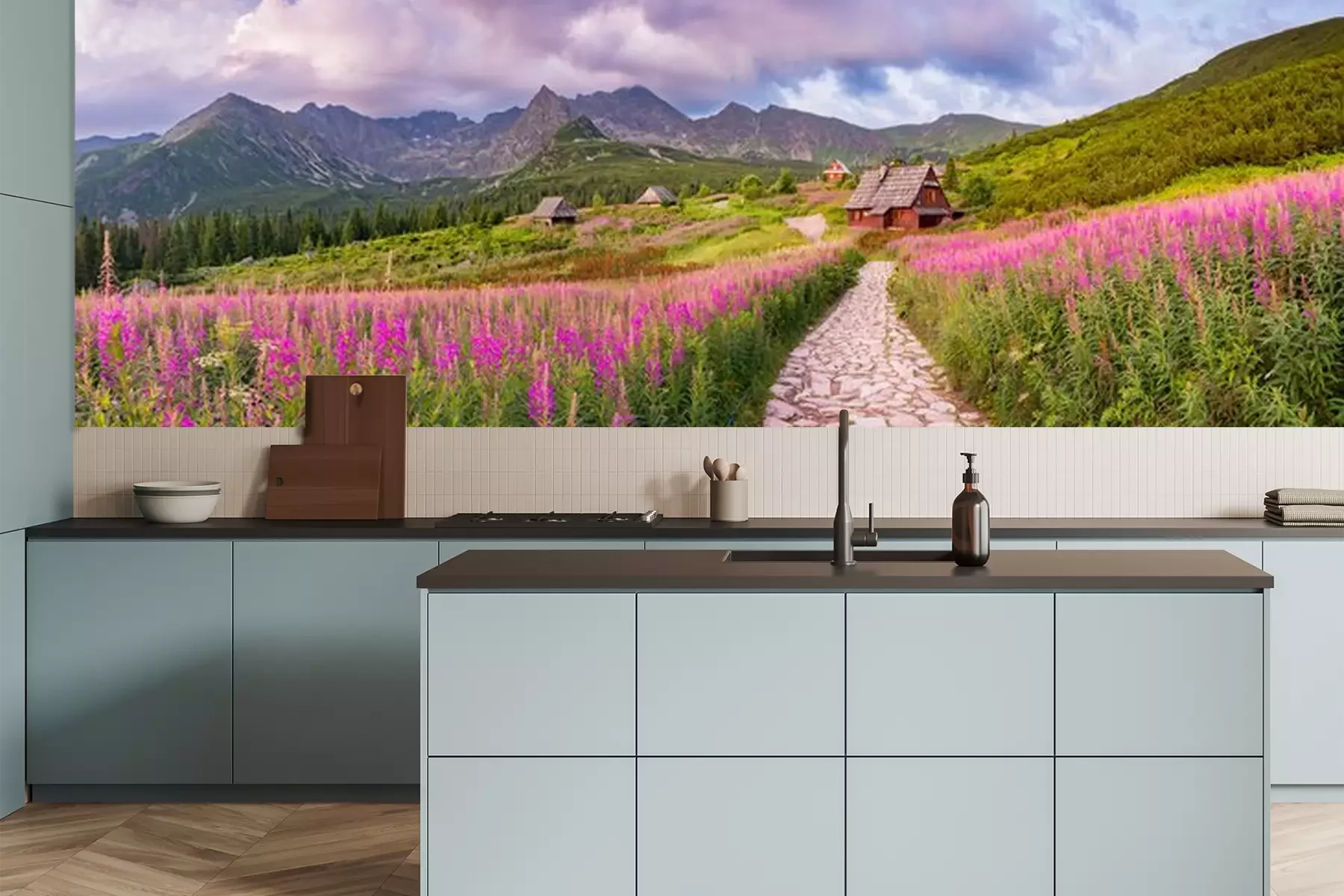 Fototapete Rosa Blumen auf der Wiese in den Bergen