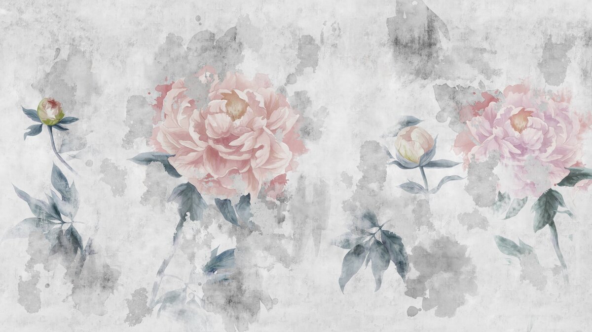 Fototapete: Rosa Blumen im Aquarellstil auf grauem Hintergrund