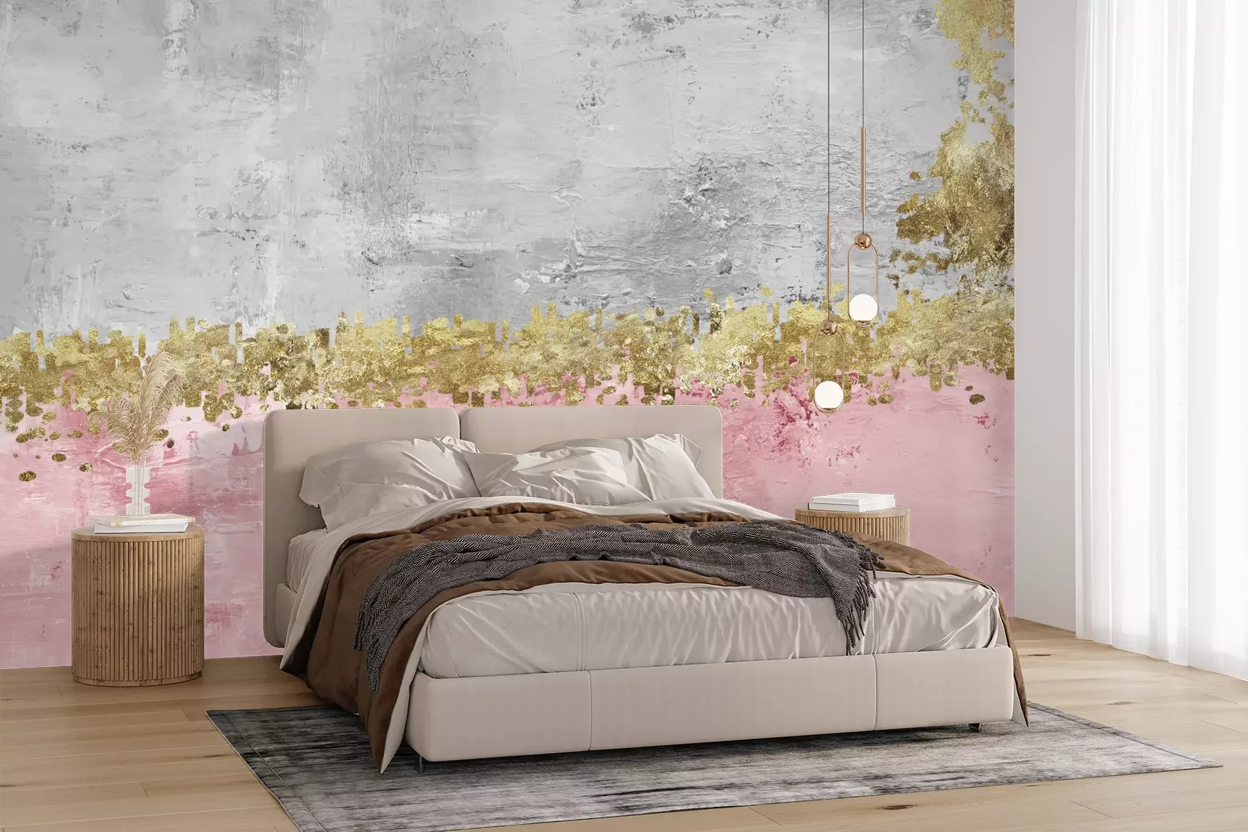 Das Material Premium+ besteht aus einer strukturierten Vinyl-Oberschicht und einem Trägermaterial (Vlies) mit einer Grammatur von 255 g/m², das kleine Unebenheiten der Wand zuverlässig kaschiert. Die feine Sandstruktur verleiht der Oberfläche eine luxuriöse Haptik, während das halbmatte Finish die Tiefe der Farben betont. Das Material ist dampfdurchlässig – so kann diese Fototapete auch in Küchen und Badezimmern eingesetzt werden. Die maximale Breite einer Tapetenbahn beträgt 100 cm. Bei größeren Abmessungen besteht die Fototapete aus mehreren gleich großen Bahnen. Der Kleber wird direkt auf die Wand aufgetragen, und die Fototapete wird auf Stoß angebracht, was für einen ästhetischen Effekt ohne sichtbare Fugen sorgt. Die Oberfläche ist pflegeleicht und kann bei Bedarf sanft mit einem feuchten Tuch abgewischt werden.