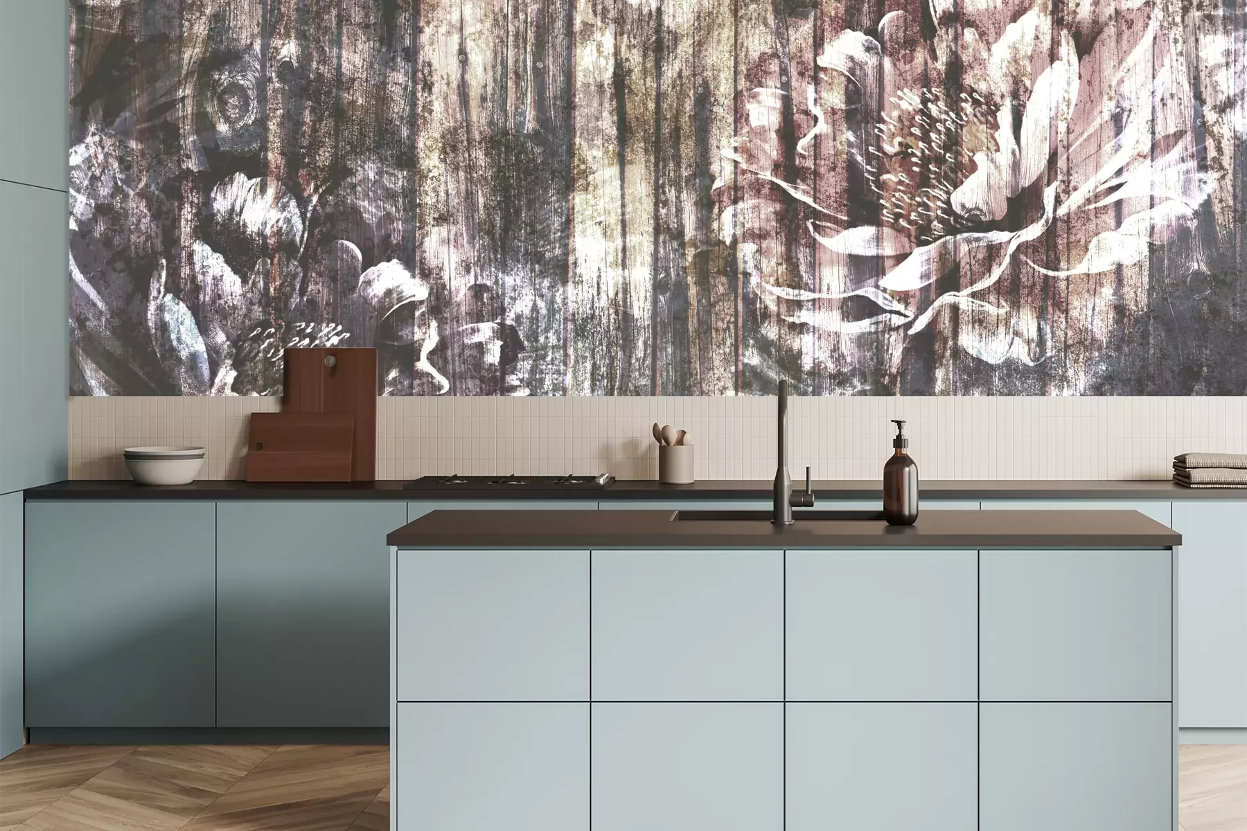 Das Material Premium+ besteht aus einer strukturierten Vinyl-Oberschicht und einem Trägermaterial (Vlies) mit einer Grammatur von 255 g/m², das kleine Unebenheiten der Wand zuverlässig kaschiert. Die feine Sandstruktur verleiht der Oberfläche eine luxuriöse Haptik, während das halbmatte Finish die Tiefe der Farben betont. Das Material ist dampfdurchlässig – so kann diese Fototapete auch in Küchen und Badezimmern eingesetzt werden. Die maximale Breite einer Tapetenbahn beträgt 100 cm. Bei größeren Abmessungen besteht die Fototapete aus mehreren gleich großen Bahnen. Der Kleber wird direkt auf die Wand aufgetragen, und die Fototapete wird auf Stoß angebracht, was für einen ästhetischen Effekt ohne sichtbare Fugen sorgt. Die Oberfläche ist pflegeleicht und kann bei Bedarf sanft mit einem feuchten Tuch abgewischt werden.