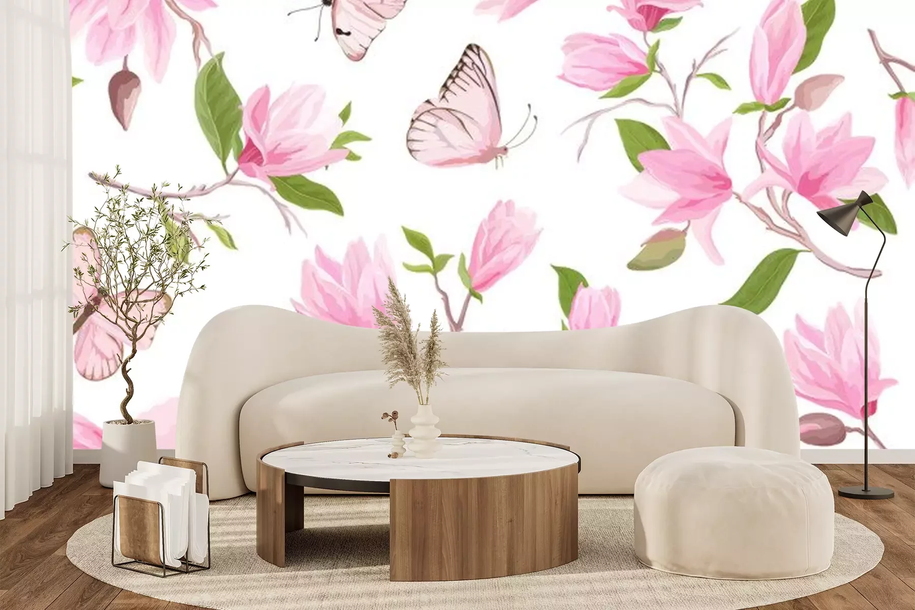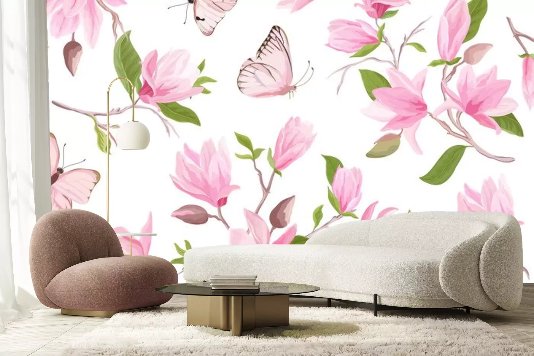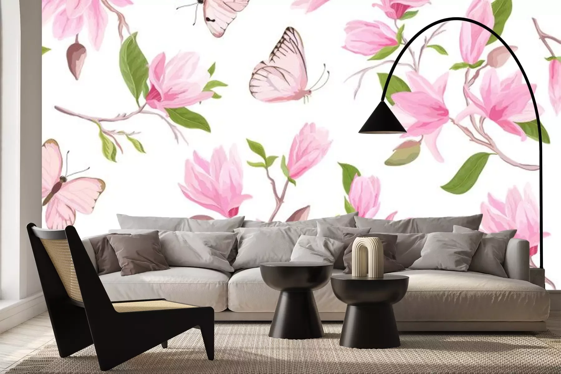 Fototapete Rosa Schmetterlinge inmitten von Magnolienblüten