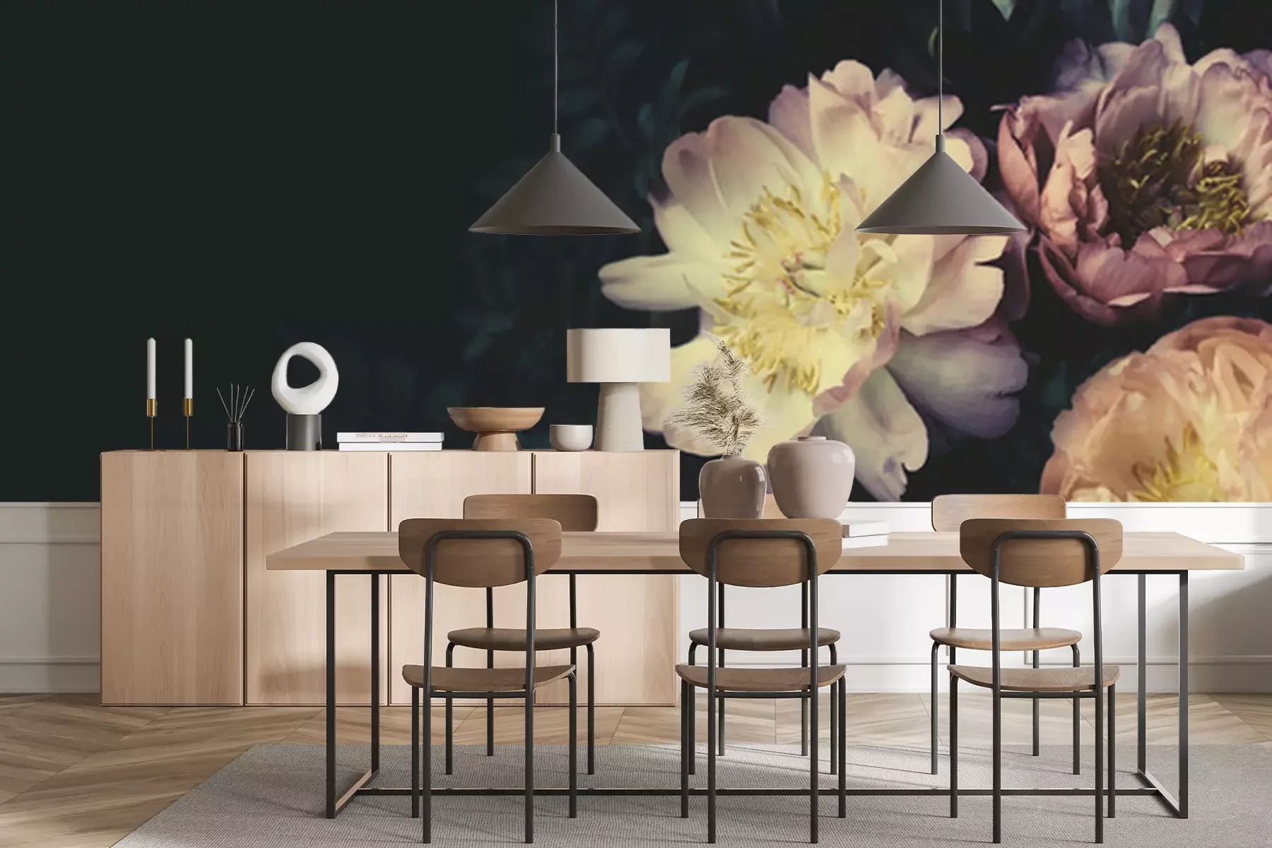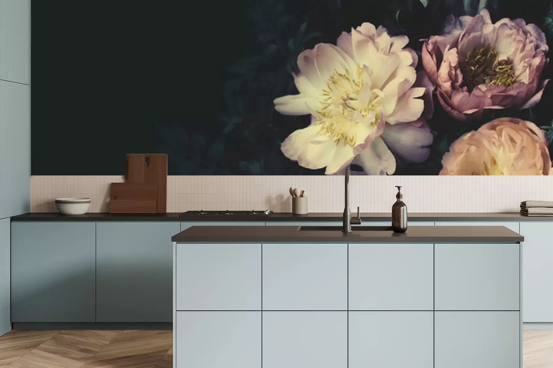Fototapete Rosa und orange Pfingstrosen auf dunklem Hintergrund
