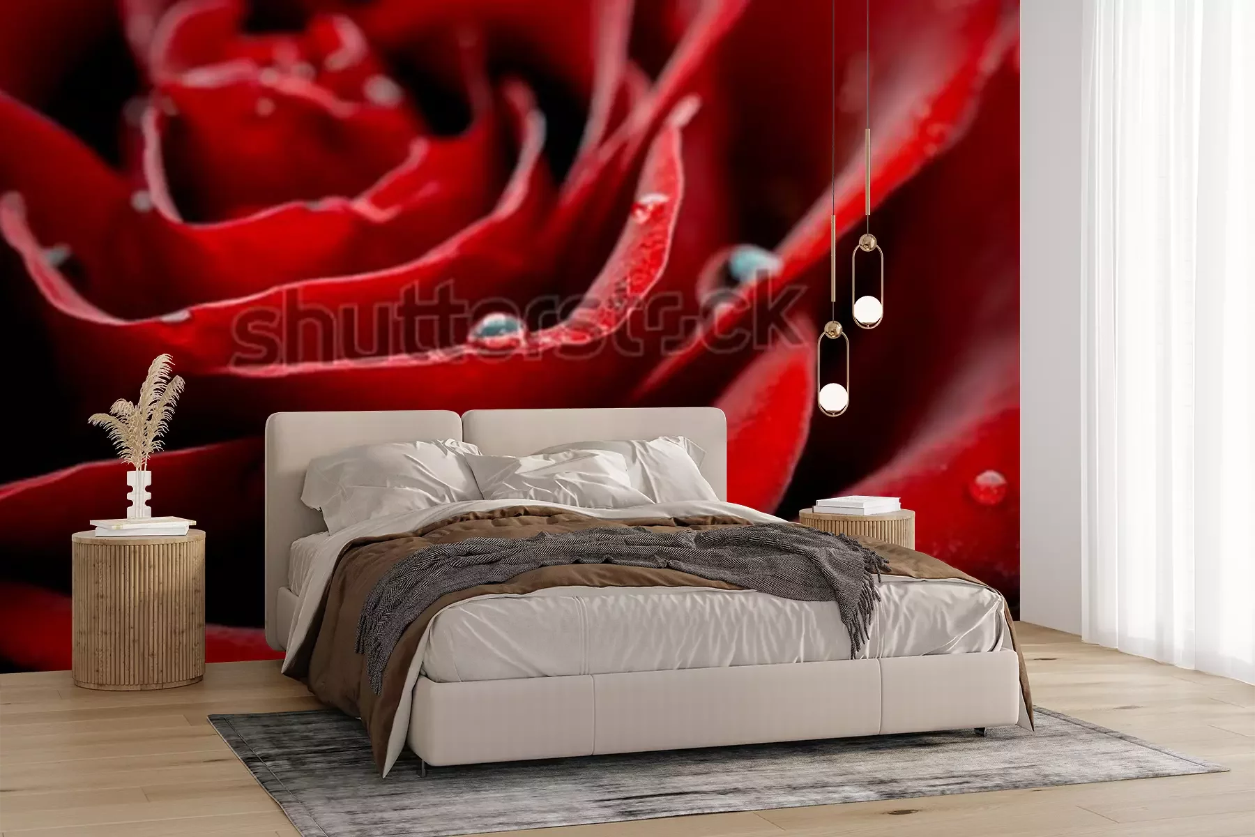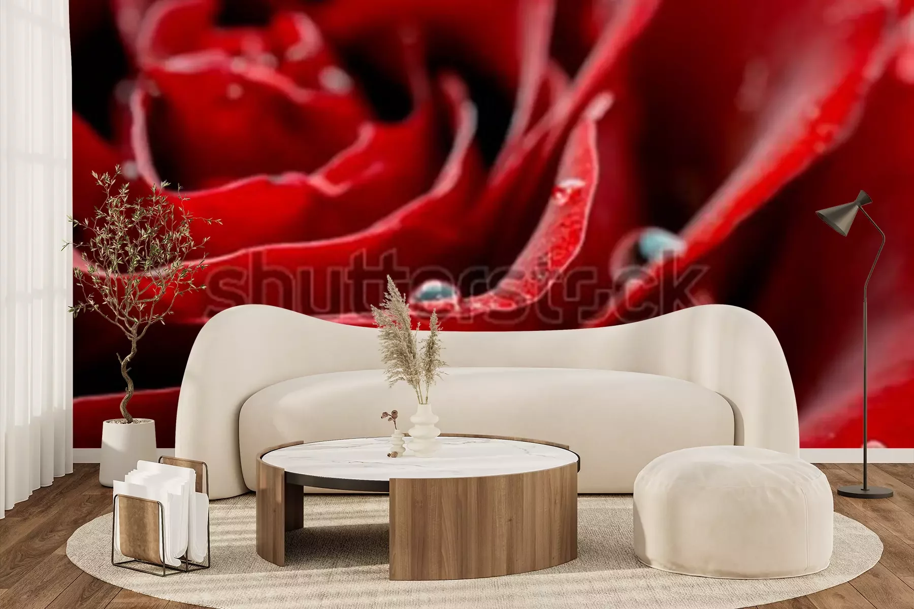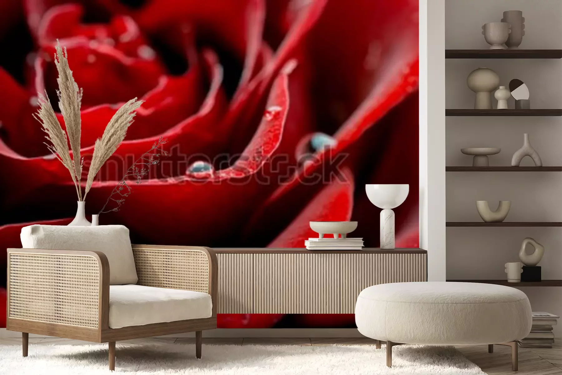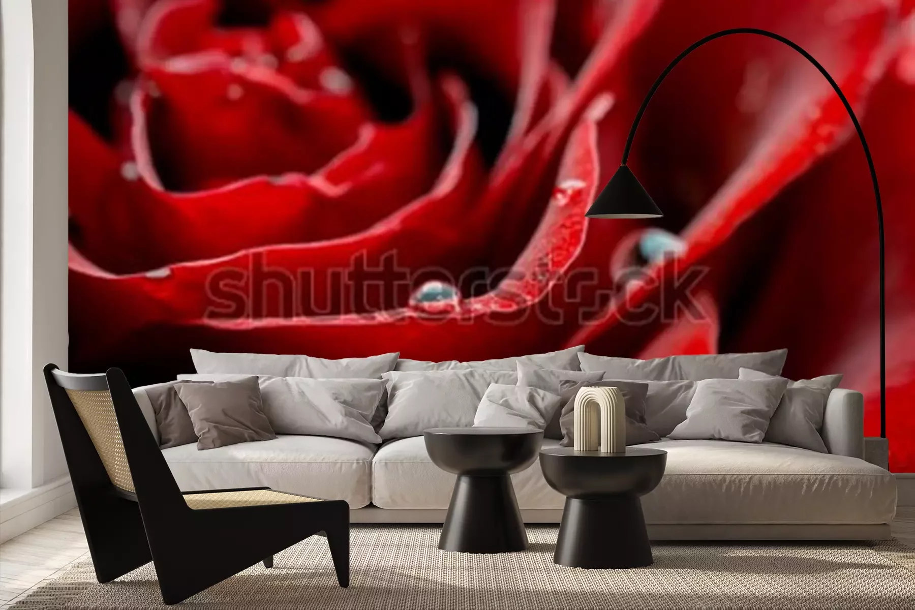 Fototapete Rote Rosenblütenblätter und Tropfen