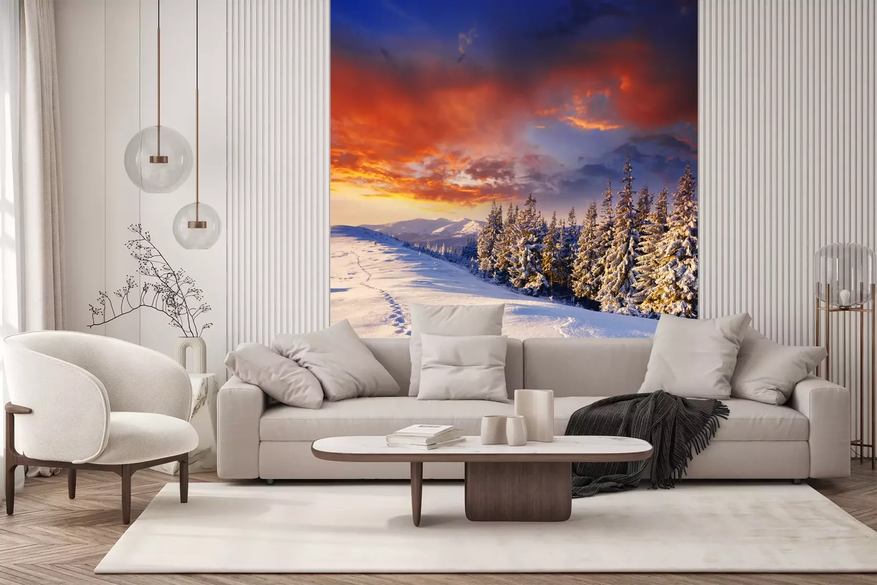 Die Fototapeten werden in Bahnen geliefert. Die Größe und die Anzahl der Bahnen, aus denen die gesamte Fototapete besteht, hängen vom gewählten Material ab. Wenn die Größe die maximale Breite des Materials überschreitet, besteht der Ausdruck aus mehreren gleich großen Bahnen.