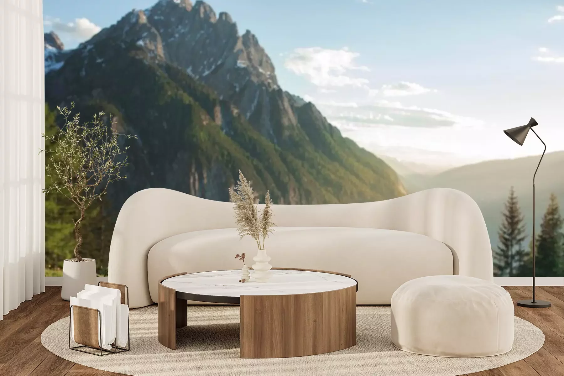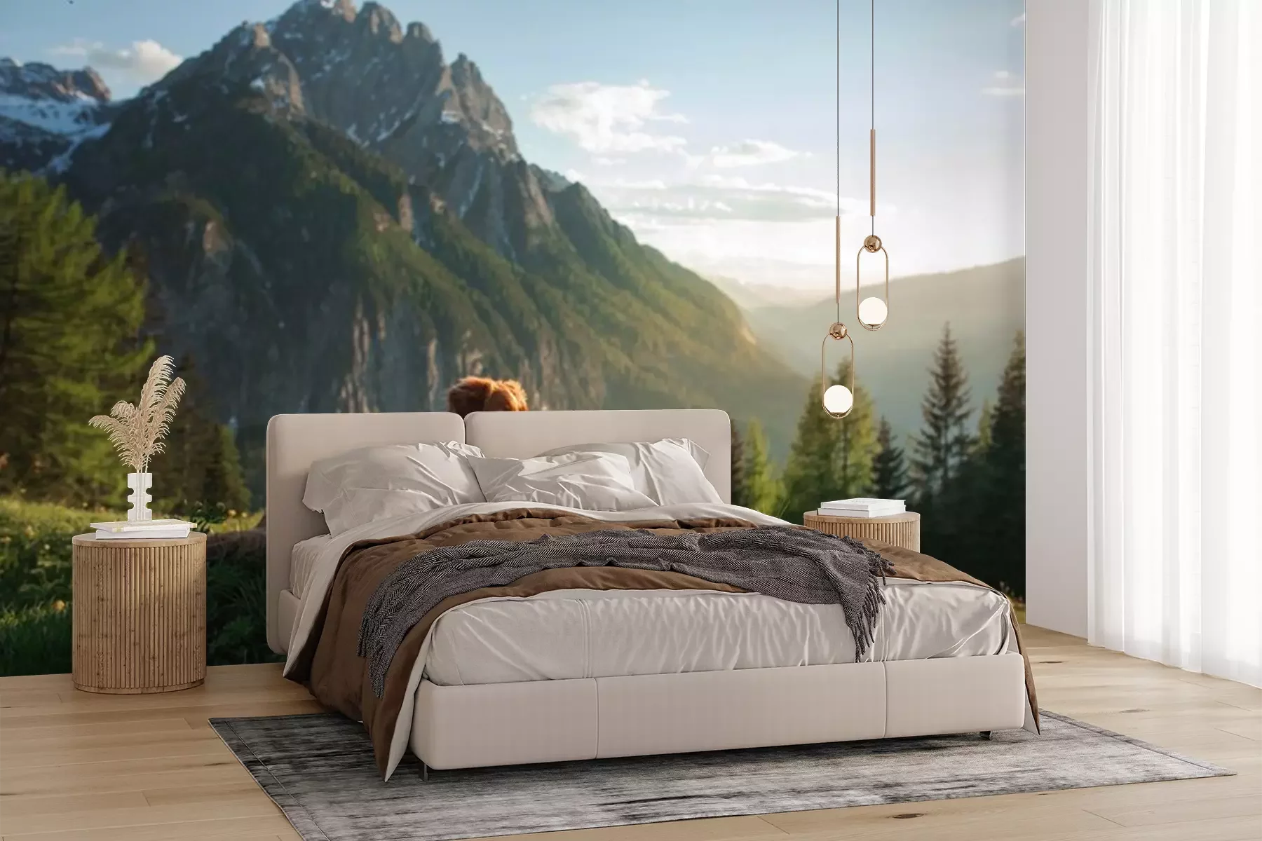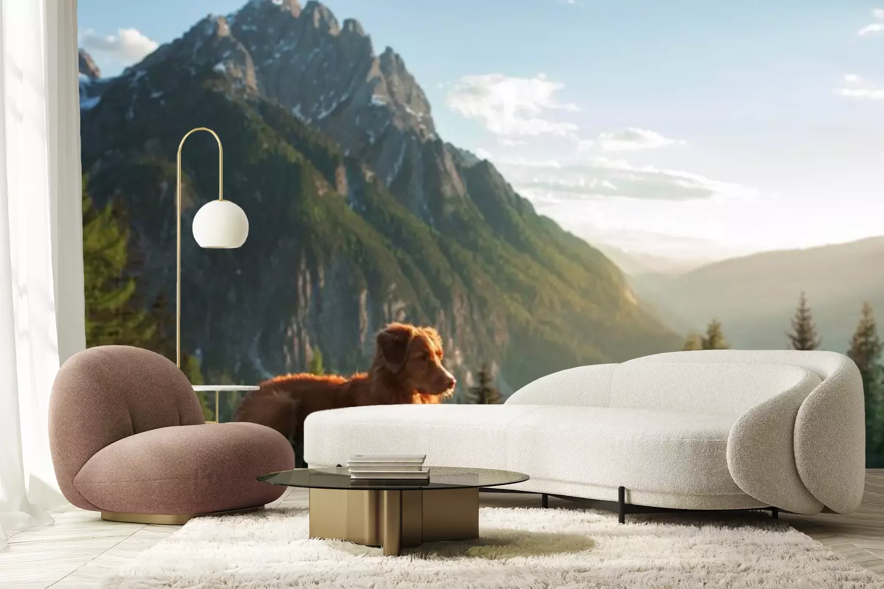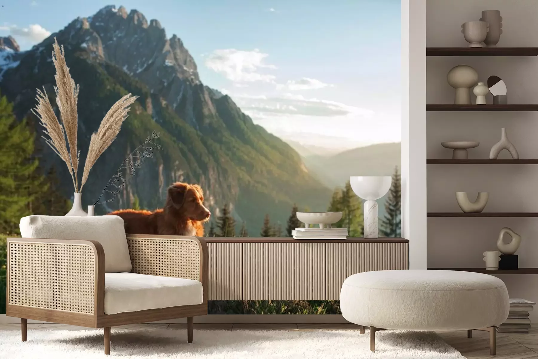 Fototapete Ruhender Hund mit Berglandschaft im Hintergrund