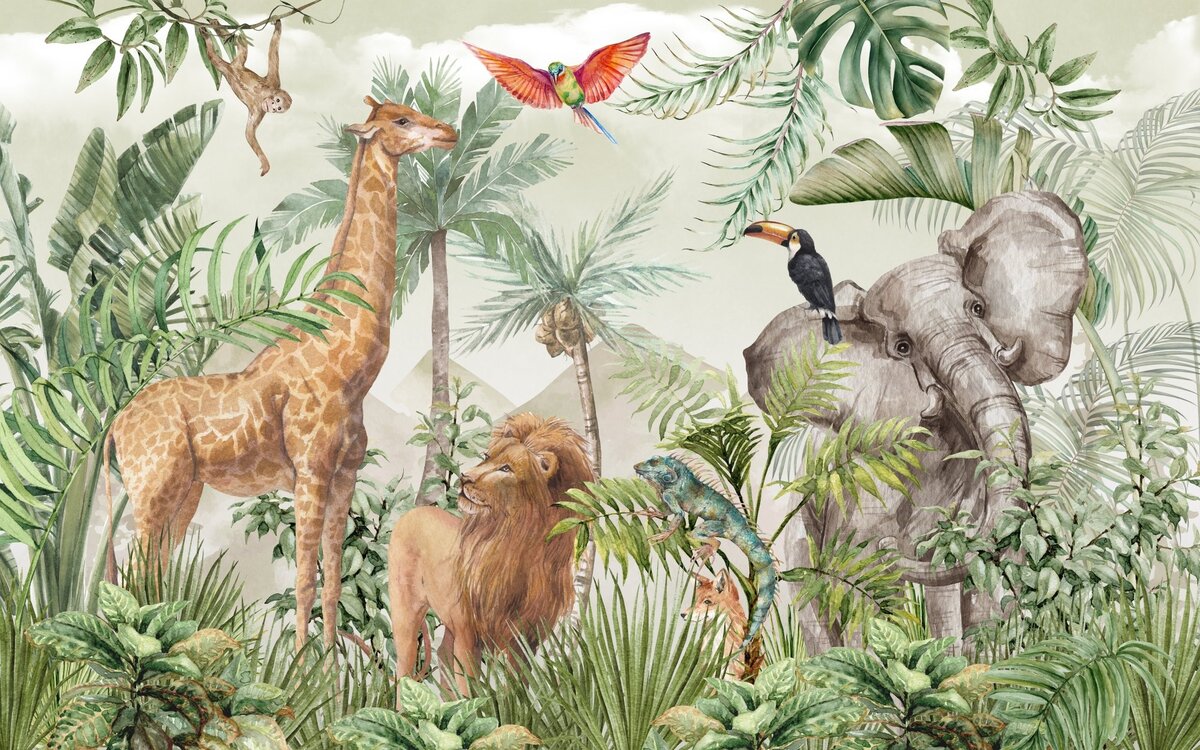 Fototapete: Safari-Tiere und exotische Vögel im tropischen Dschungel Aquarell