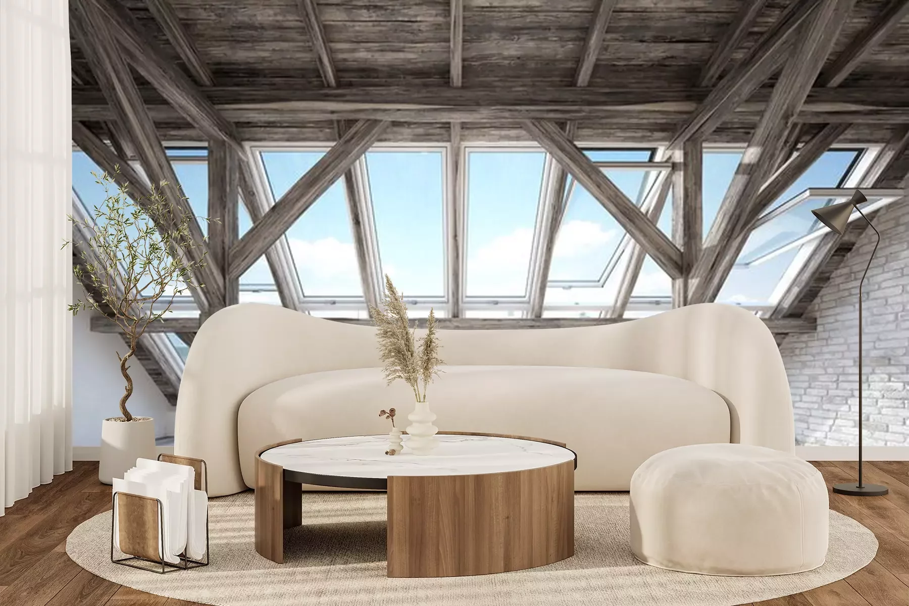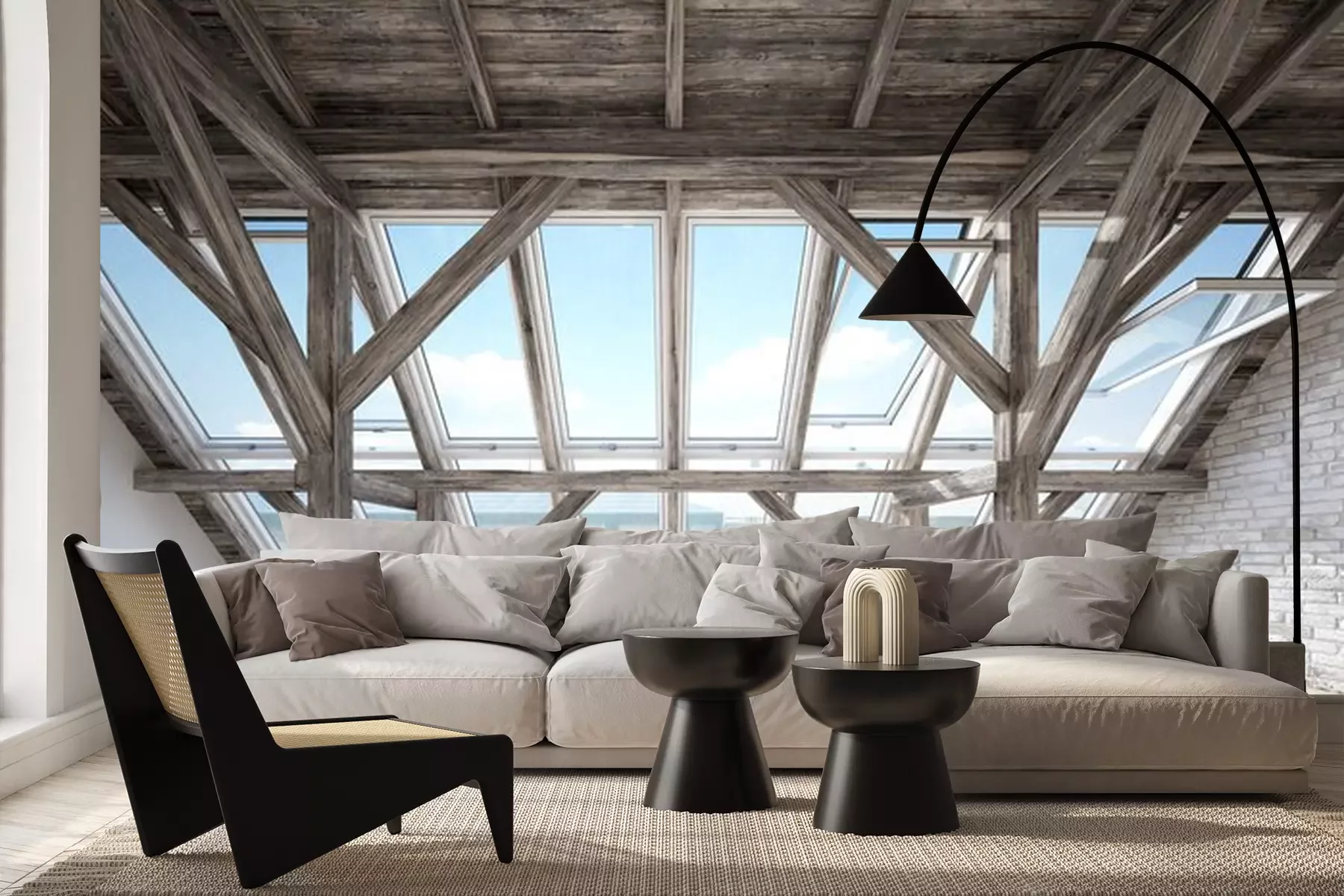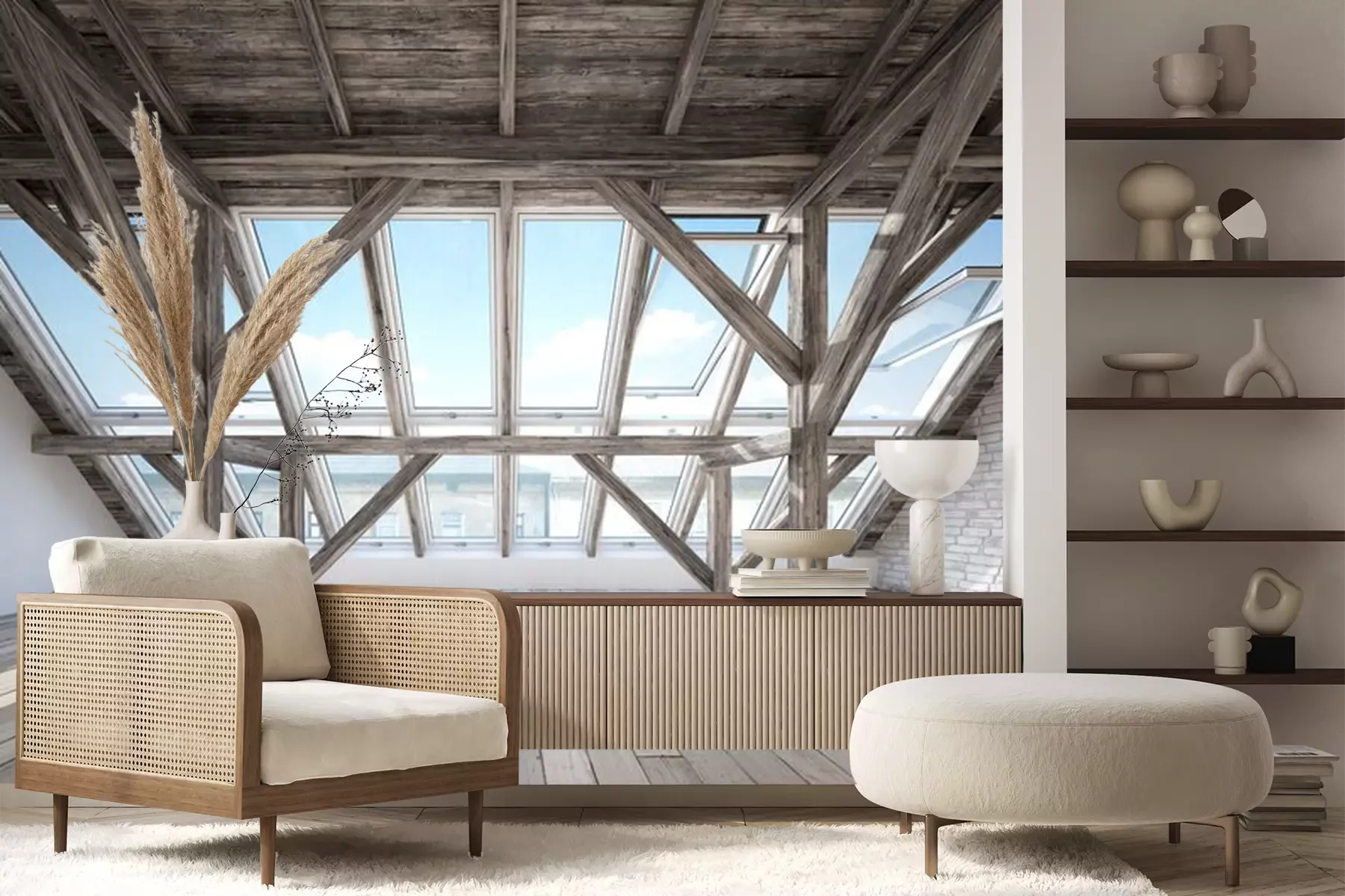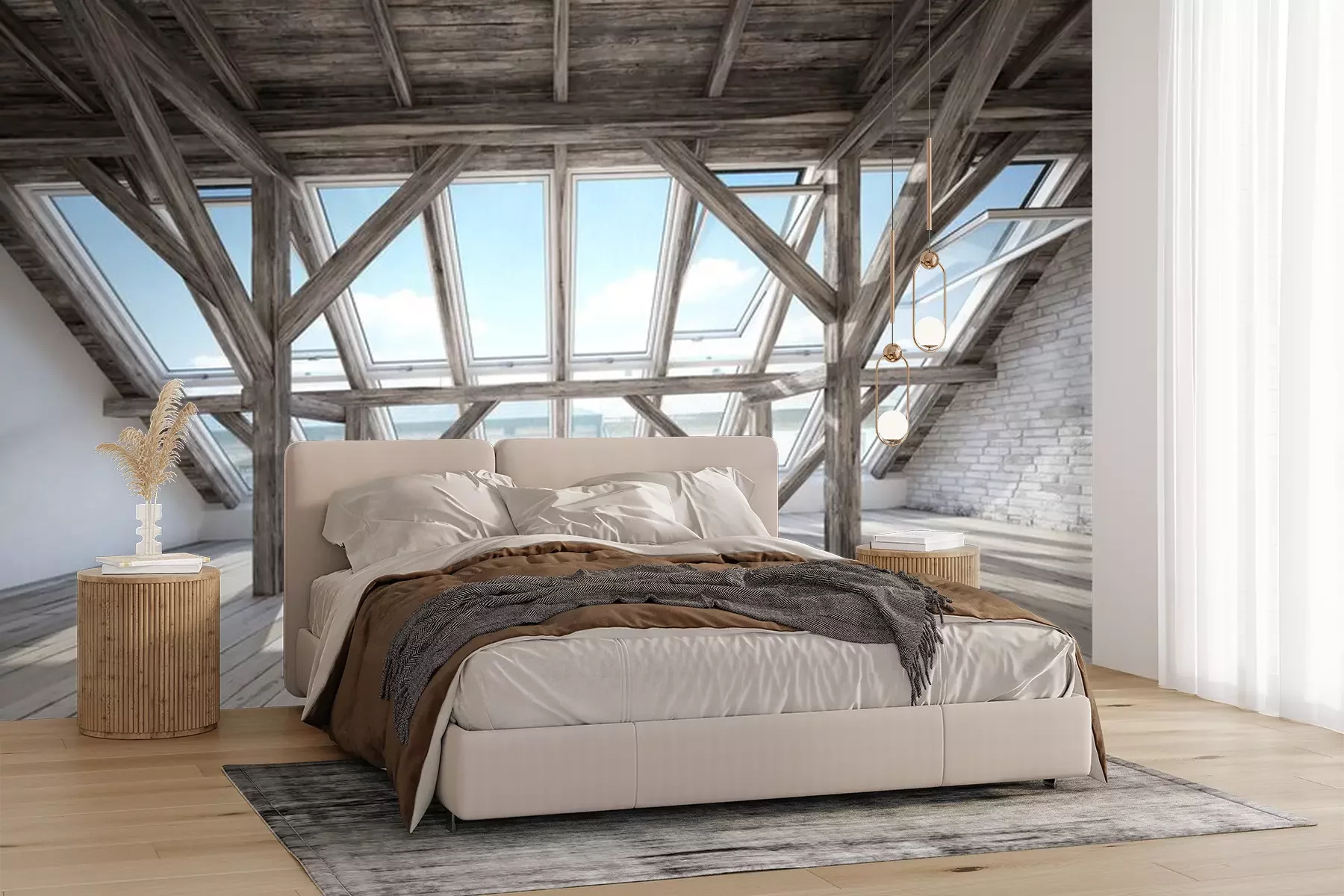 Fototapete Scandinavian attic interior with wooden beam roof construction and wooden floor