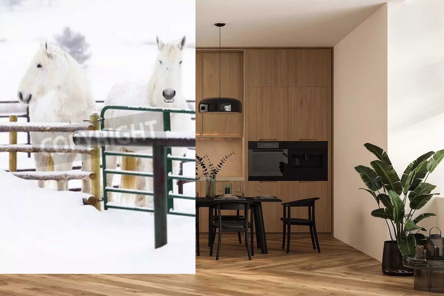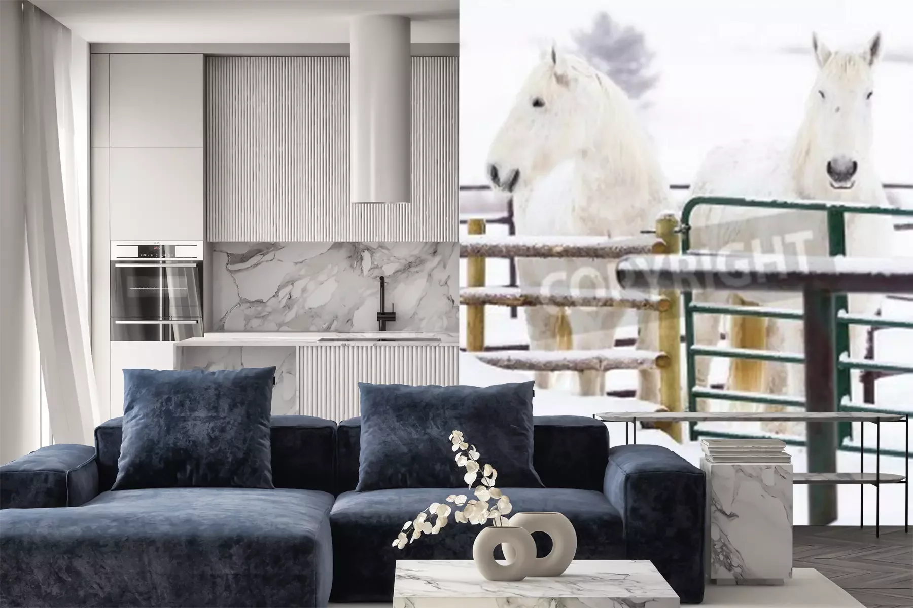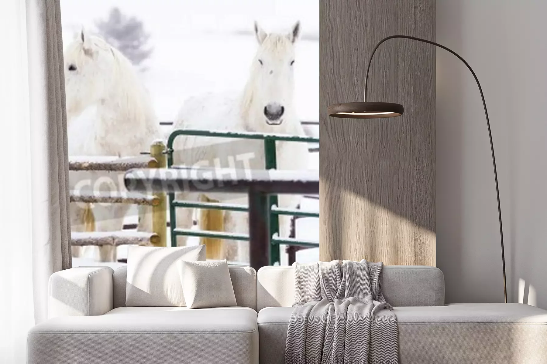 Fototapete Schneebedeckte pferde auf dem bauernhof