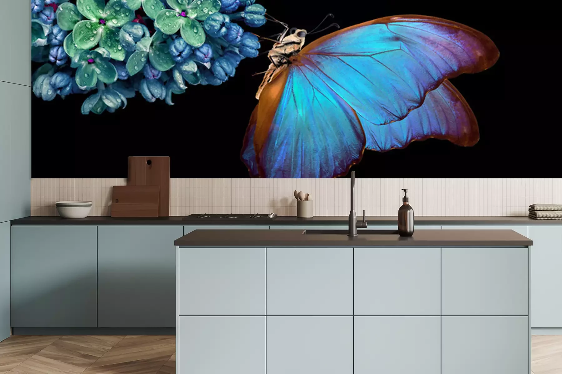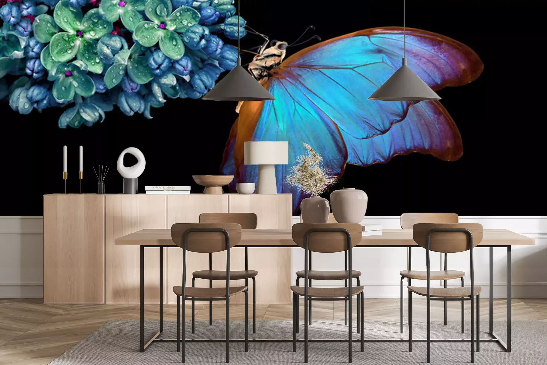 Fototapete Schöner blauer Morpho-Schmetterling sitzt auf einer Blume auf schwarzem Hintergrund