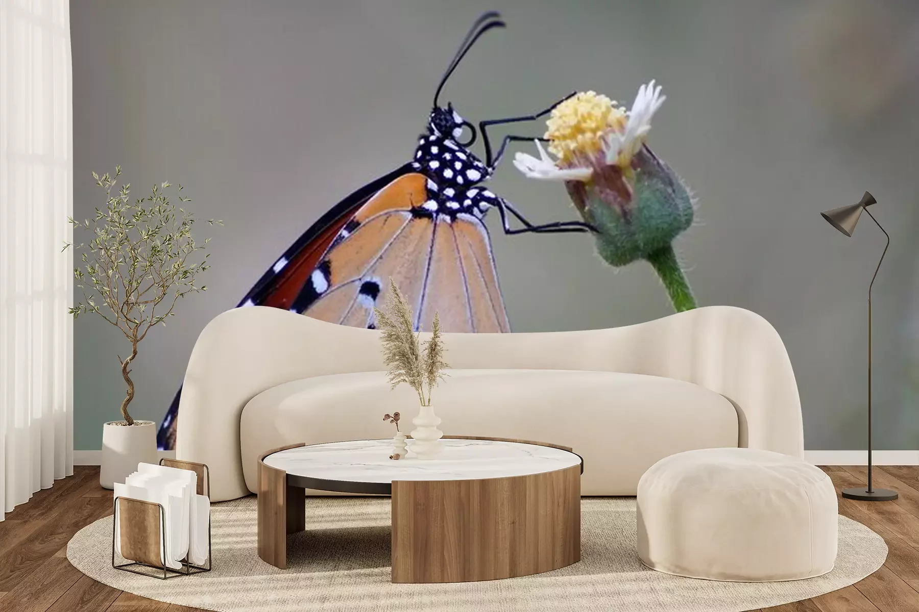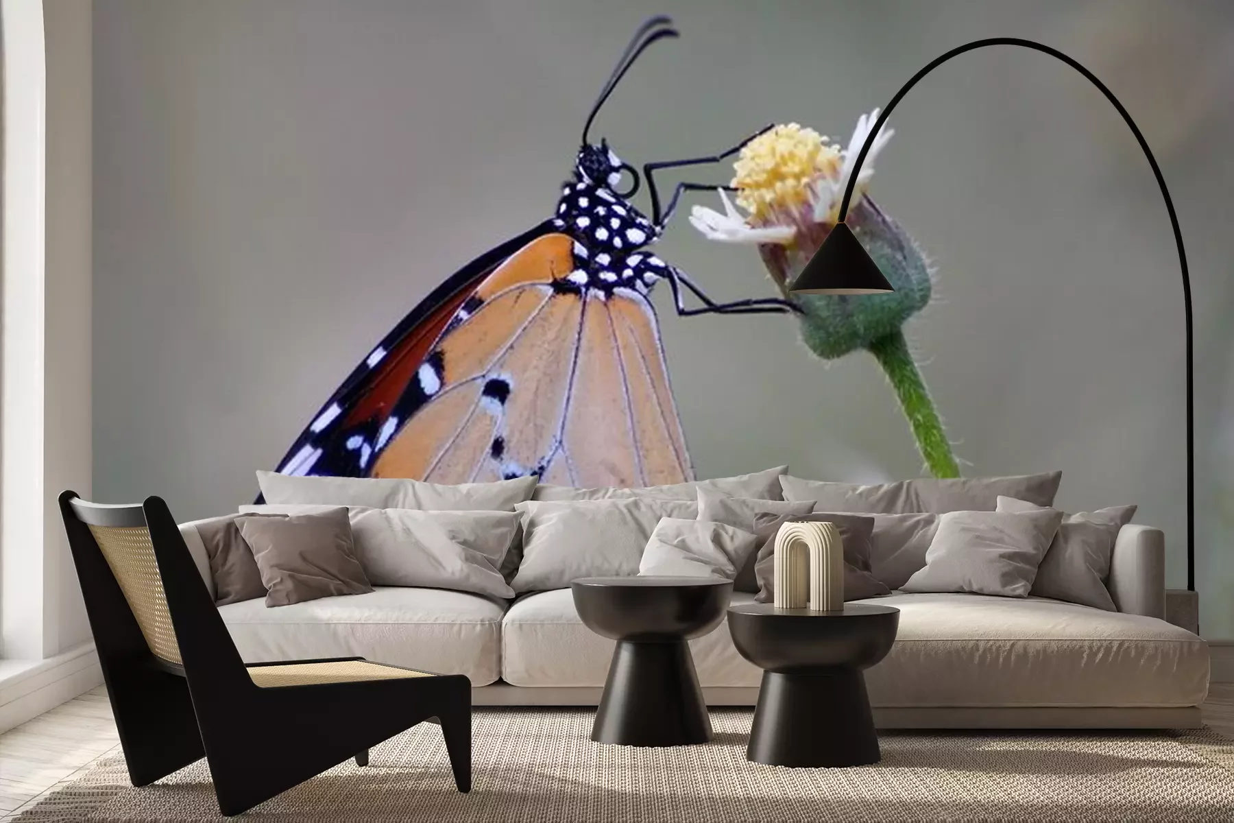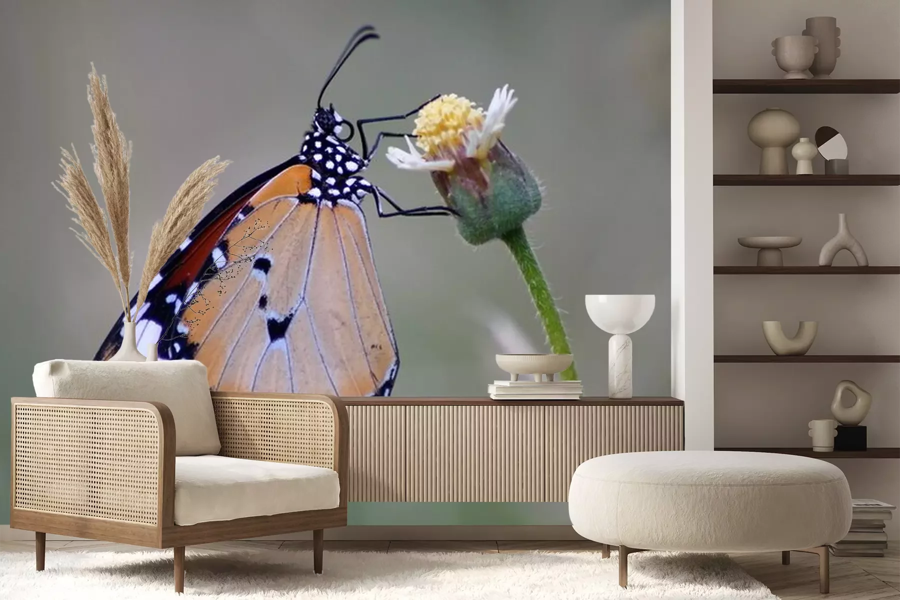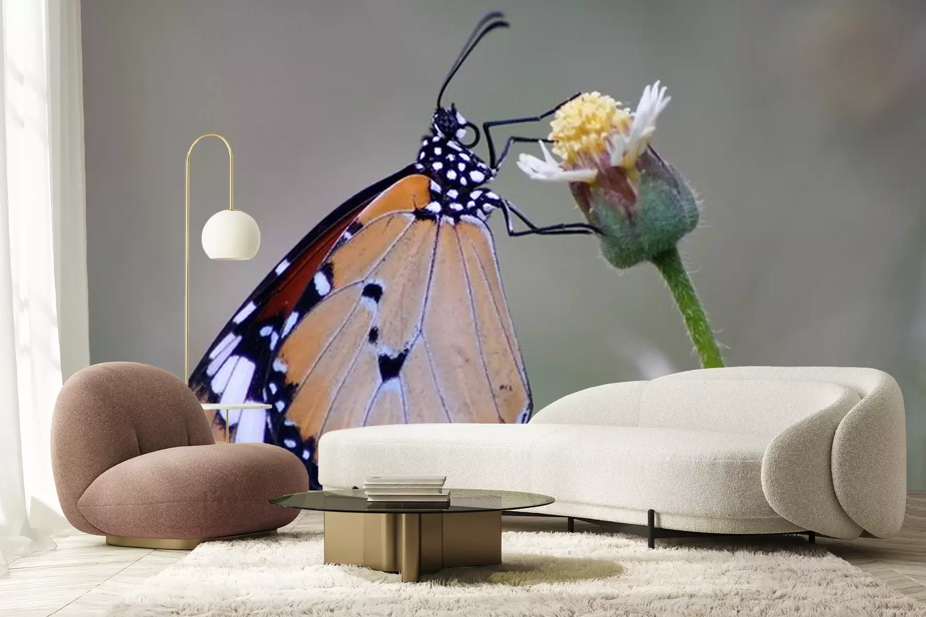 Fototapete Schöner Monarchfalter auf einer Blume mit unscharfem Hintergrund