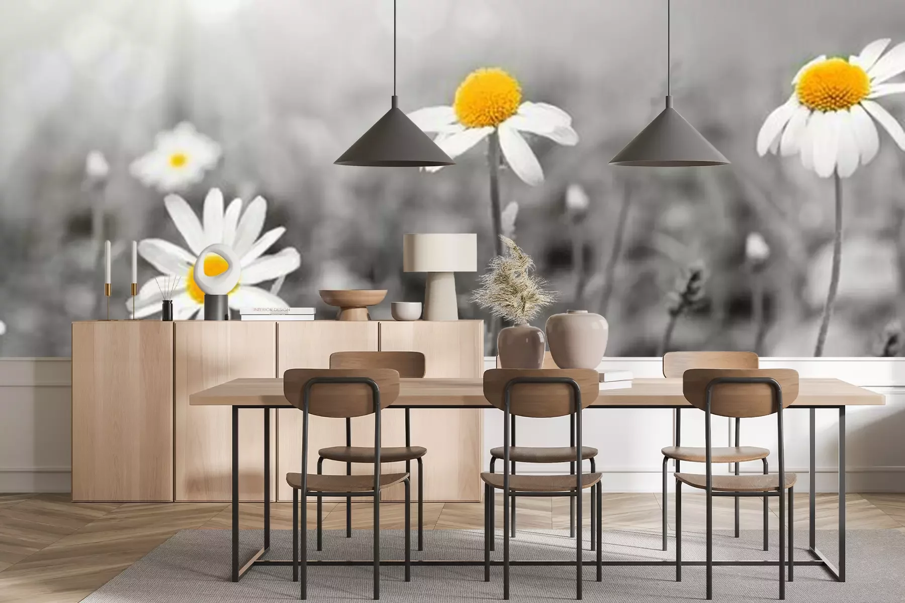 Fototapete Schwarz-Weiße Gänseblümchen mit gelbem Akzent