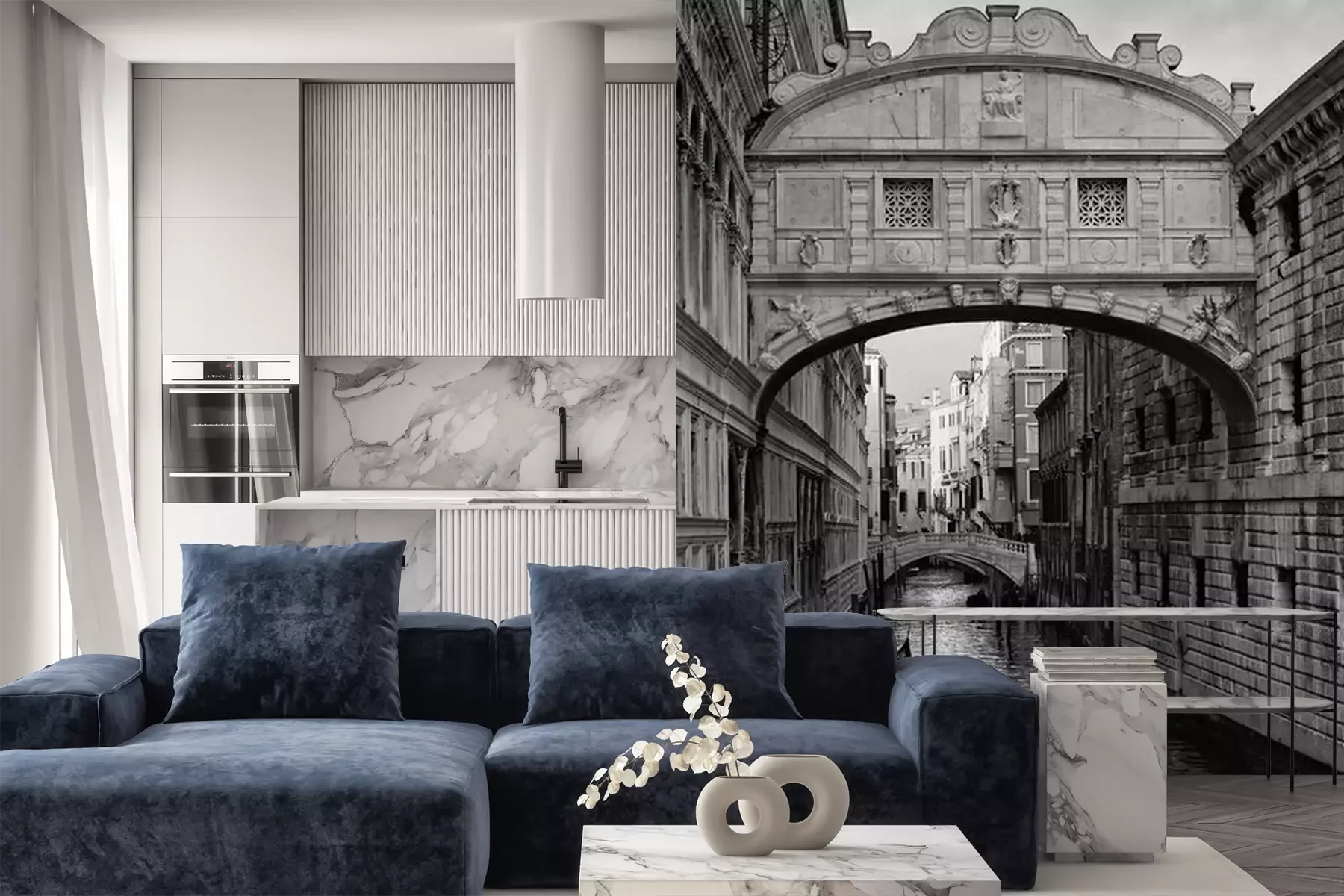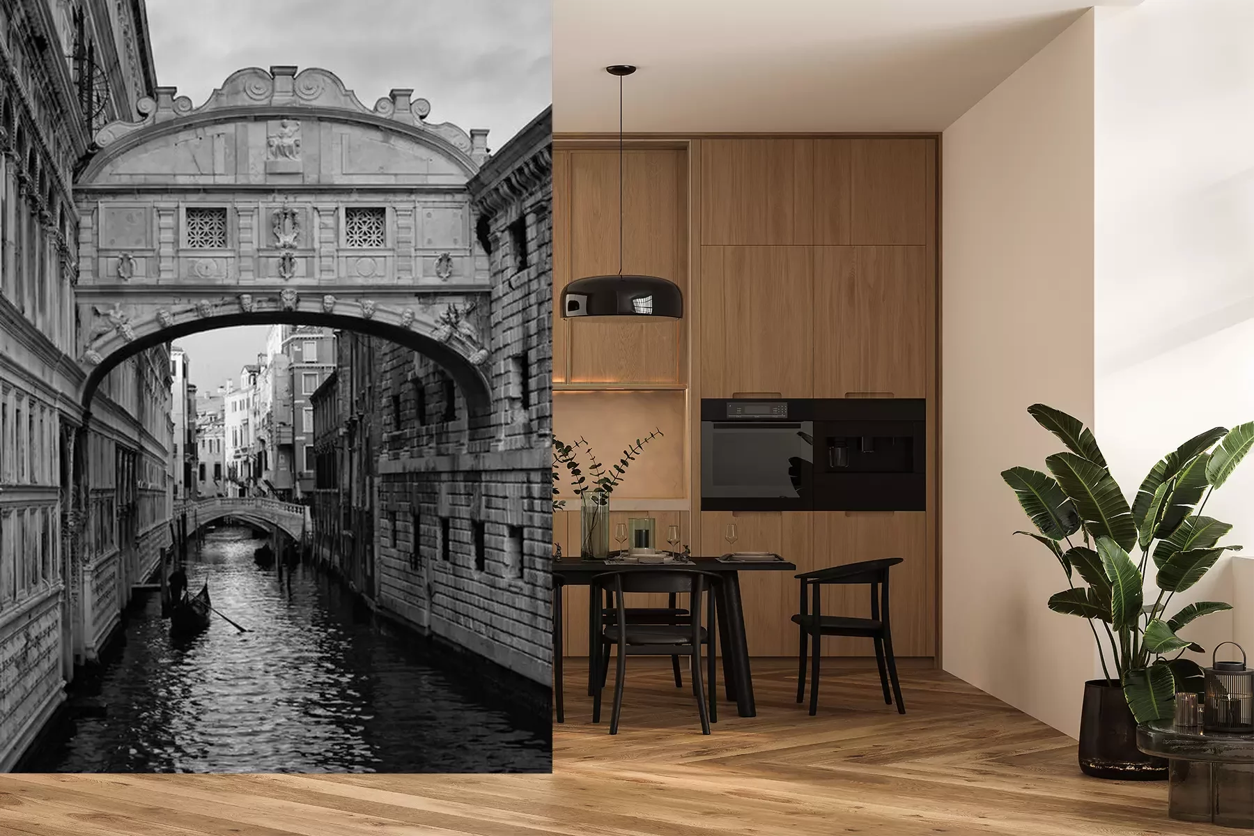Das Material Premium+ besteht aus einer strukturierten Vinyl-Oberschicht und einem Trägermaterial (Vlies) mit einer Grammatur von 255 g/m², das kleine Unebenheiten der Wand zuverlässig kaschiert. Die feine Sandstruktur verleiht der Oberfläche eine luxuriöse Haptik, während das halbmatte Finish die Tiefe der Farben betont. Das Material ist dampfdurchlässig – so kann diese Fototapete auch in Küchen und Badezimmern eingesetzt werden. Die maximale Breite einer Tapetenbahn beträgt 100 cm. Bei größeren Abmessungen besteht die Fototapete aus mehreren gleich großen Bahnen. Der Kleber wird direkt auf die Wand aufgetragen, und die Fototapete wird auf Stoß angebracht, was für einen ästhetischen Effekt ohne sichtbare Fugen sorgt. Die Oberfläche ist pflegeleicht und kann bei Bedarf sanft mit einem feuchten Tuch abgewischt werden.